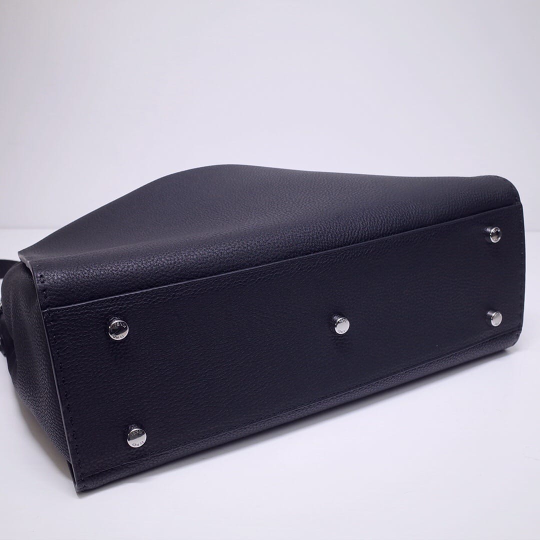 FD家】经典爆款手提包,以硬隔板分成两个隔层。拉链内袋与高科技设备收纳空间。前钩扣固定。公文包把与可调式、可拆卸肩带。黑色罗马皮革制成。金色BAG BUGS眼镜金属图案与侧边固定配件。尺寸:38*16*33。