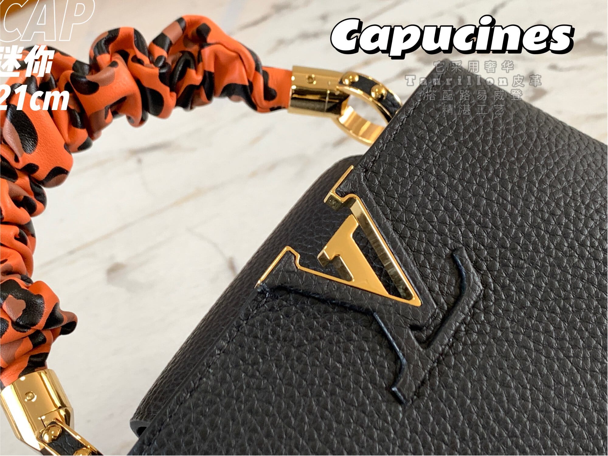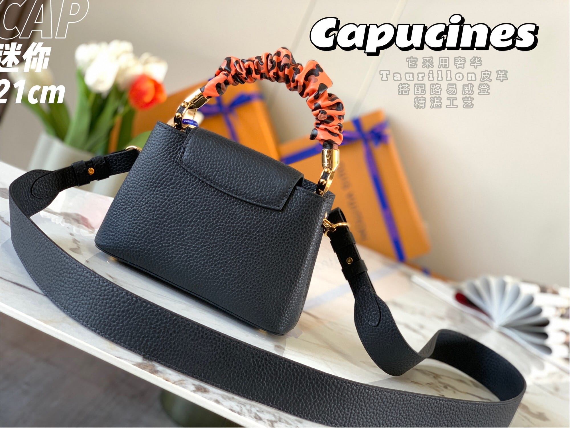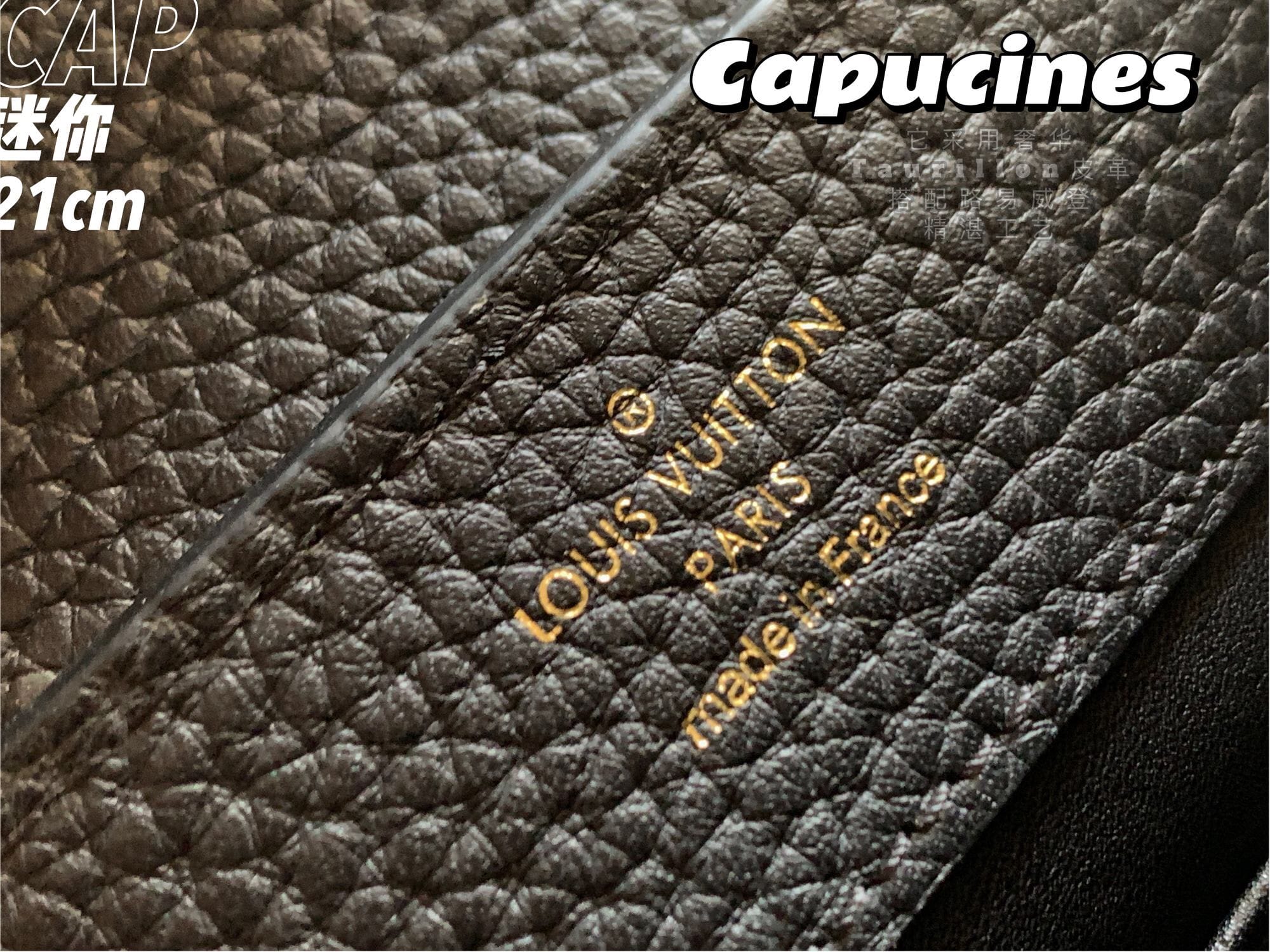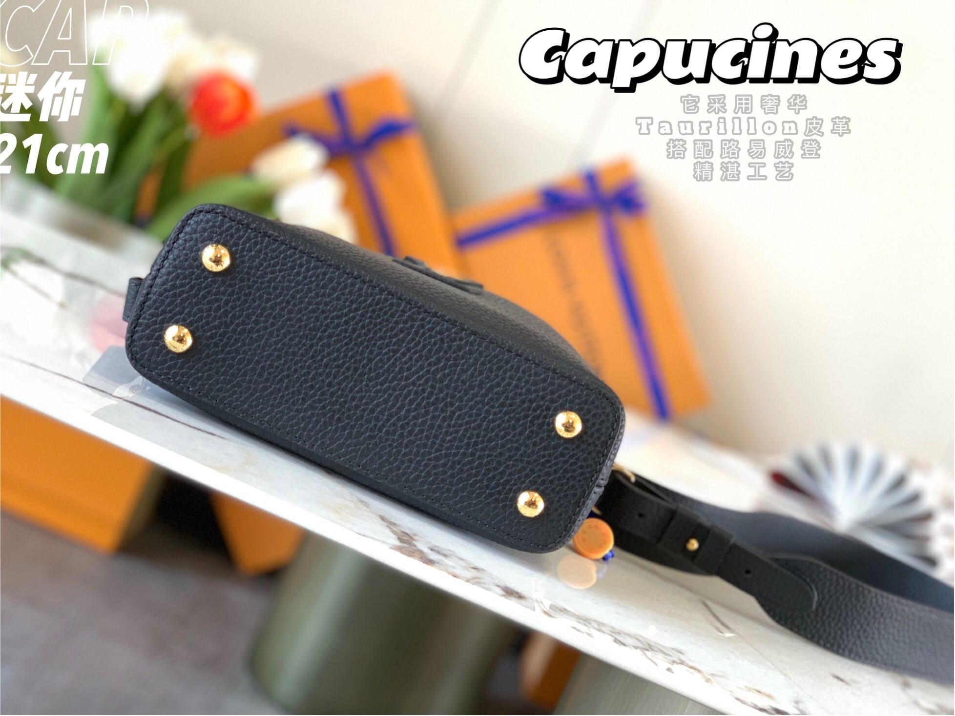 特级精品原厂皮?M58586牛仔蓝】 本款 Capucines 迷你手袋采用 Taurillon 皮革塑造玲珑构型,以 Taurillon 皮革和小牛皮描摹饰边,再将标志性顶部手柄藏于柔软皮革抽褶。巧用可拆卸宽肩带,肩背斜挎随心切换。 详细尺寸:21 x 14 x 8 厘米 (长度 x 高 x 宽)