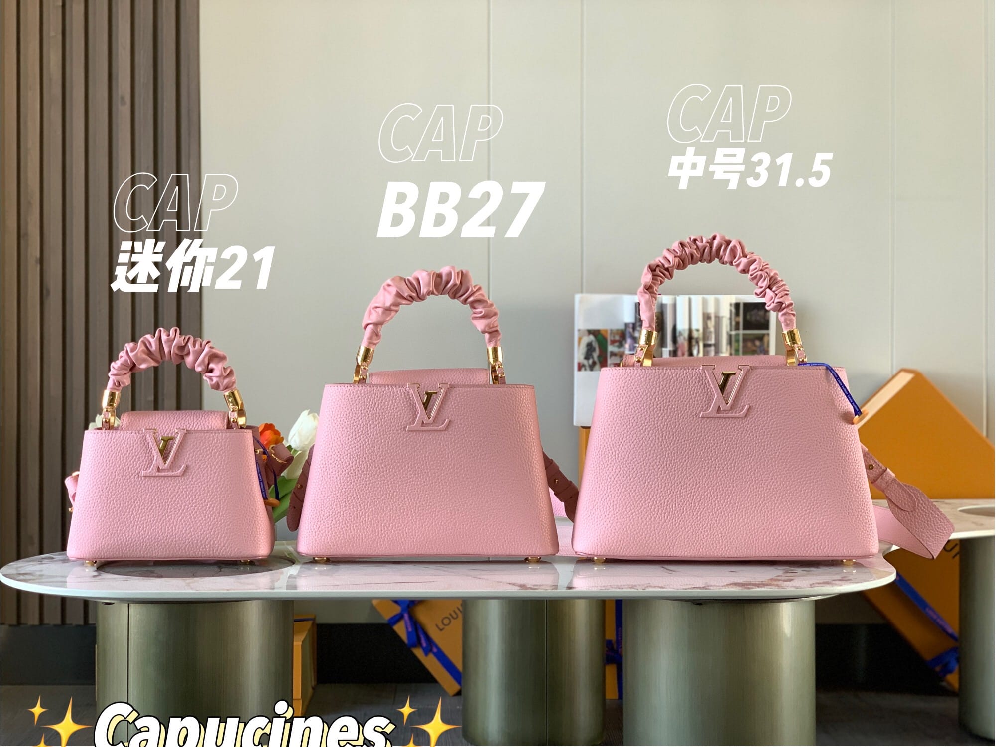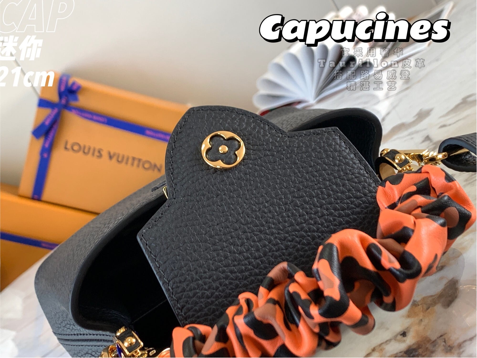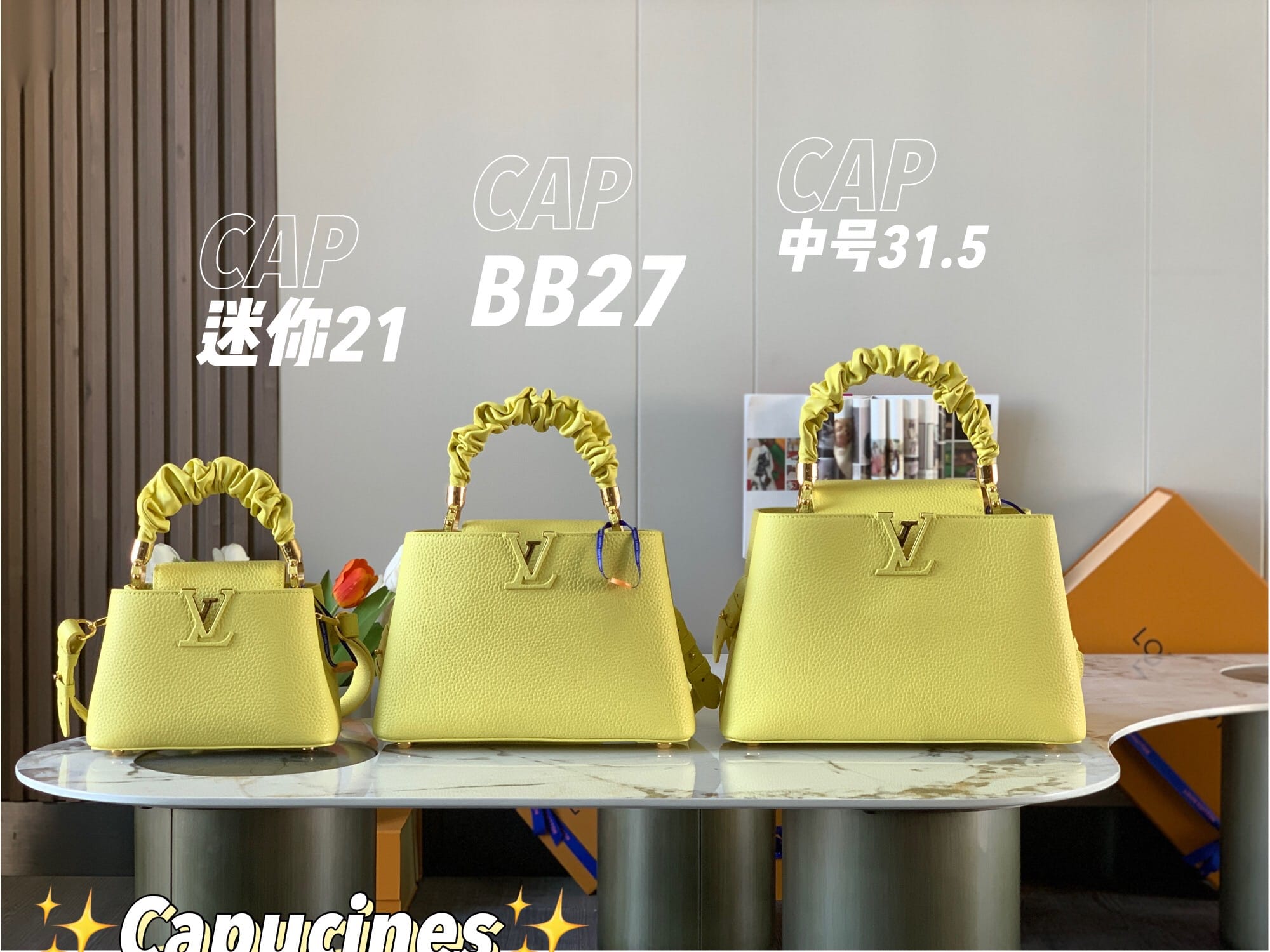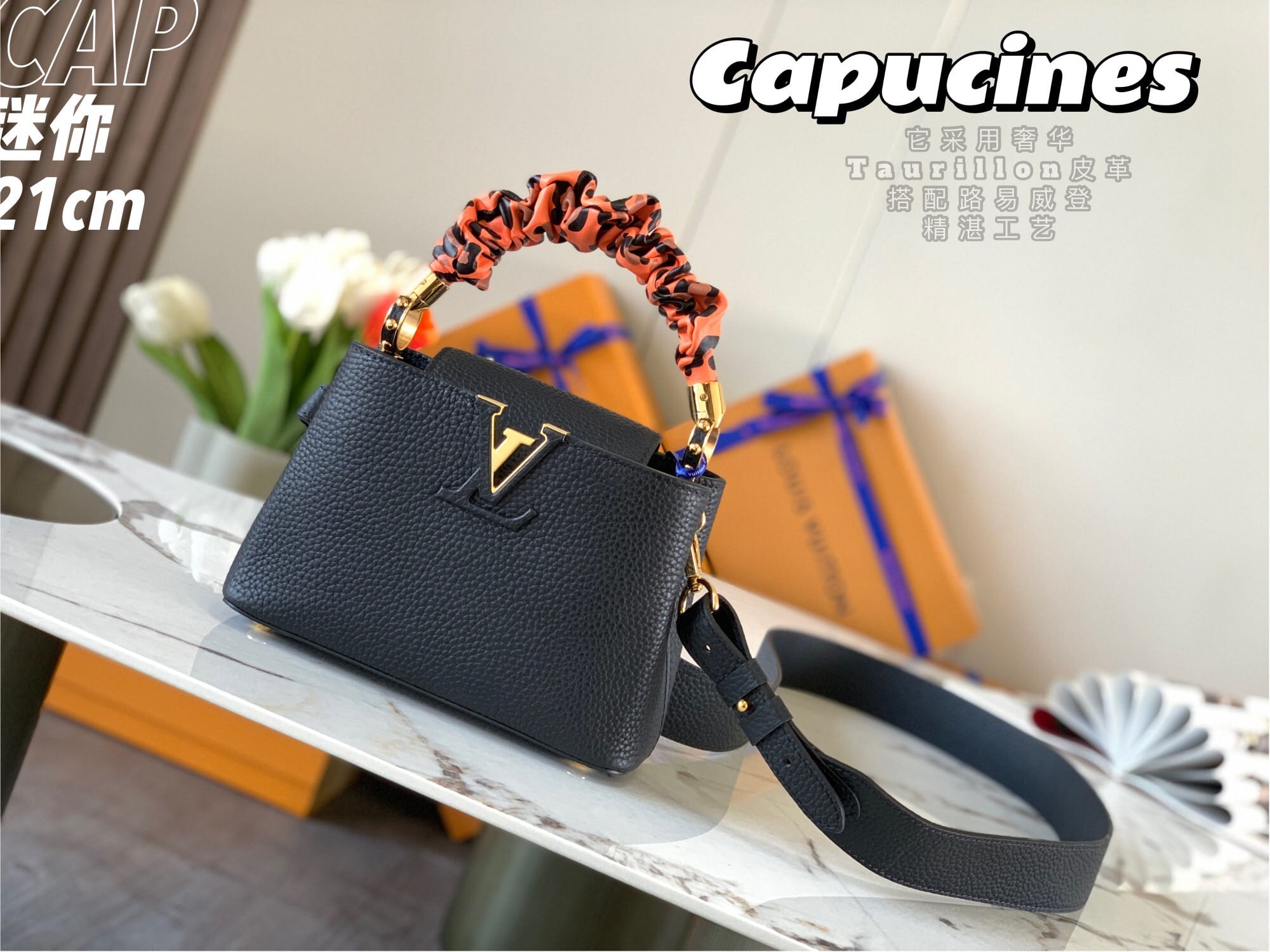 特级精品原厂皮?M58586牛仔蓝】 本款 Capucines 迷你手袋采用 Taurillon 皮革塑造玲珑构型,以 Taurillon 皮革和小牛皮描摹饰边,再将标志性顶部手柄藏于柔软皮革抽褶。巧用可拆卸宽肩带,肩背斜挎随心切换。 详细尺寸:21 x 14 x 8 厘米 (长度 x 高 x 宽)