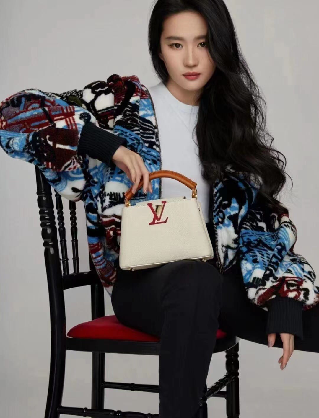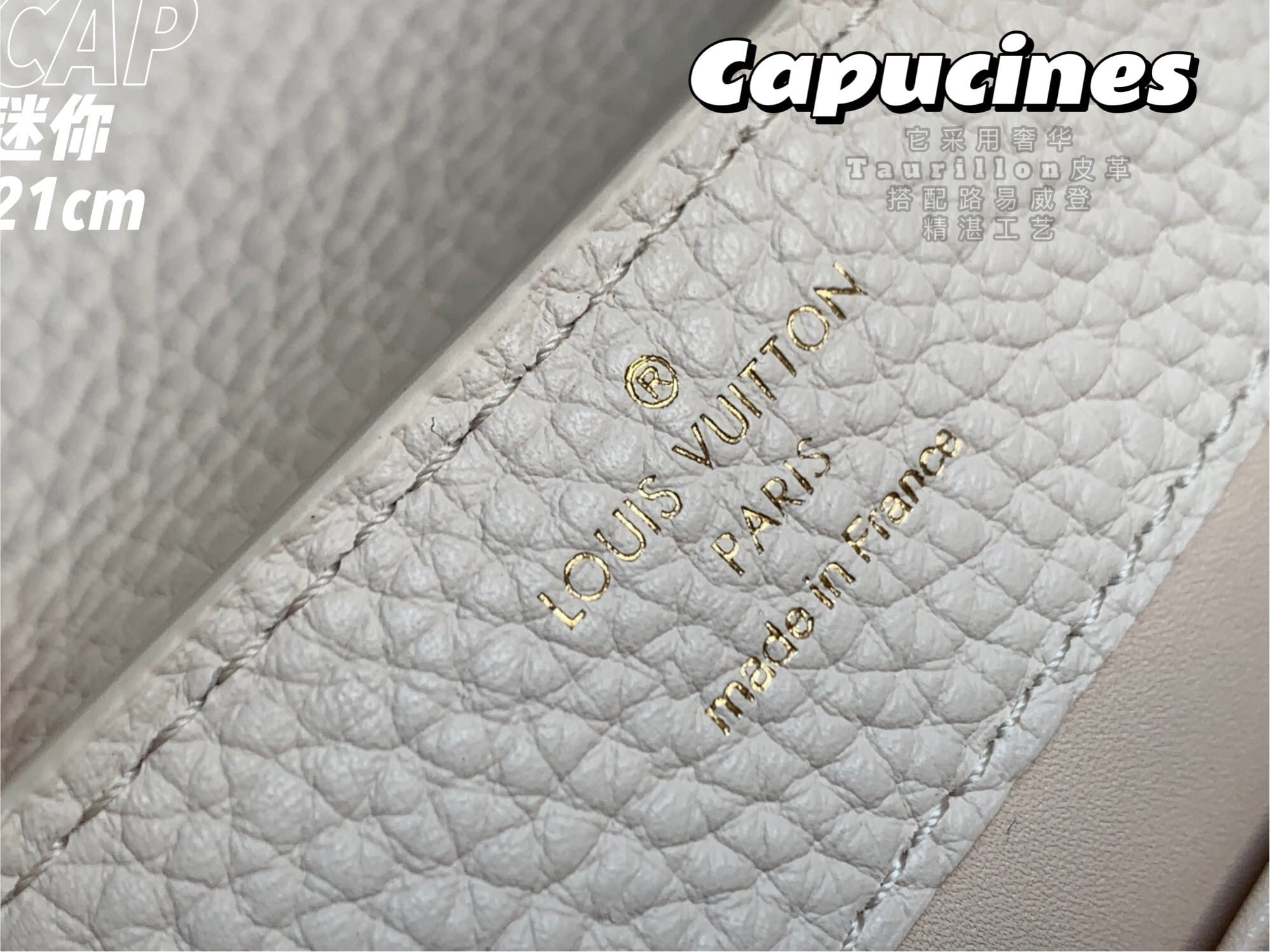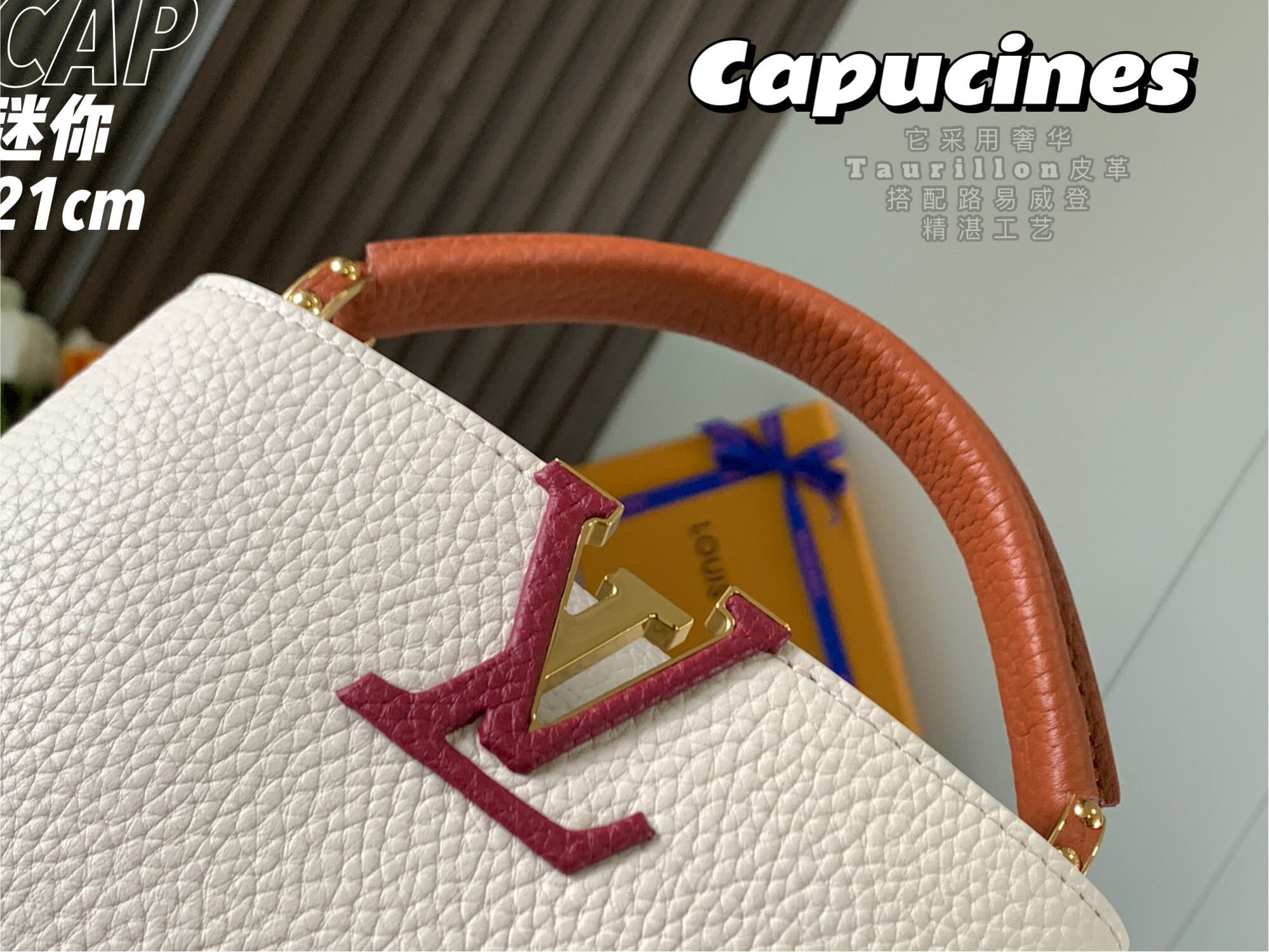 特级精品原厂皮?M59253珍珠白配浅土黄】 本款 Capucines 迷你手袋选用粒面 Taurillon 牛皮革,令包身和顶部手柄及翻盖上演色块意趣。LV 字母丰富视觉层次,可拆卸宽幅肩带实现舒适肩背。 详细尺寸:21 x 14 x 8 厘米 (长度 x 高 x 宽)
