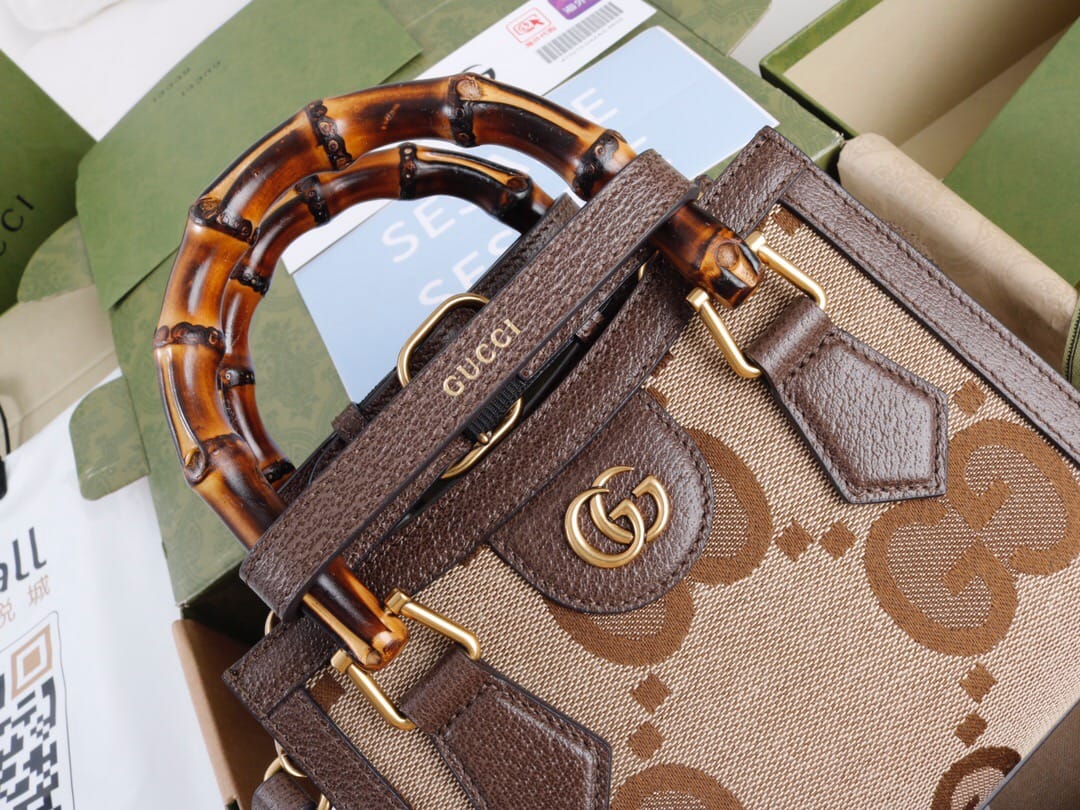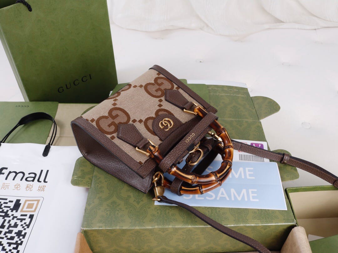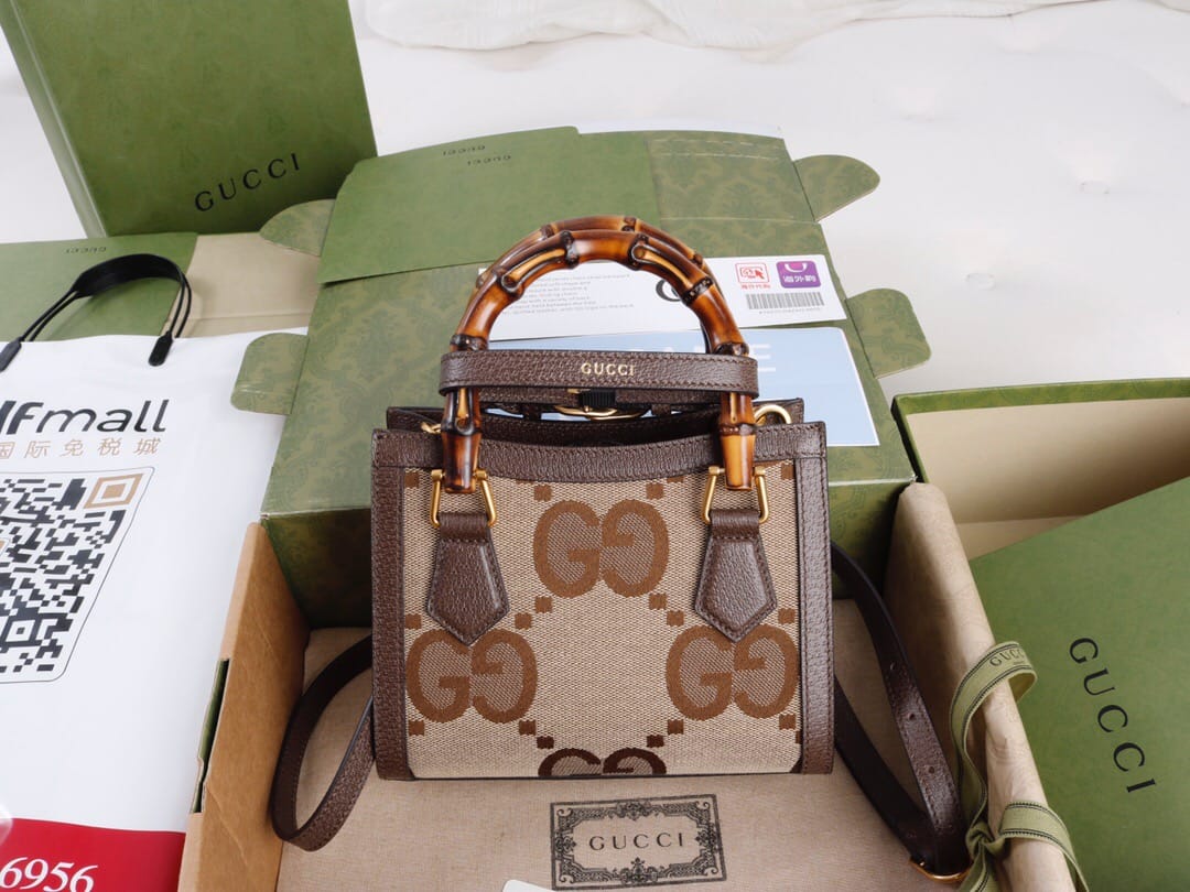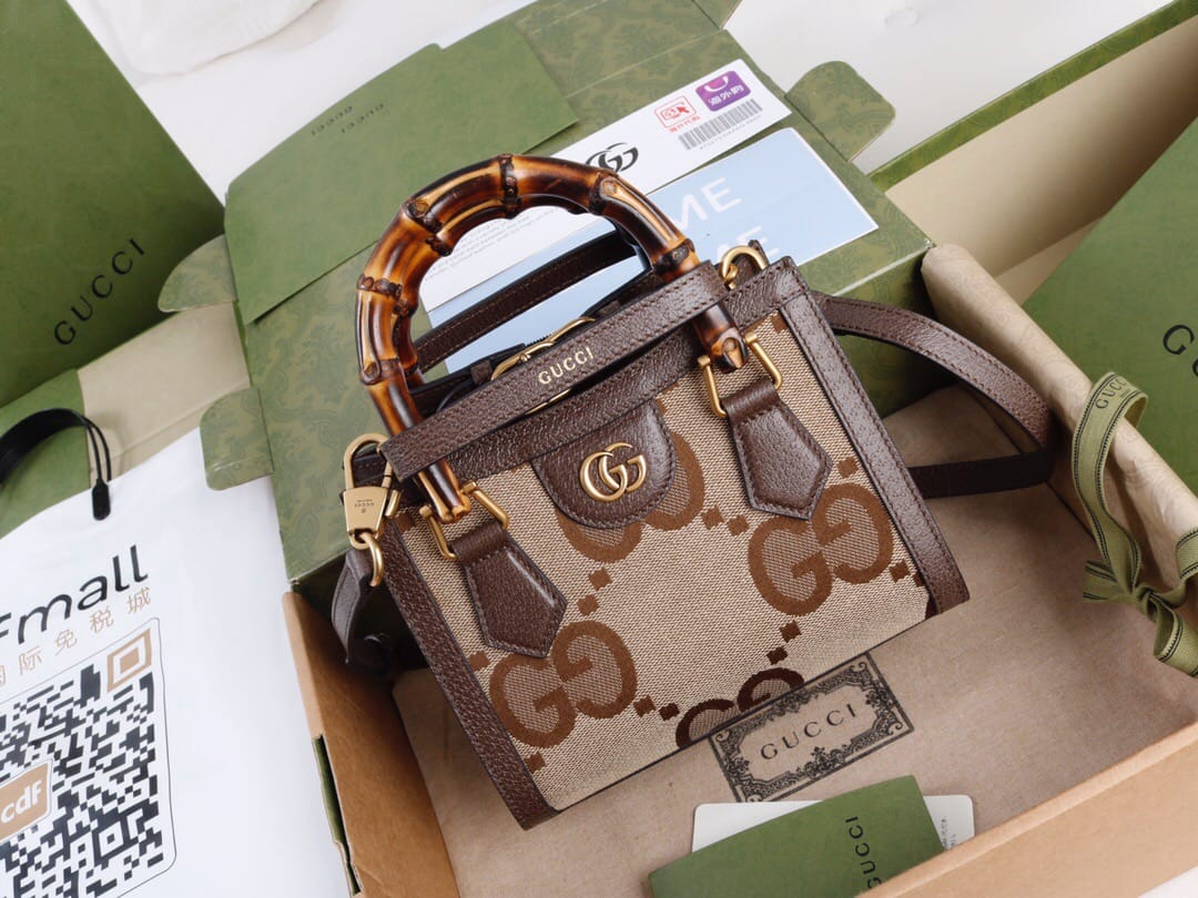 少量现货中?】 简介:每个系列运用现代视角重新推陈出新,以持续不断的改变及实验诠释品牌标识。这款双G图案以有别于以往的夸张手法呈现经典双G字母交织图案,在《Aria-时尚咏叹调》系列中生动演绎多款成衣和配饰单品。这款 Diana竹节迷你托特包配有棕色皮革滚边。 ?型号?655661 ?材质?采用专柜质感帆布面料配进口牛皮,对版打磨五金?纹路清晰易见、质感细腻最高品质! ?尺寸?20x16x10cm