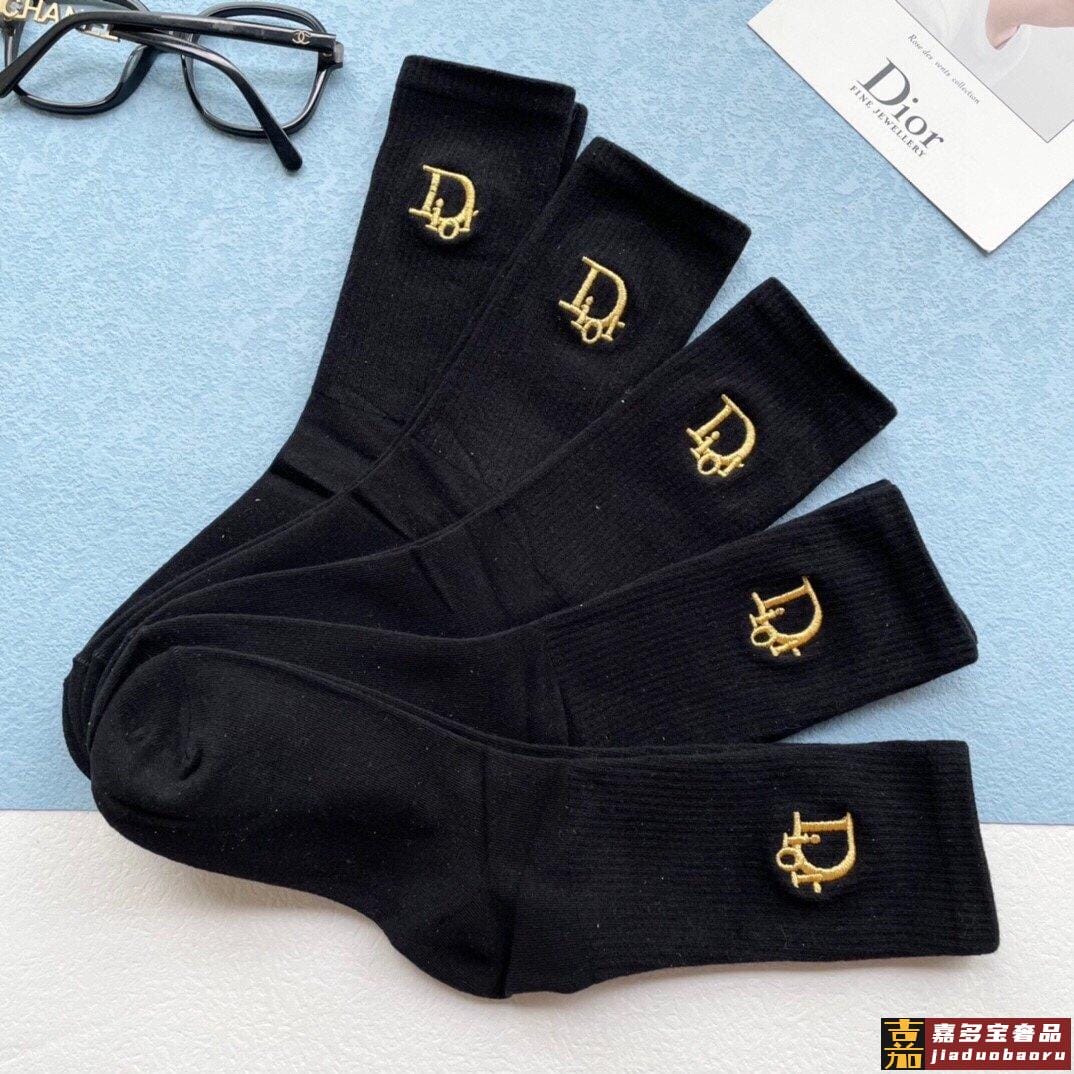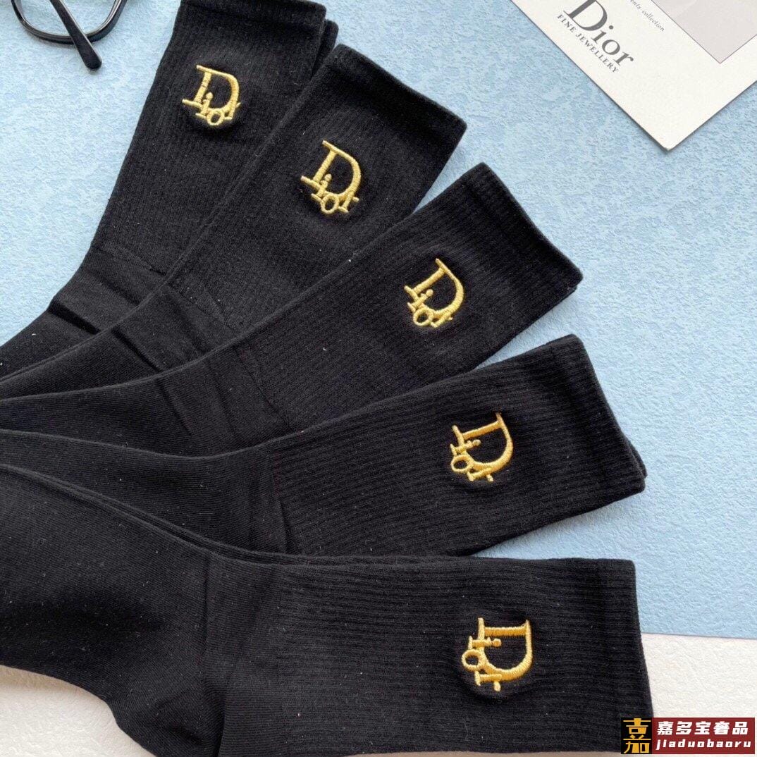 配包装一盒五双迪奥新款刺绣中长款袜子罗口刺绣品牌简称字母装饰