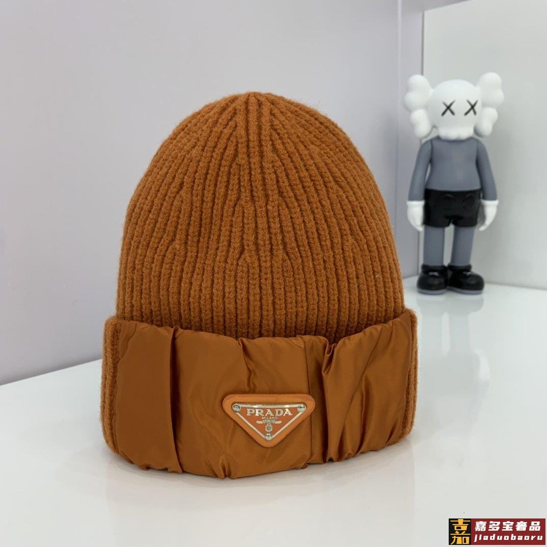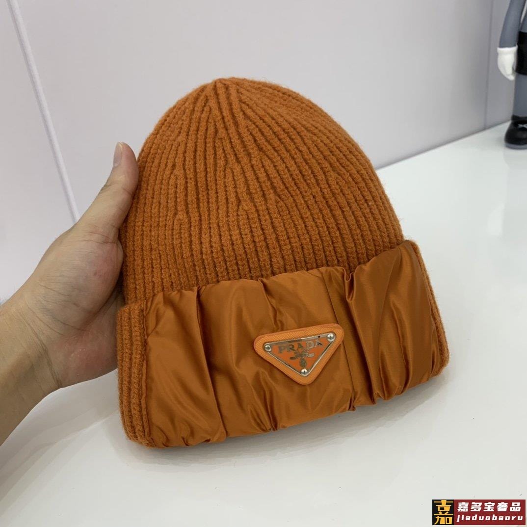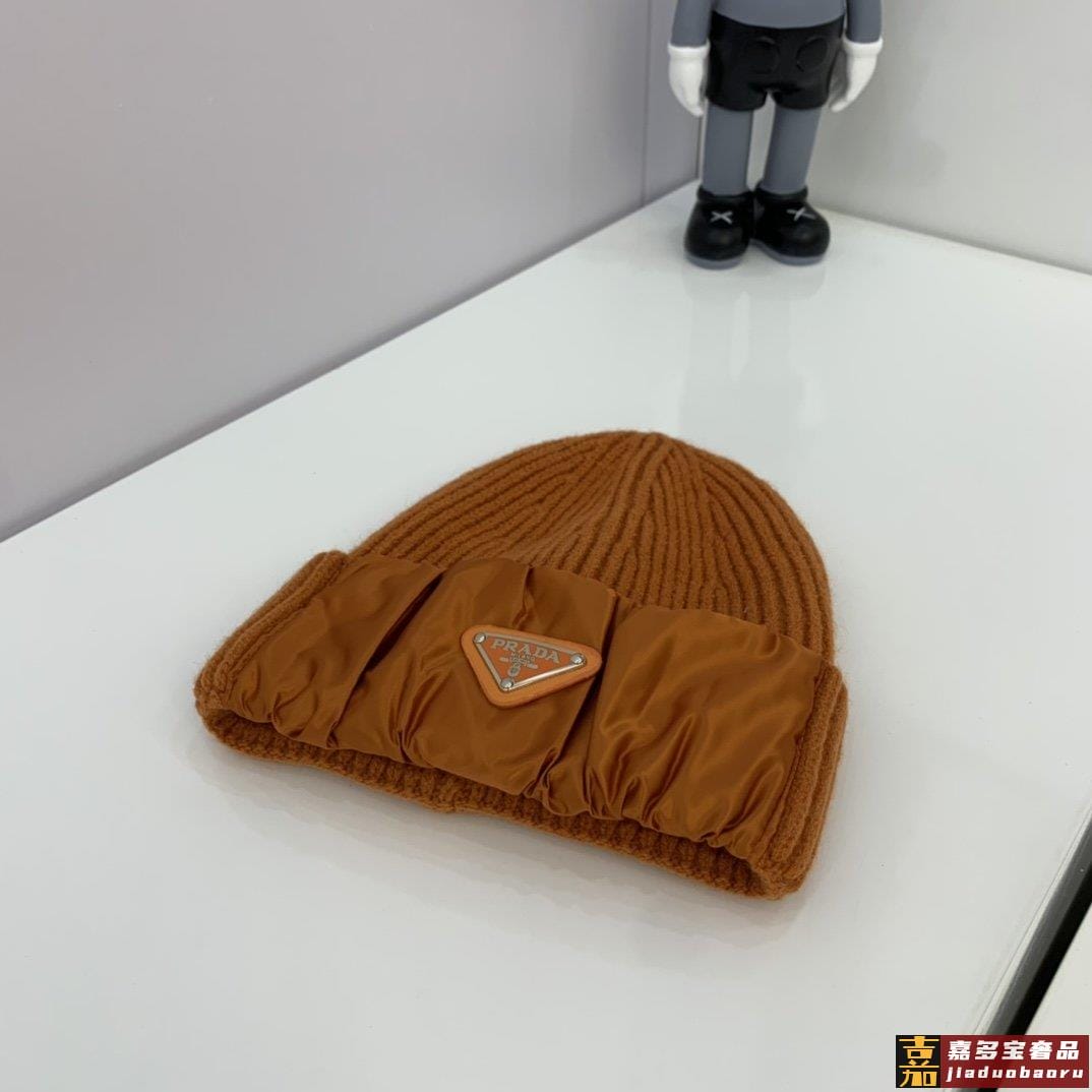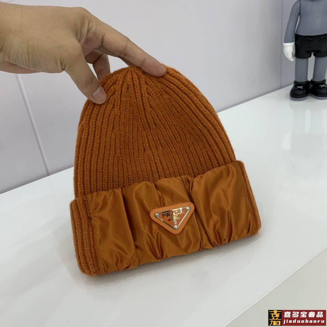 普拉达新款北极绒拼接缎面针织毛线帽专柜同步针织帽缎面拼接超显