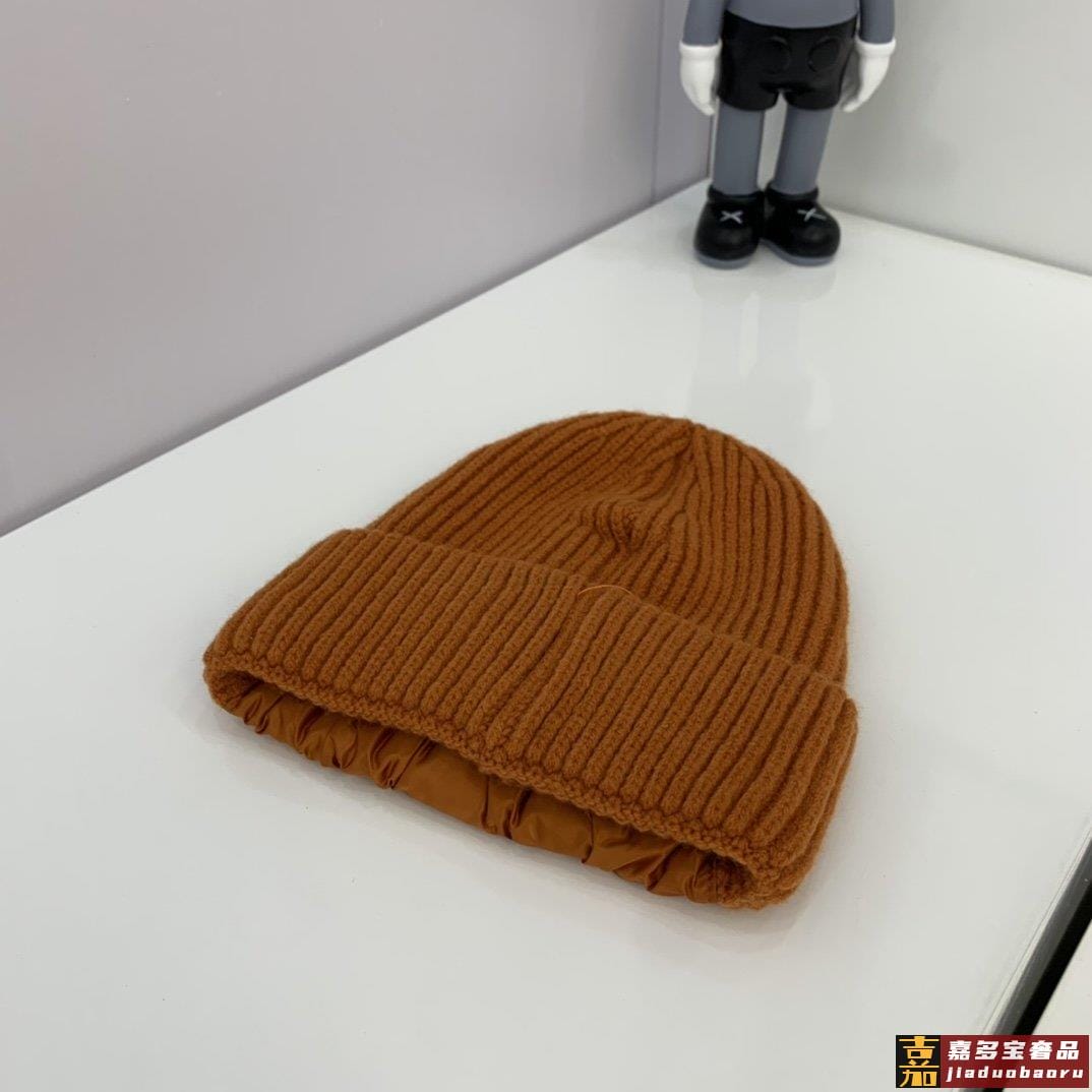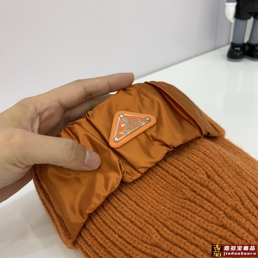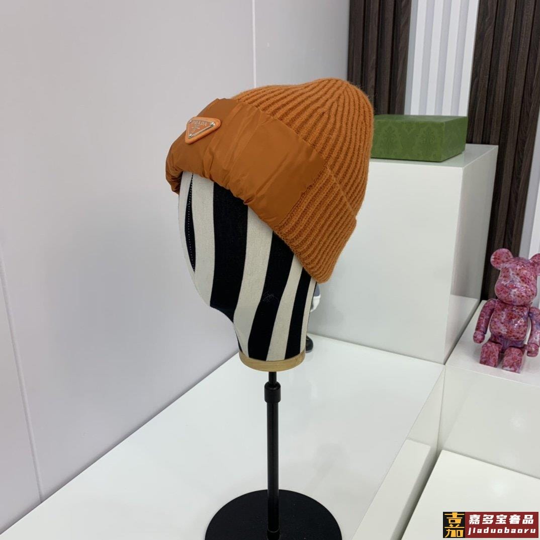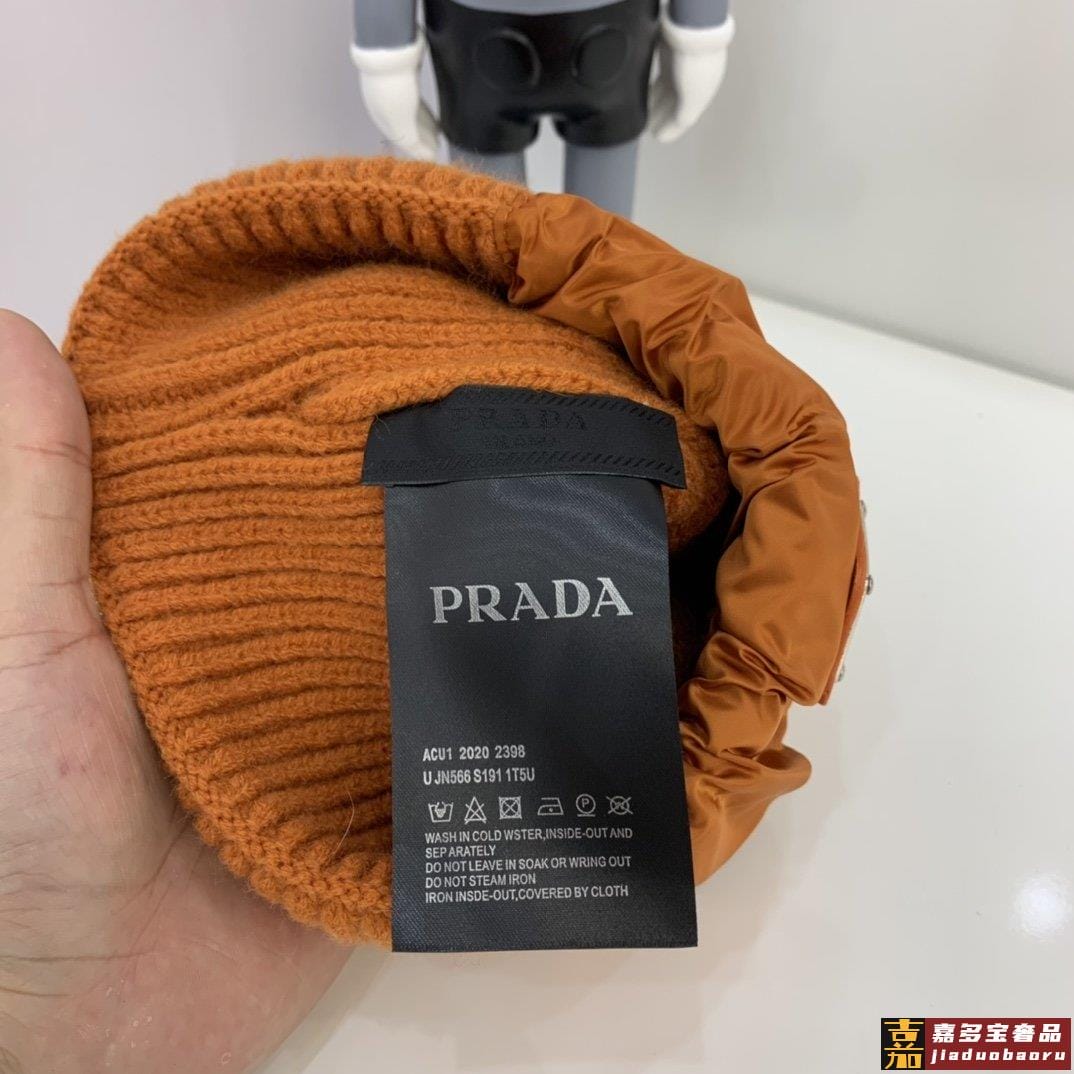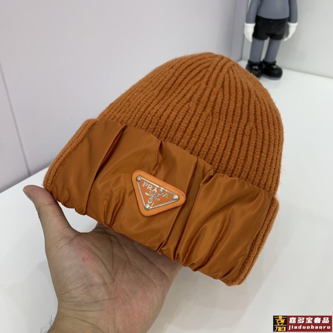 普拉达新款北极绒拼接缎面针织毛线帽专柜同步针织帽缎面拼接超显