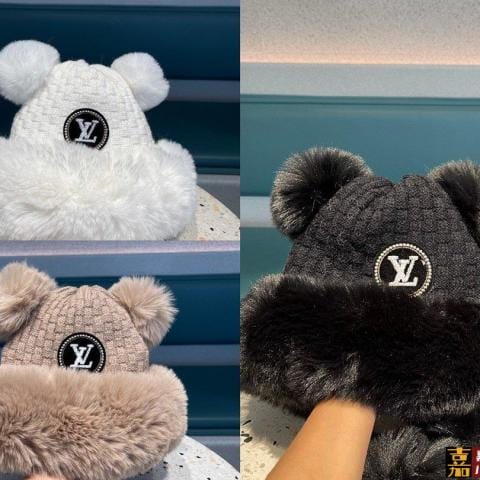 路易威登韩版秋冬季女士新款毛球套头帽护耳加绒加厚毛毛针织保暖