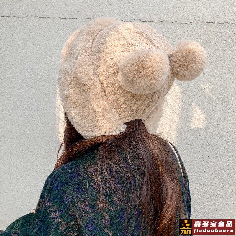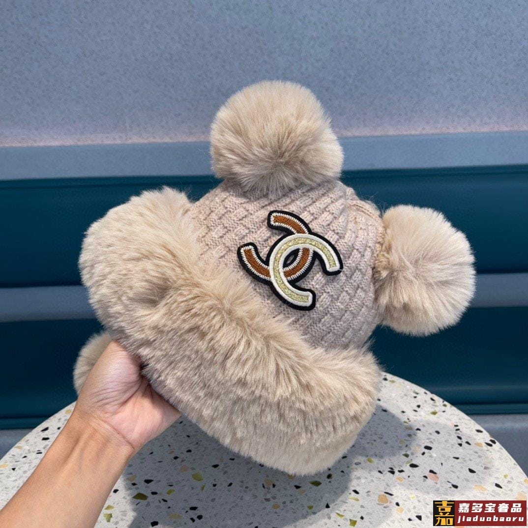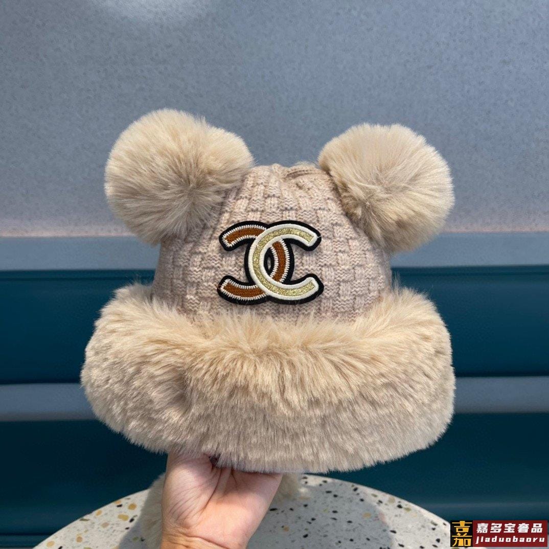 香奈儿毛球针织帽冬季帽子年新款女加绒保暖毛线护耳帽