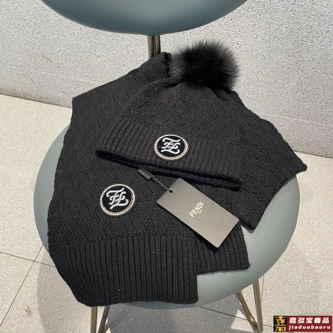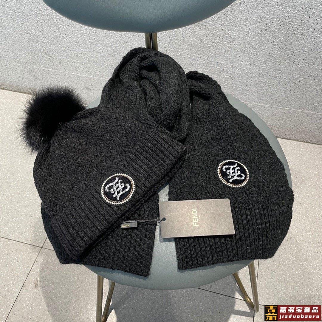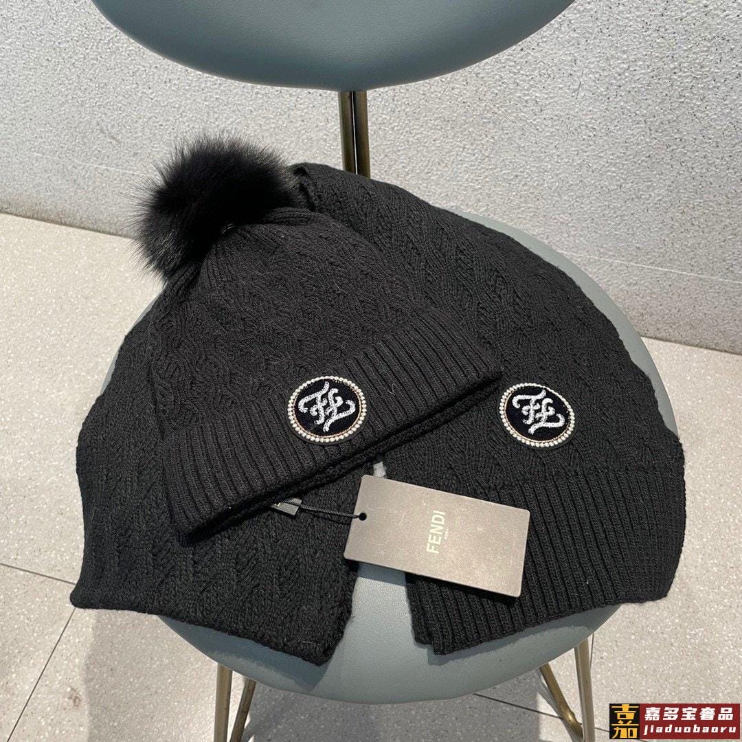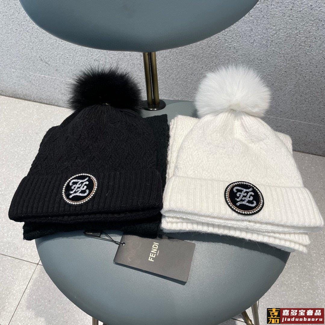 芬迪套装羊绒针织帽子围巾套装新款羊绒羊毛色狐狸毛球真毛球时尚