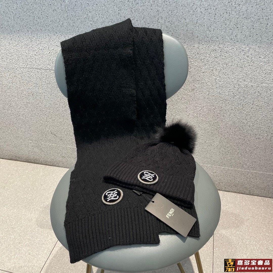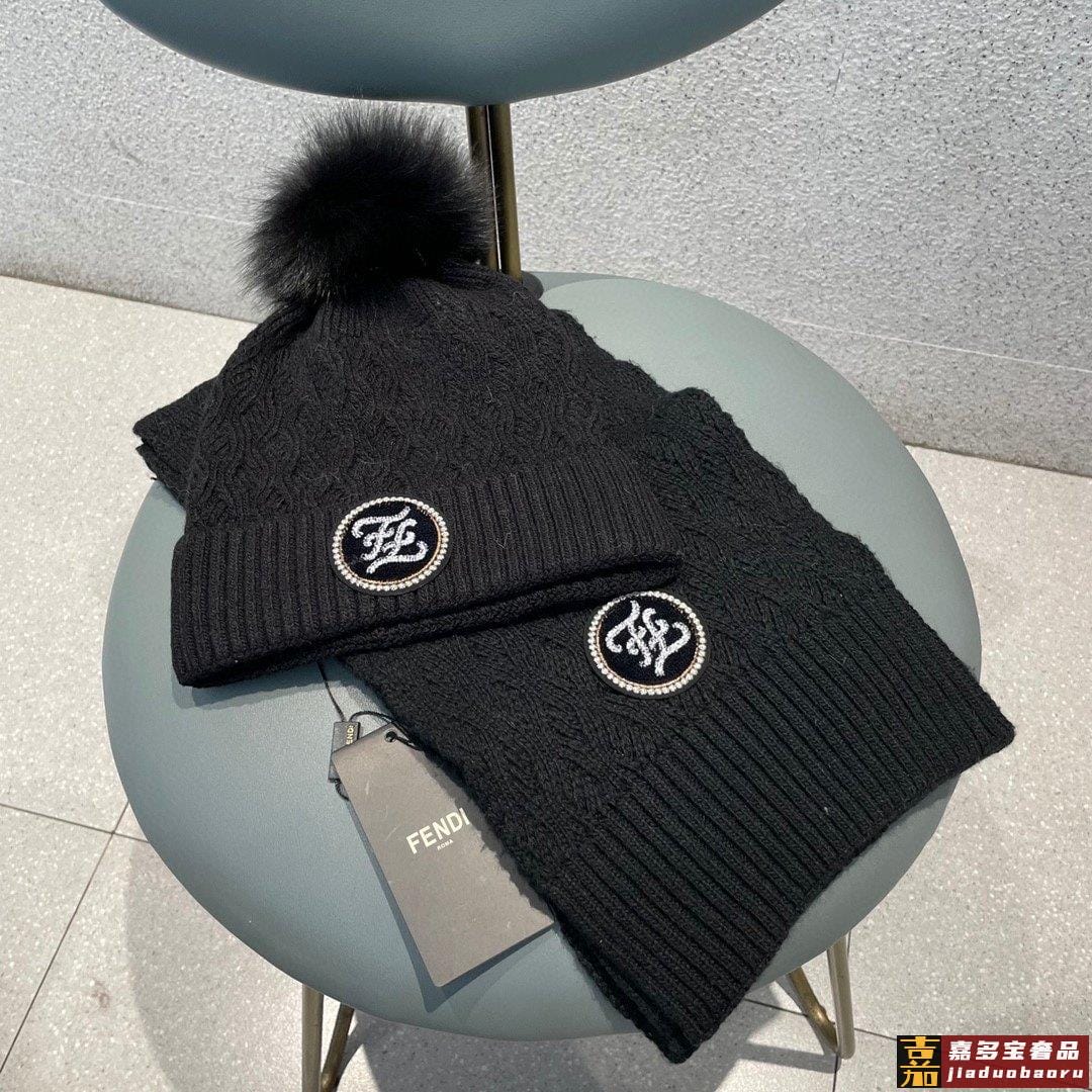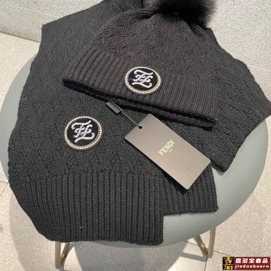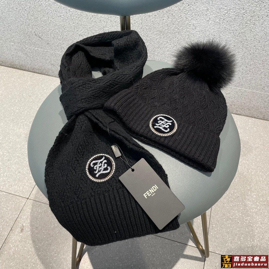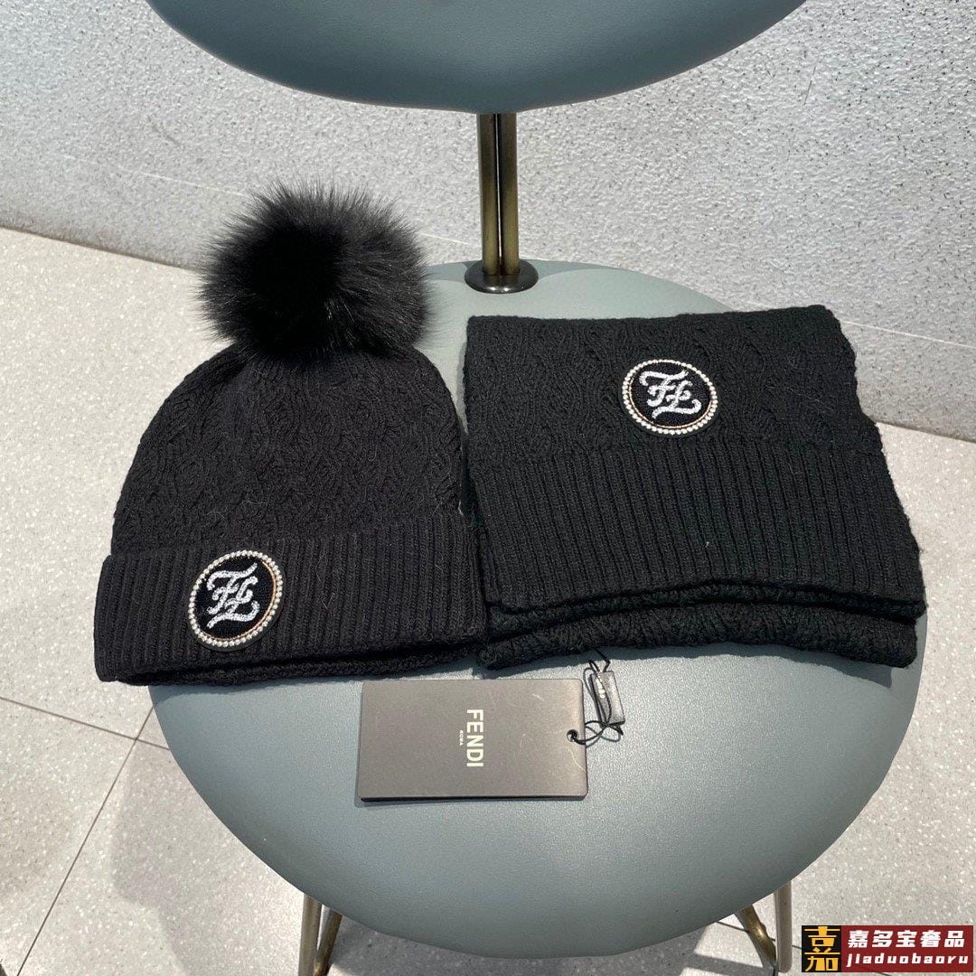 芬迪套装羊绒针织帽子围巾套装新款羊绒羊毛色狐狸毛球真毛球时尚
