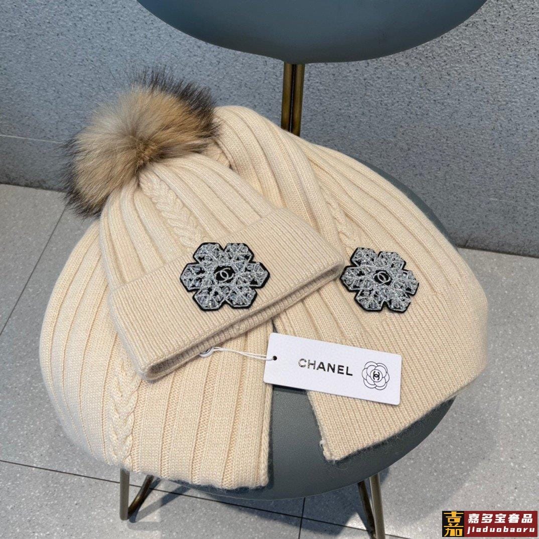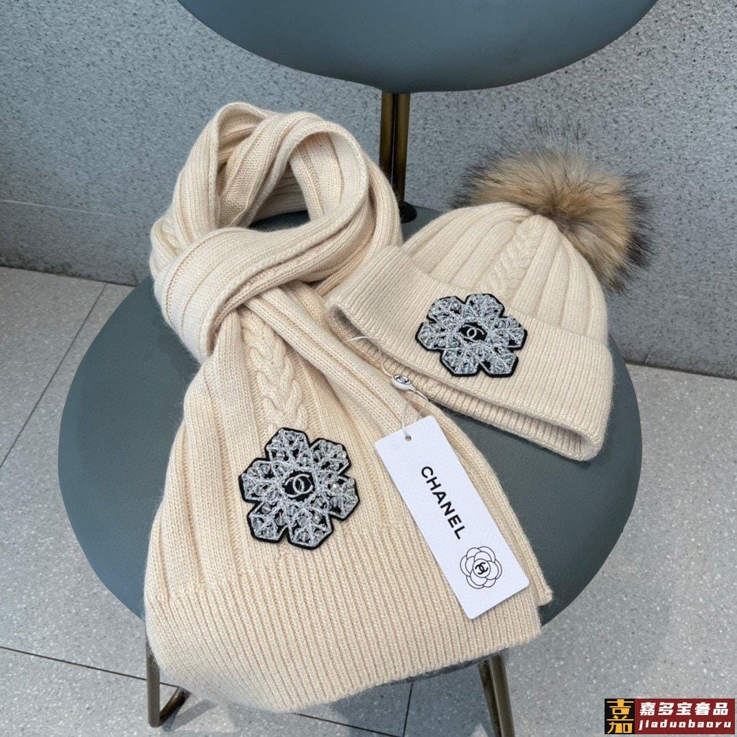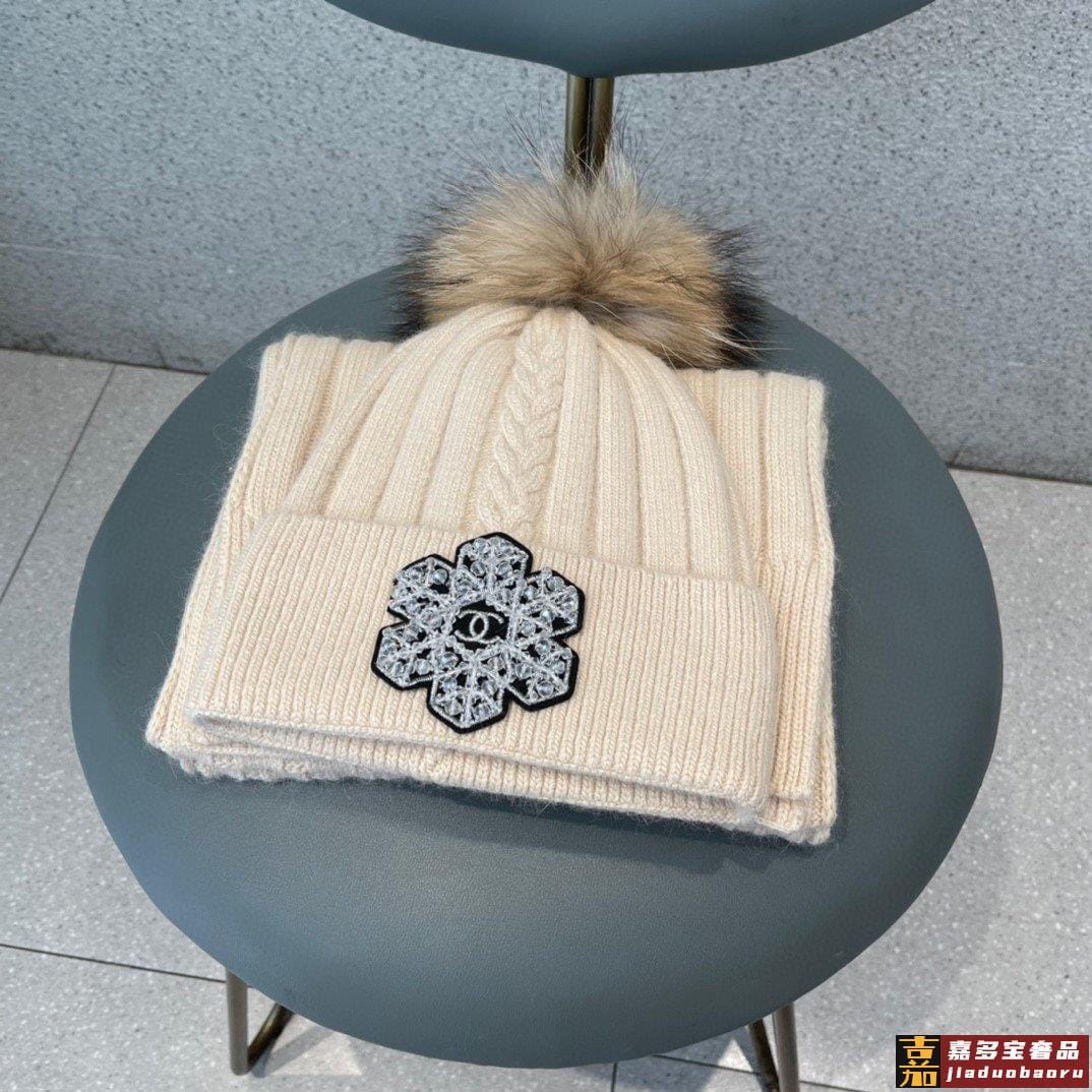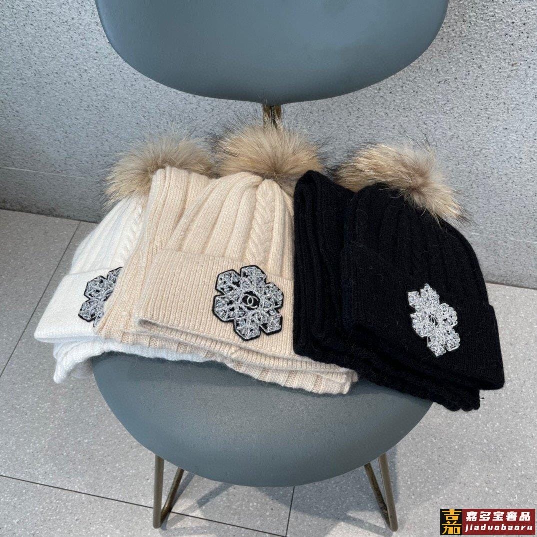 香奈儿秋冬专柜款针织毛线帽围巾两件套装搭配貉子毛球专柜款时尚