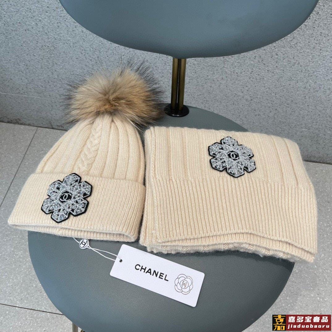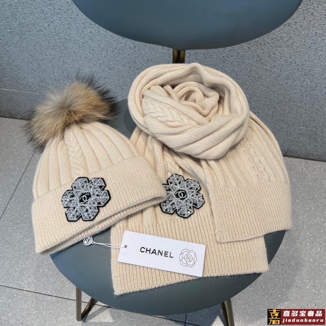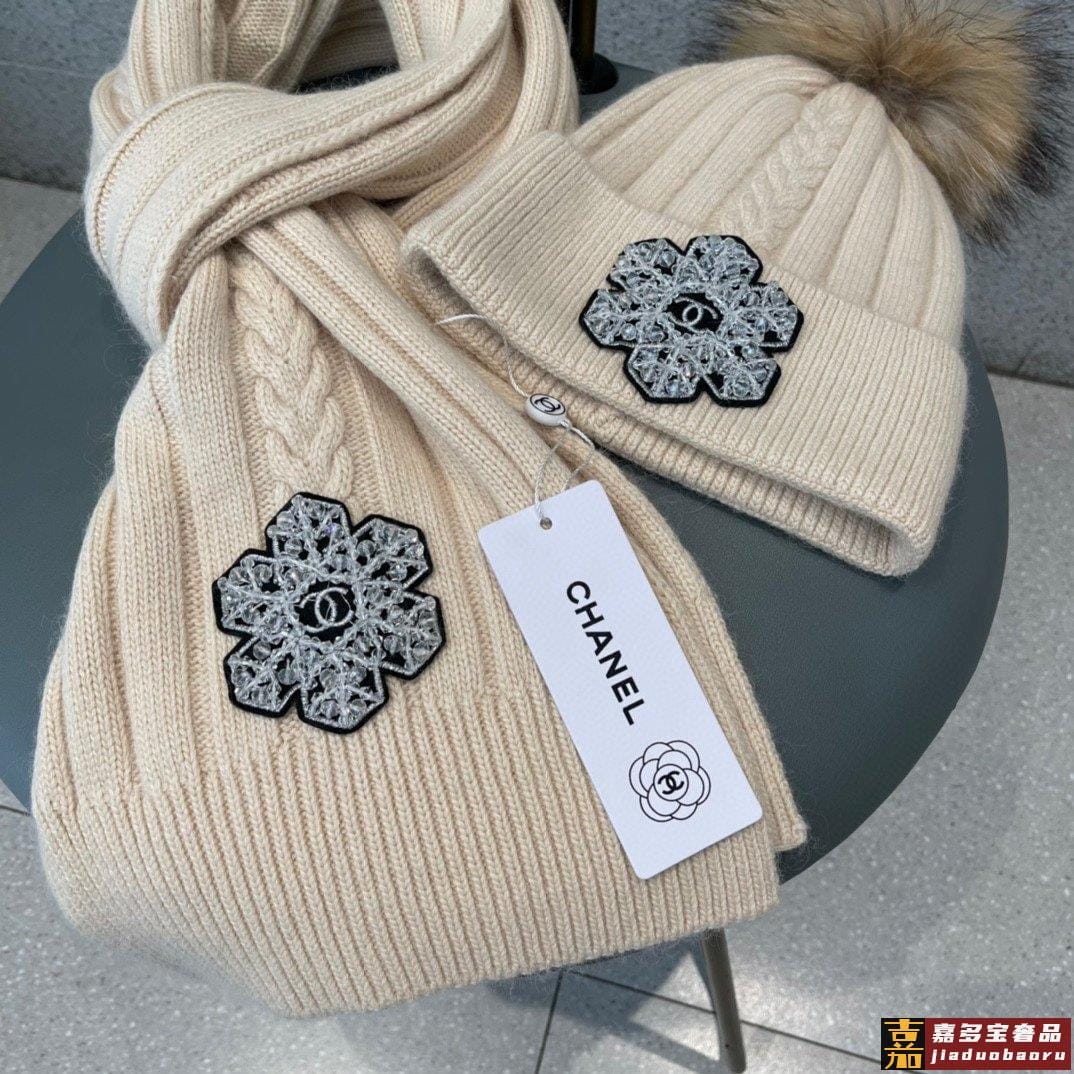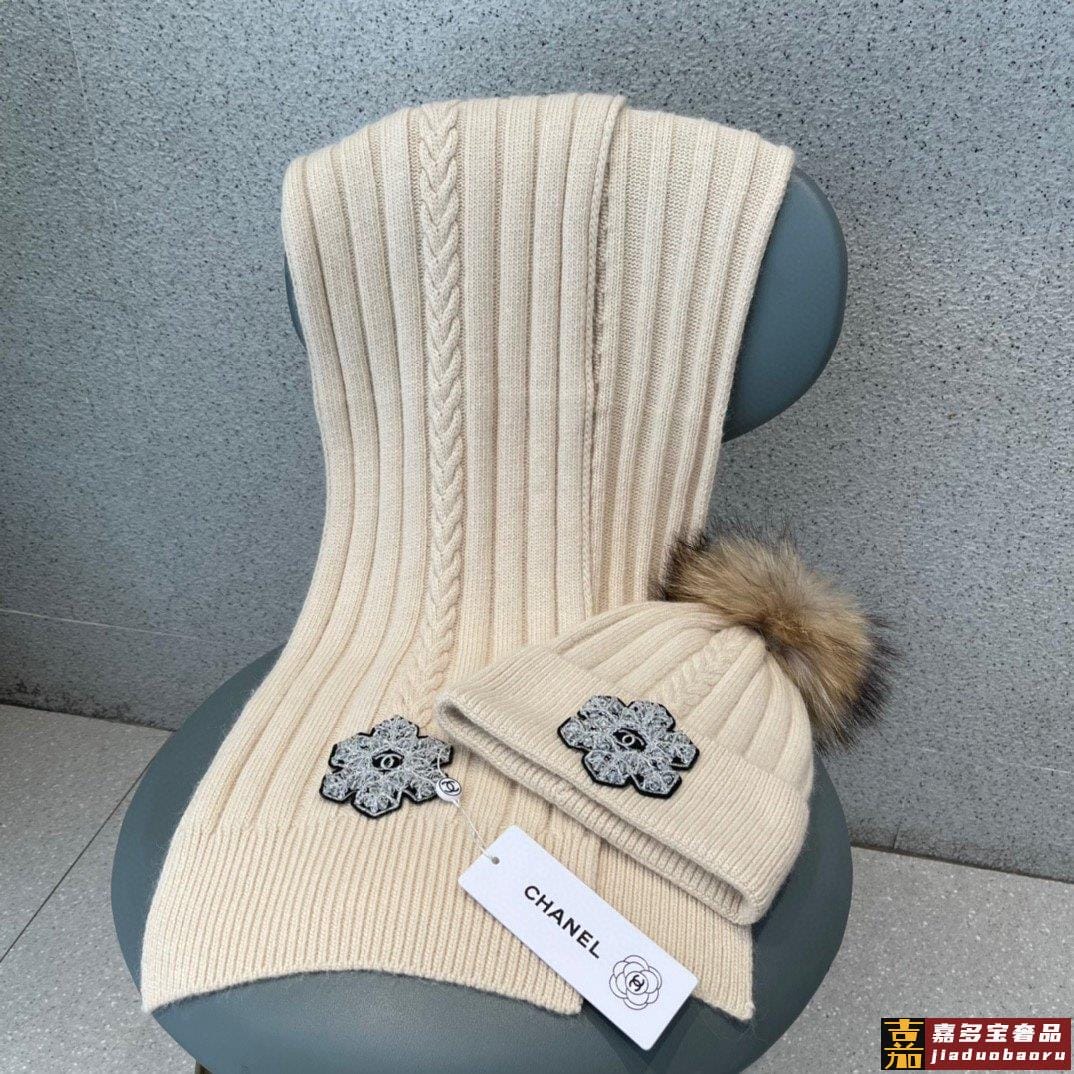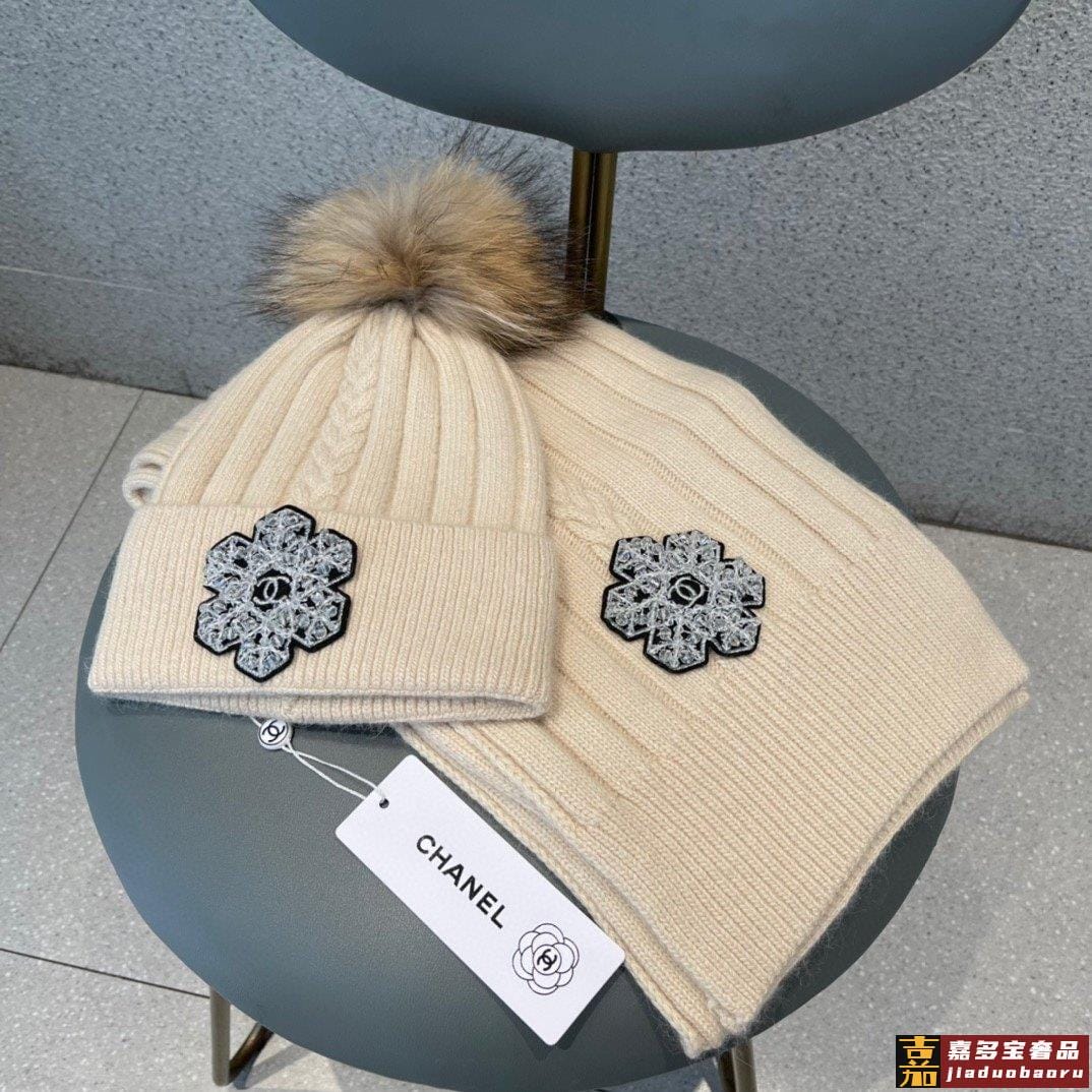 香奈儿秋冬专柜款针织毛线帽围巾两件套装搭配貉子毛球专柜款时尚