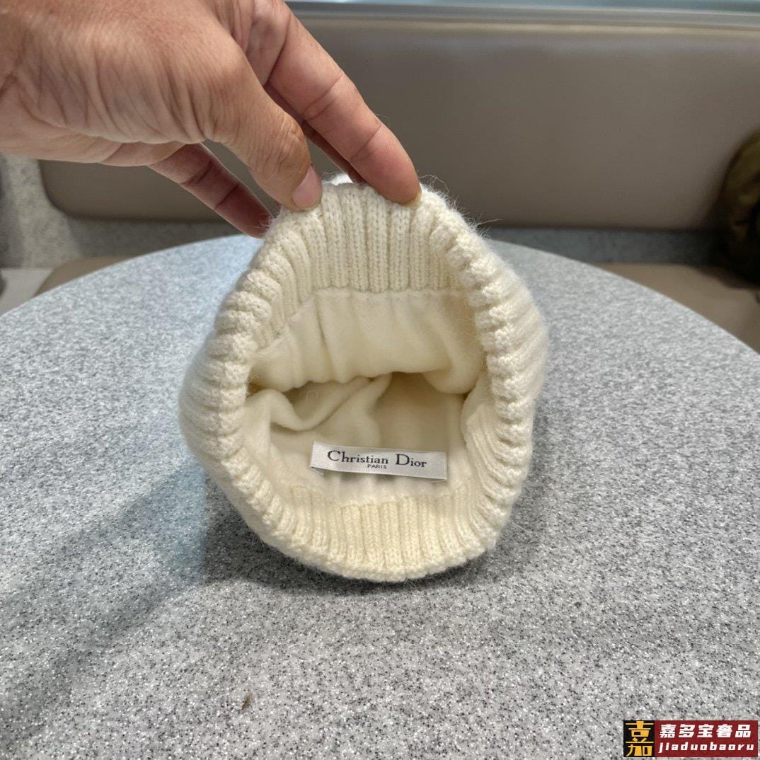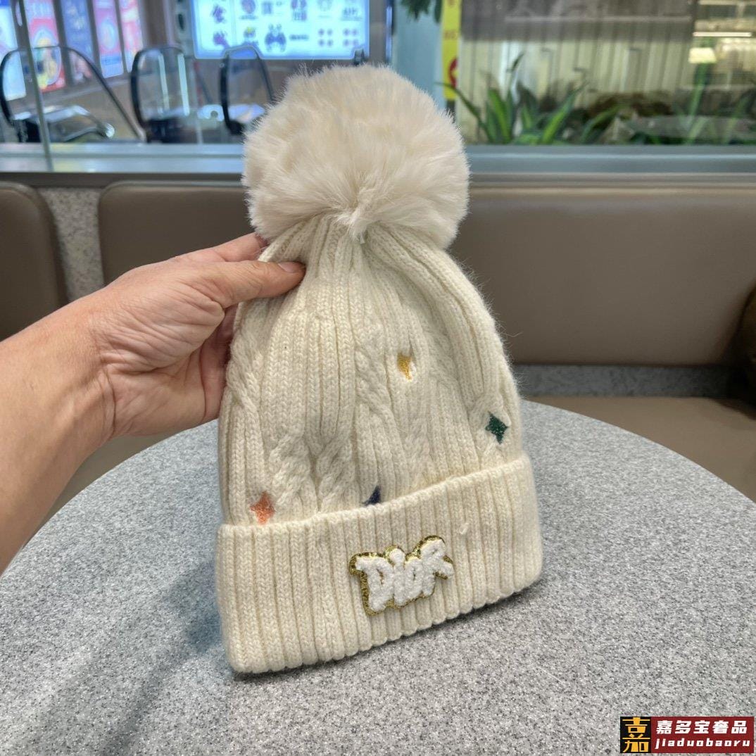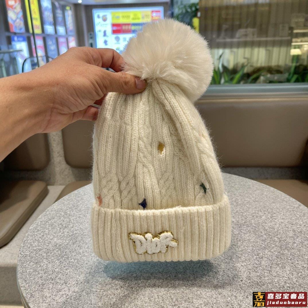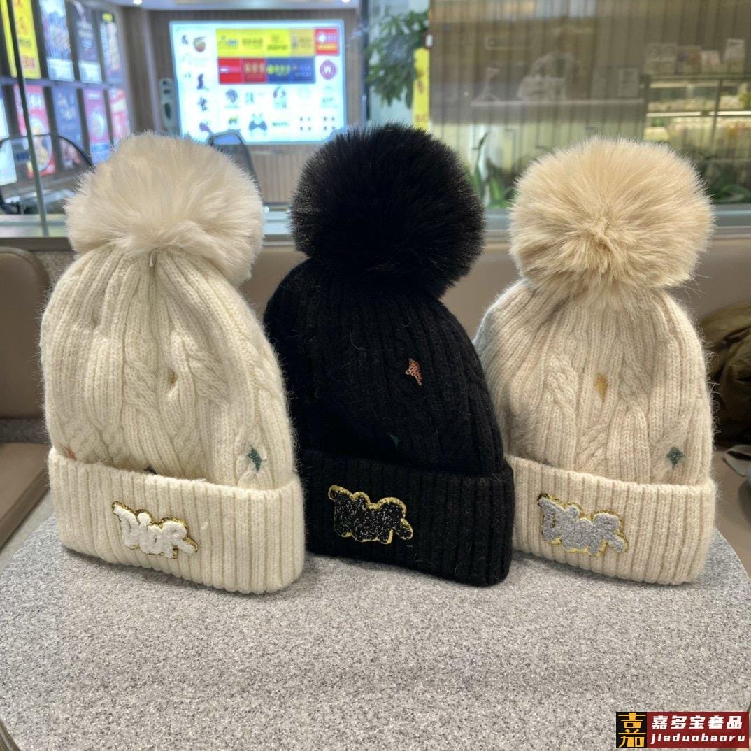 迪奥秋冬新款法国定毛毛球毛线帽秋冬保暖加绒加厚潮针织毛线帽高
