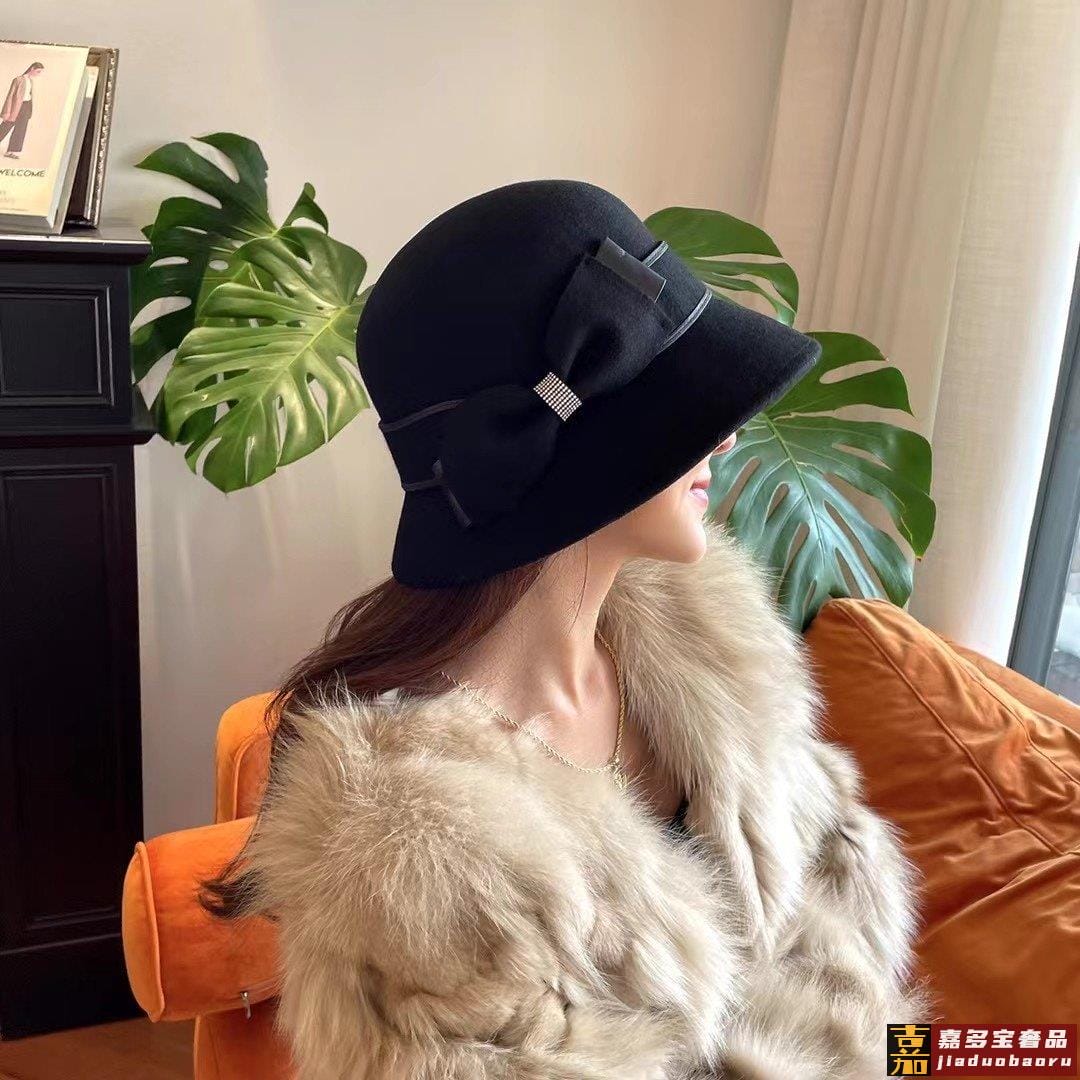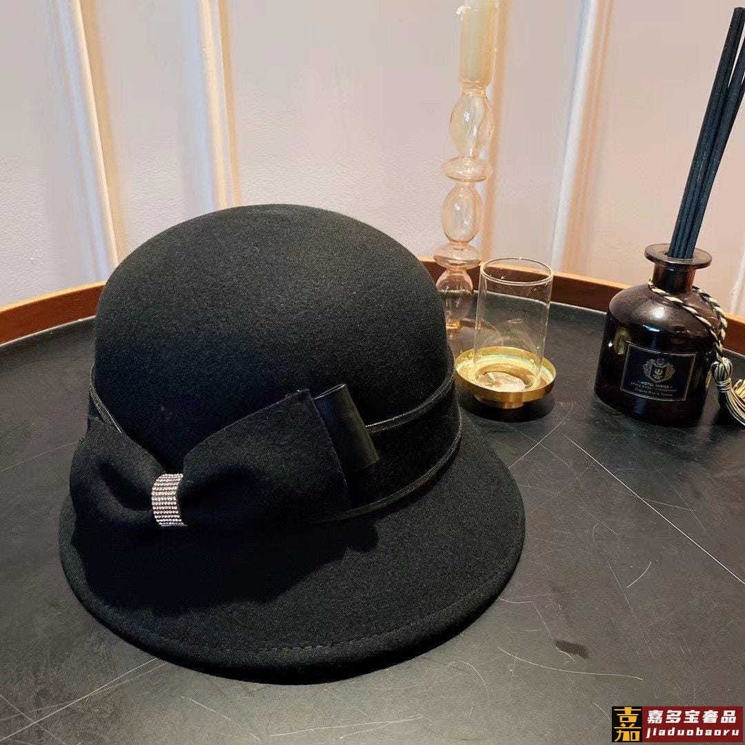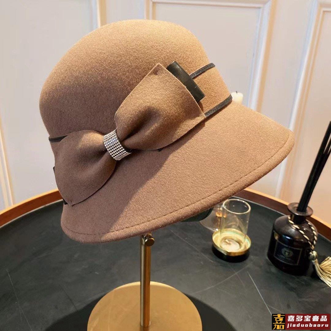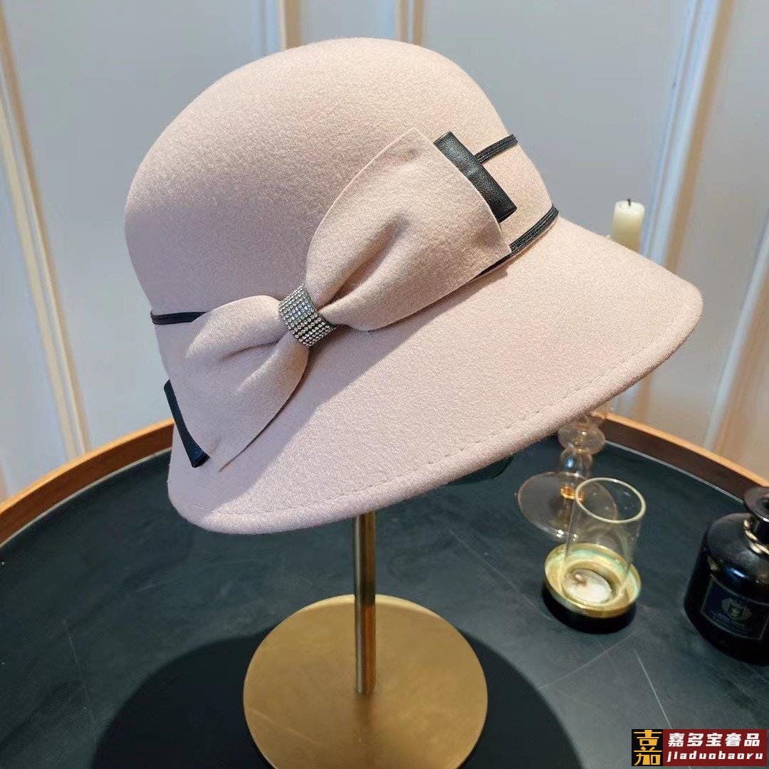 小香新款水钻蝴蝶结羊毛呢盆帽黑色卡其色粉红