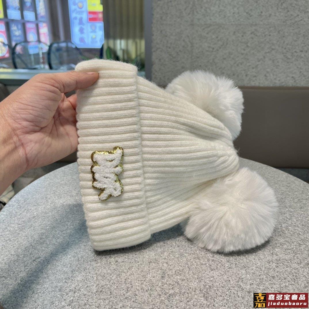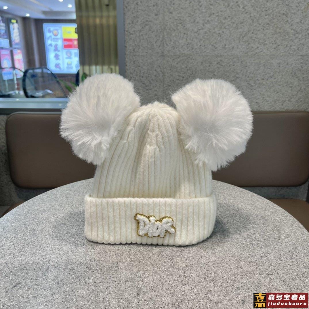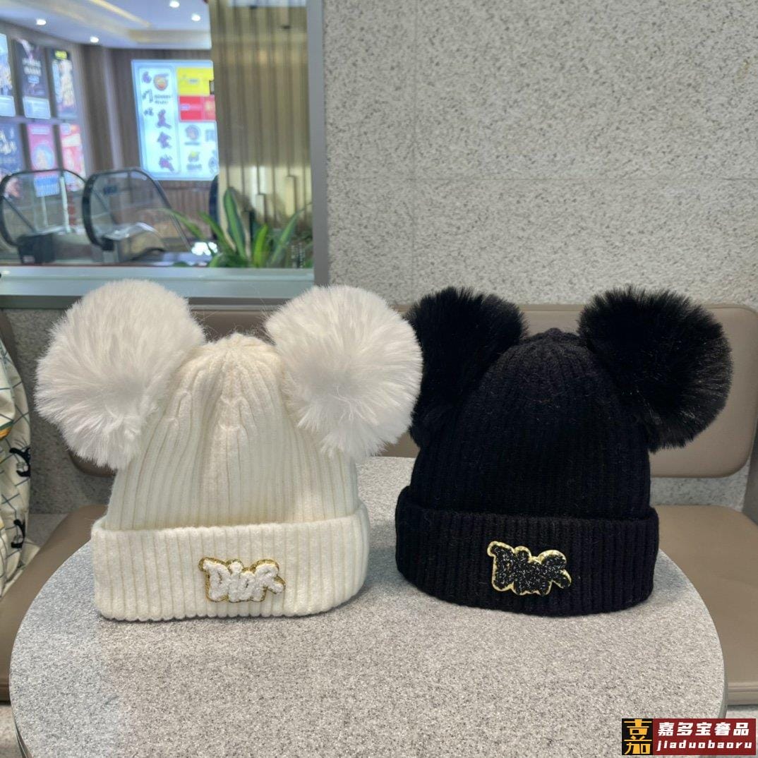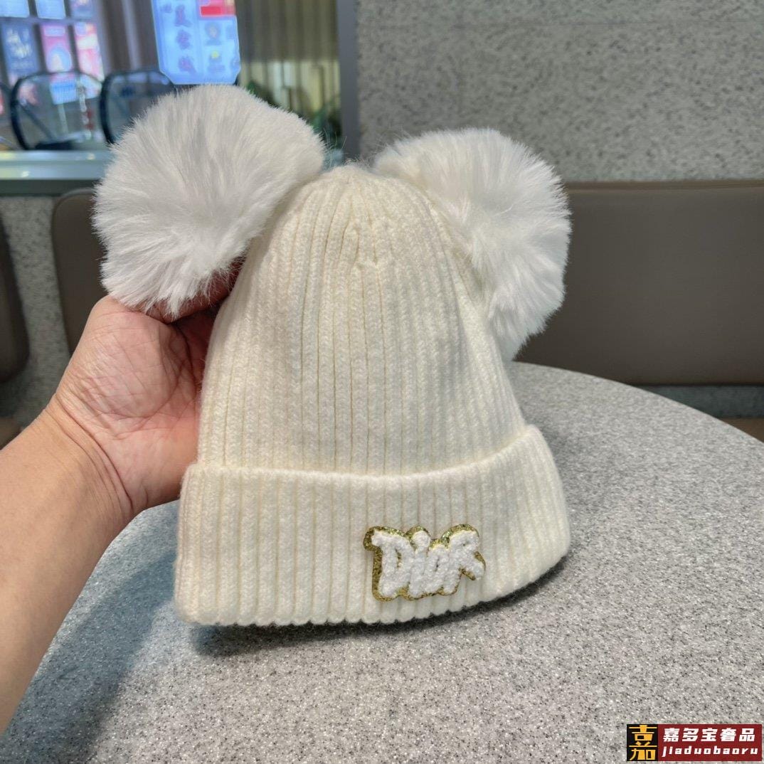 迪奥秋冬新款法国定双狐狸毛球毛线帽秋冬保暖加绒加厚潮针织毛线