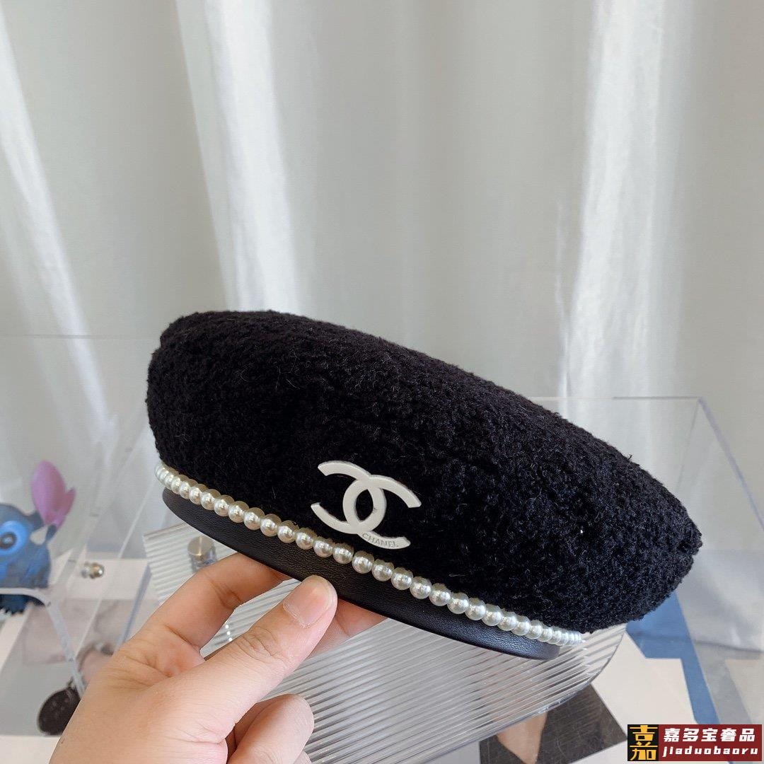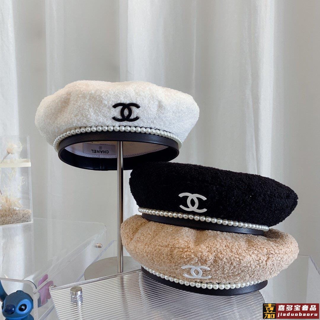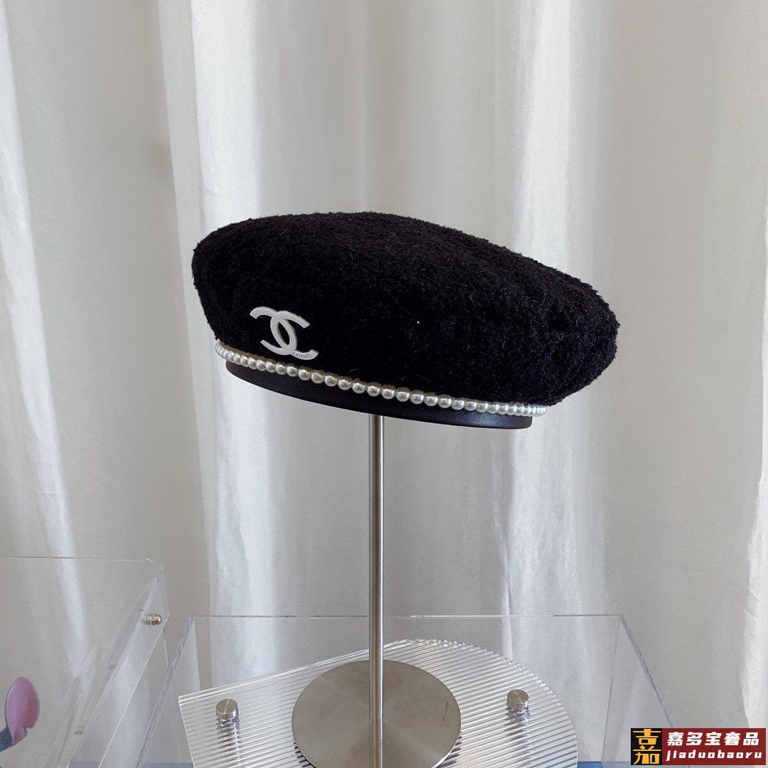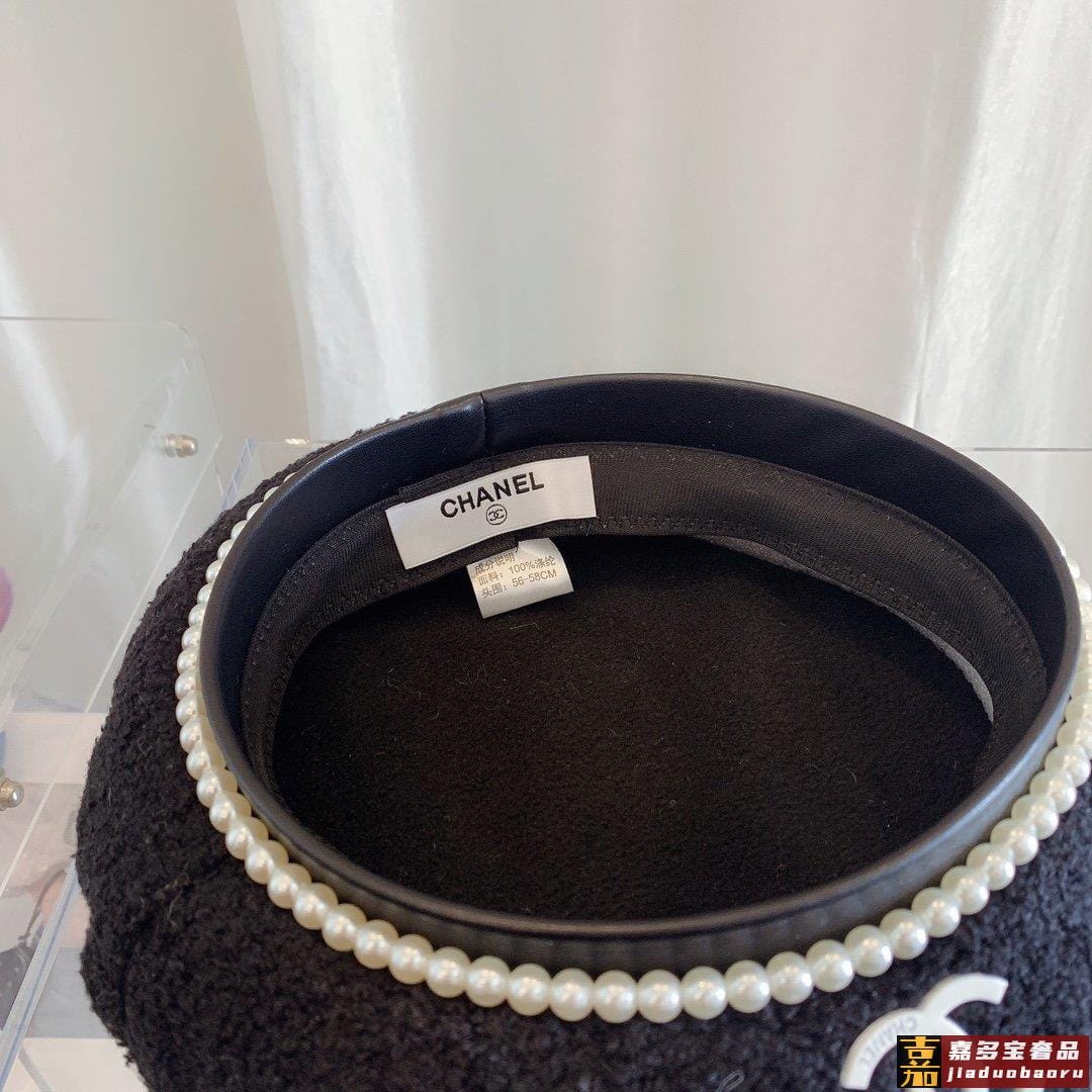 香奈儿珍珠贝雷帽羊羔毛面料珍珠配饰黑白卡其三色头围