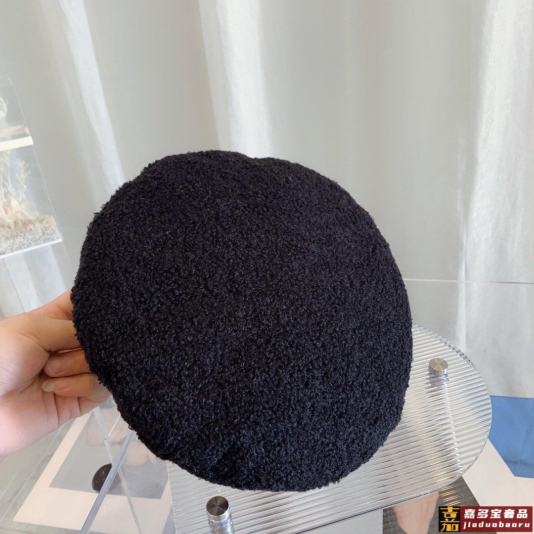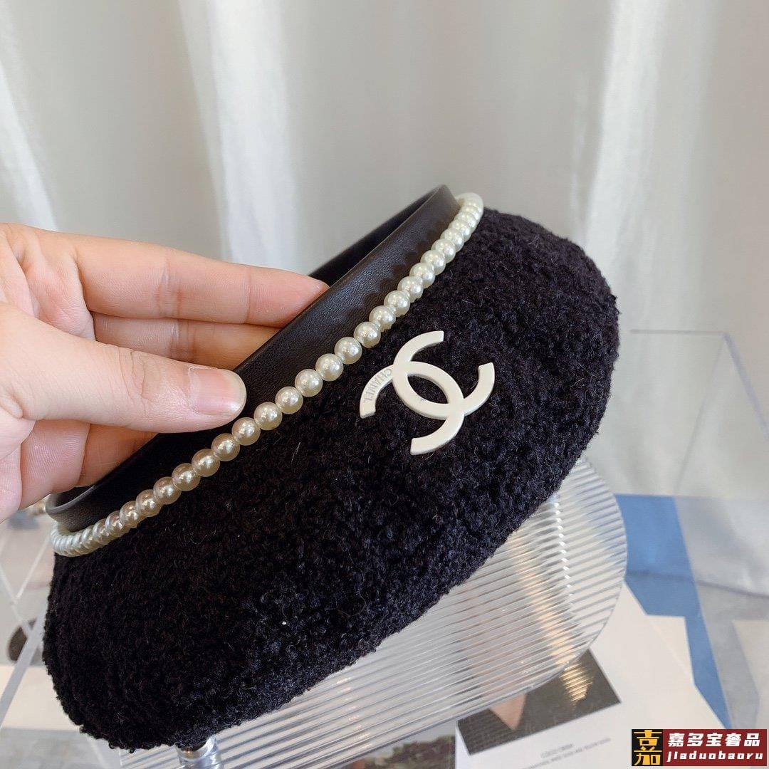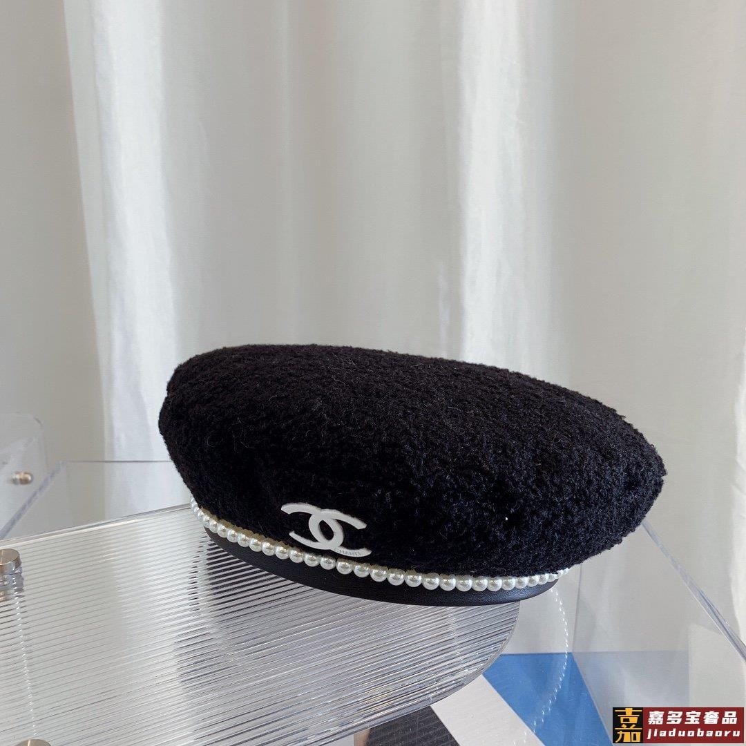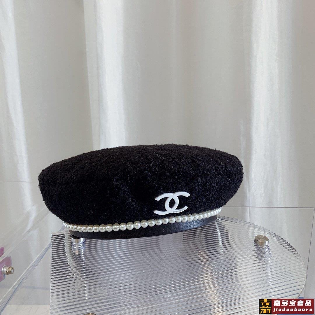 香奈儿珍珠贝雷帽羊羔毛面料珍珠配饰黑白卡其三色头围