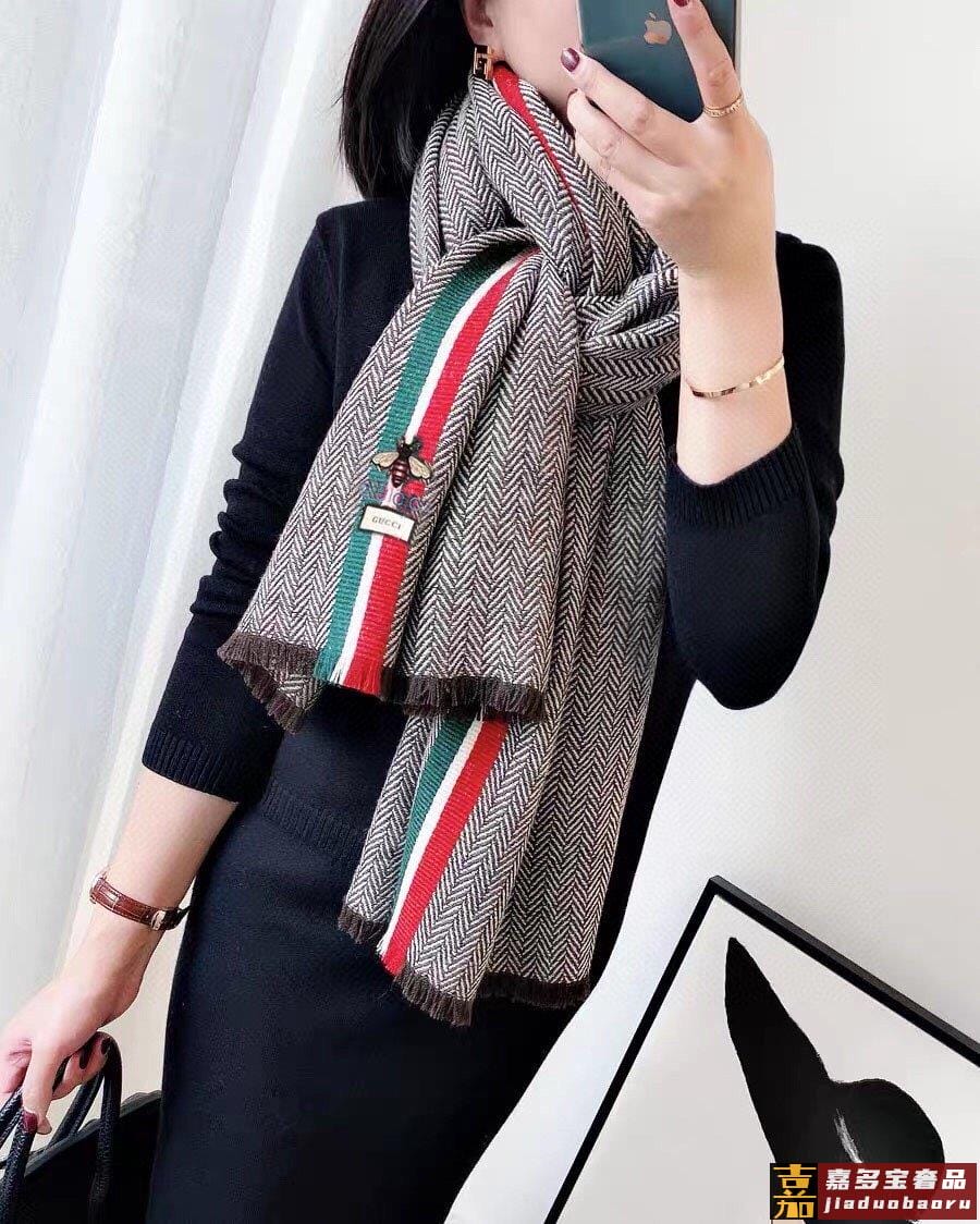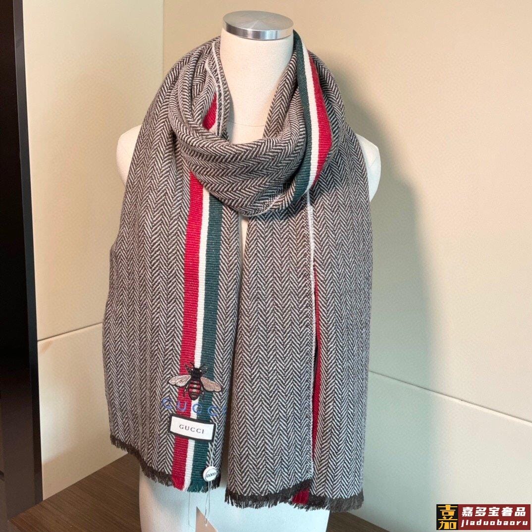古驰蜜蜂人字纹彩条羊毛围巾今年的新款采用的是人字纹加彩条的设