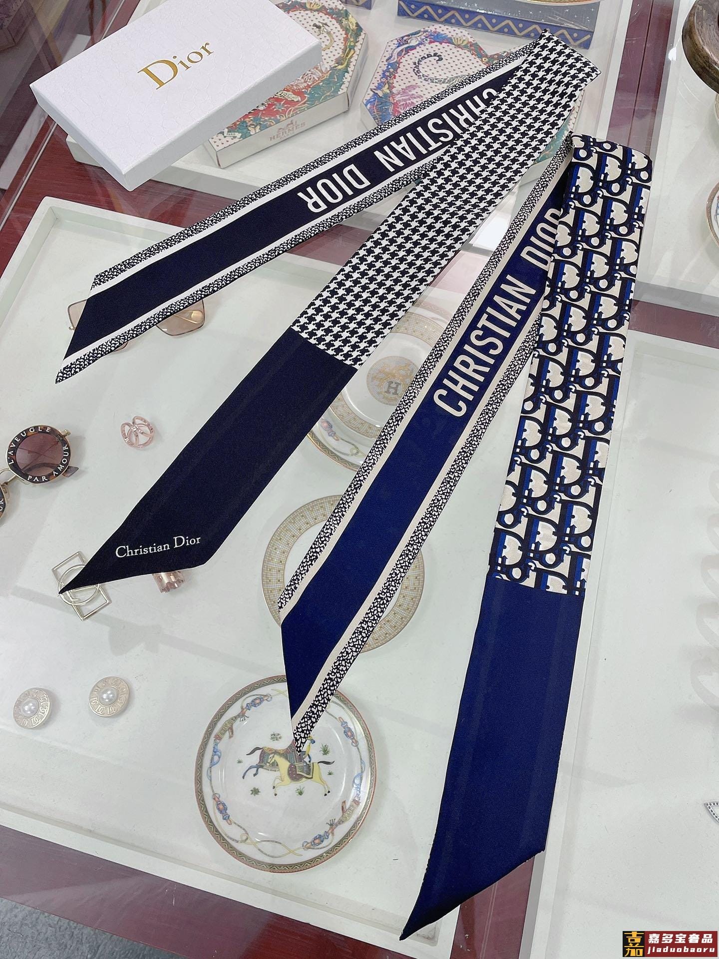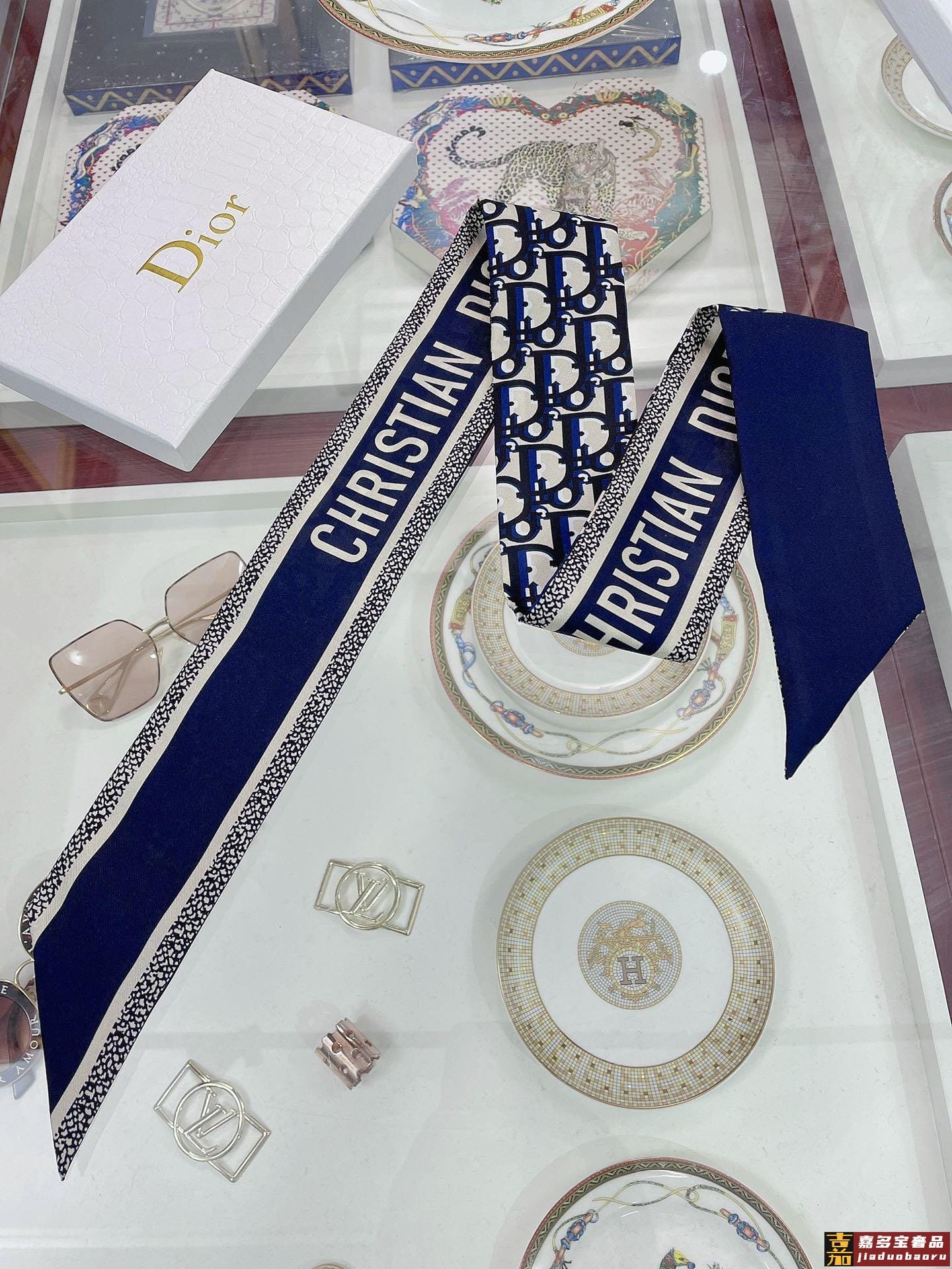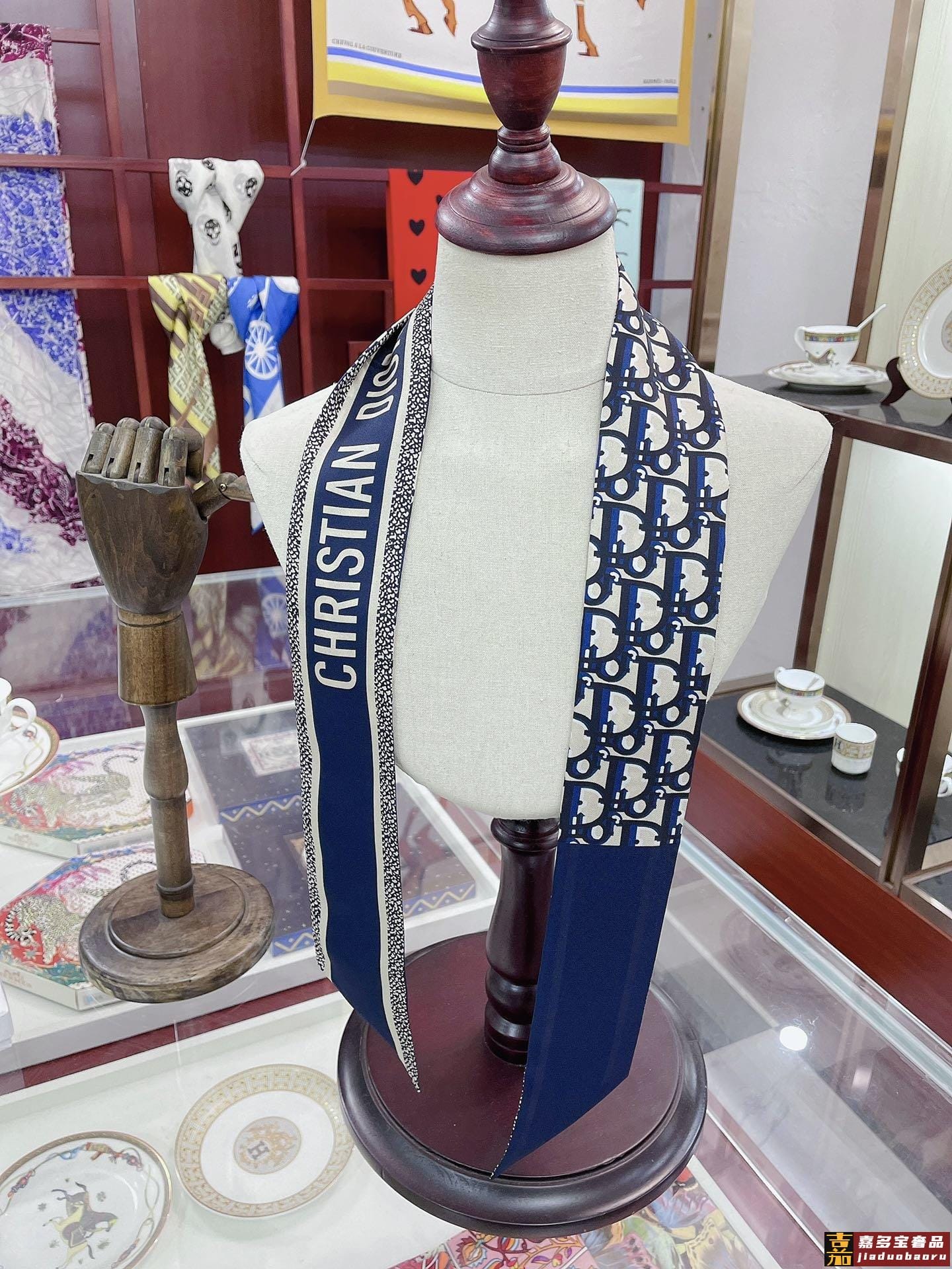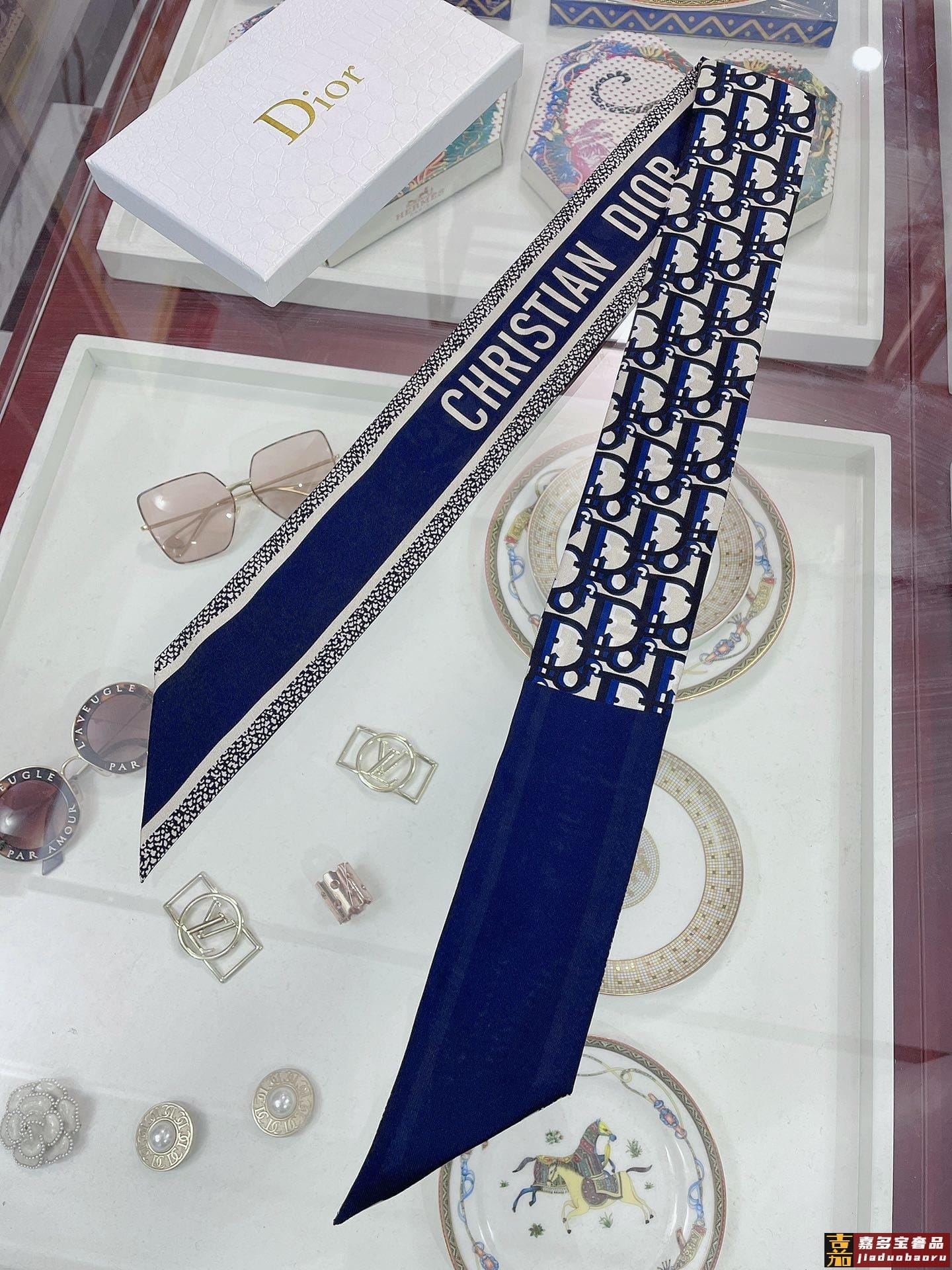 新款这款丝巾饰以印花回溯年推出的经典图案采用海军蓝色桑蚕丝斜