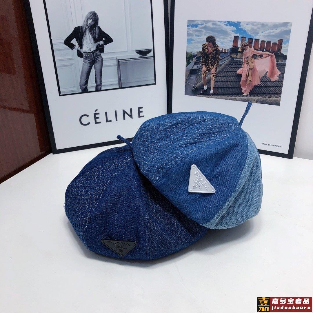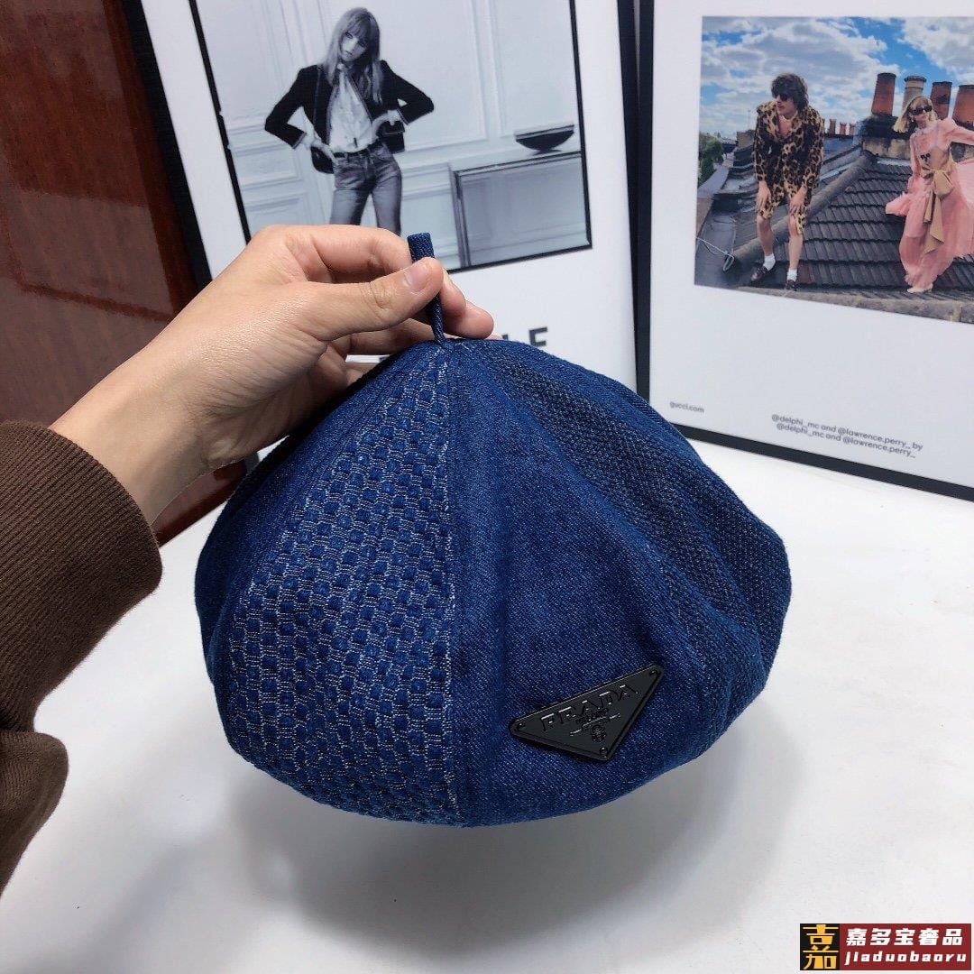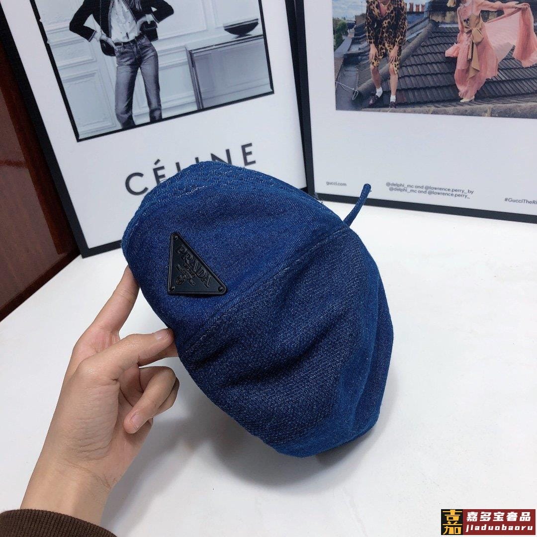 普拉达早秋新款洗水牛仔贝雷帽画家帽经典的画家贝雷帽每年早秋总