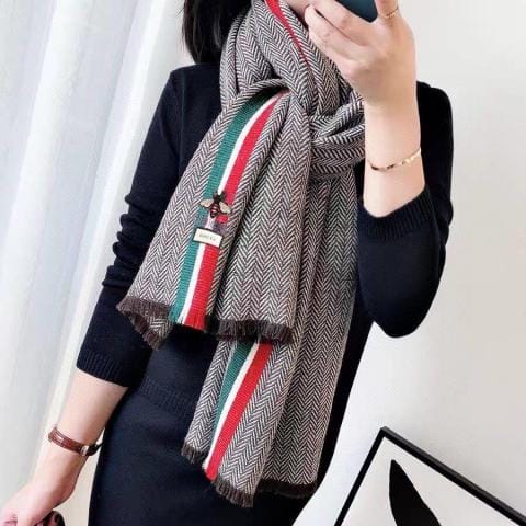 古驰蜜蜂人字纹彩条羊毛围巾今年的新款采用的是人字纹加彩条的设