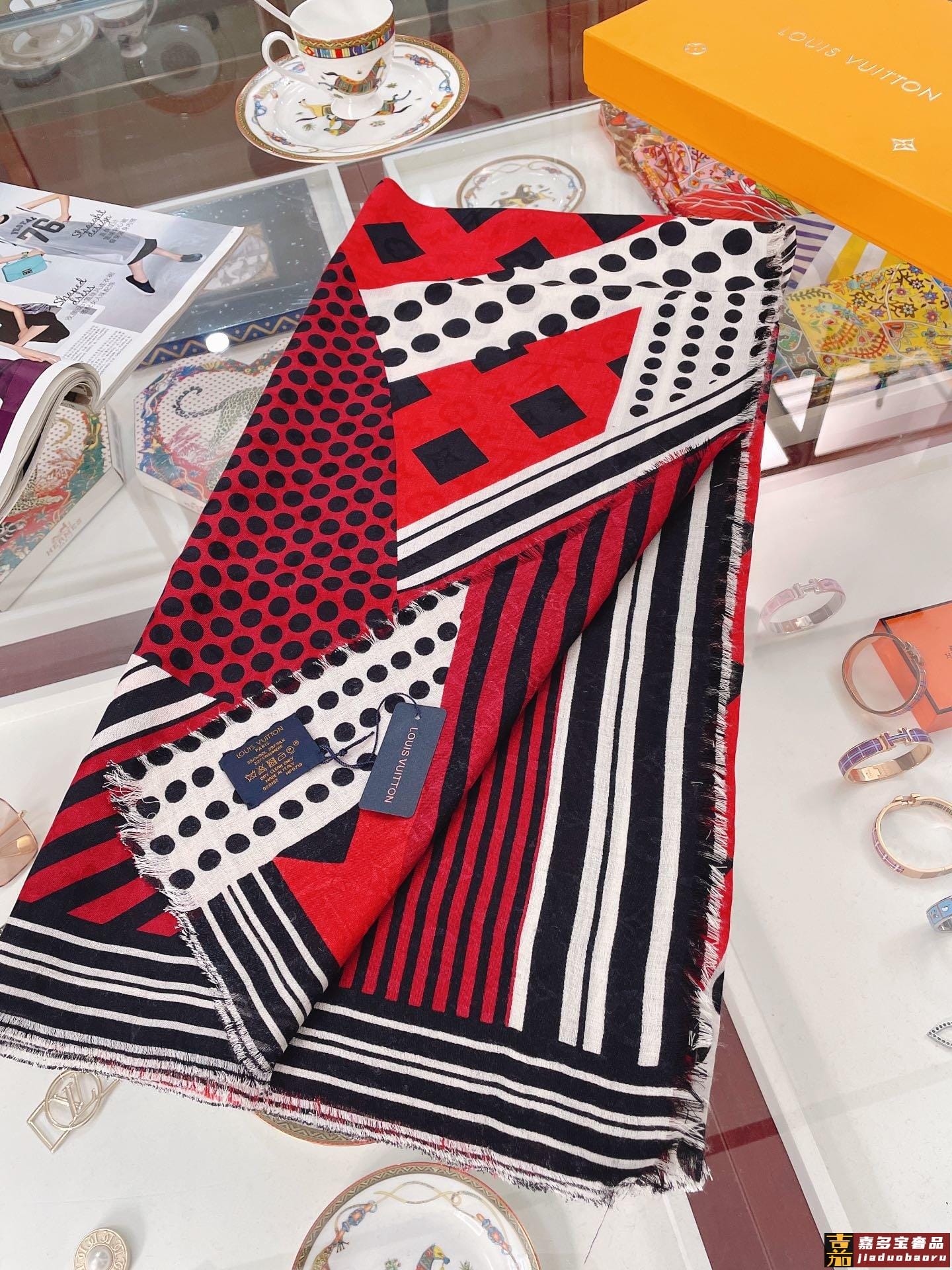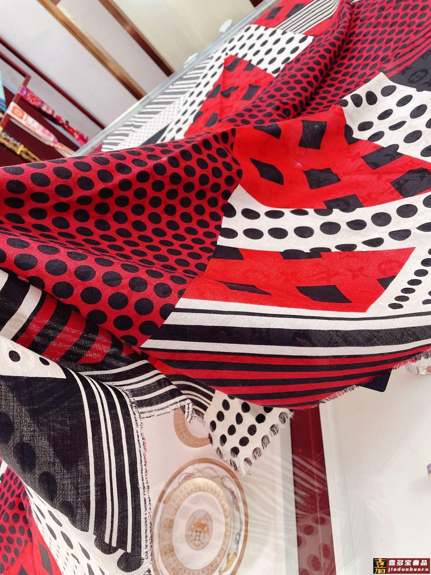条纹和斑点图案在这条拼色图案披肩上排布形成独特的图案采用同色