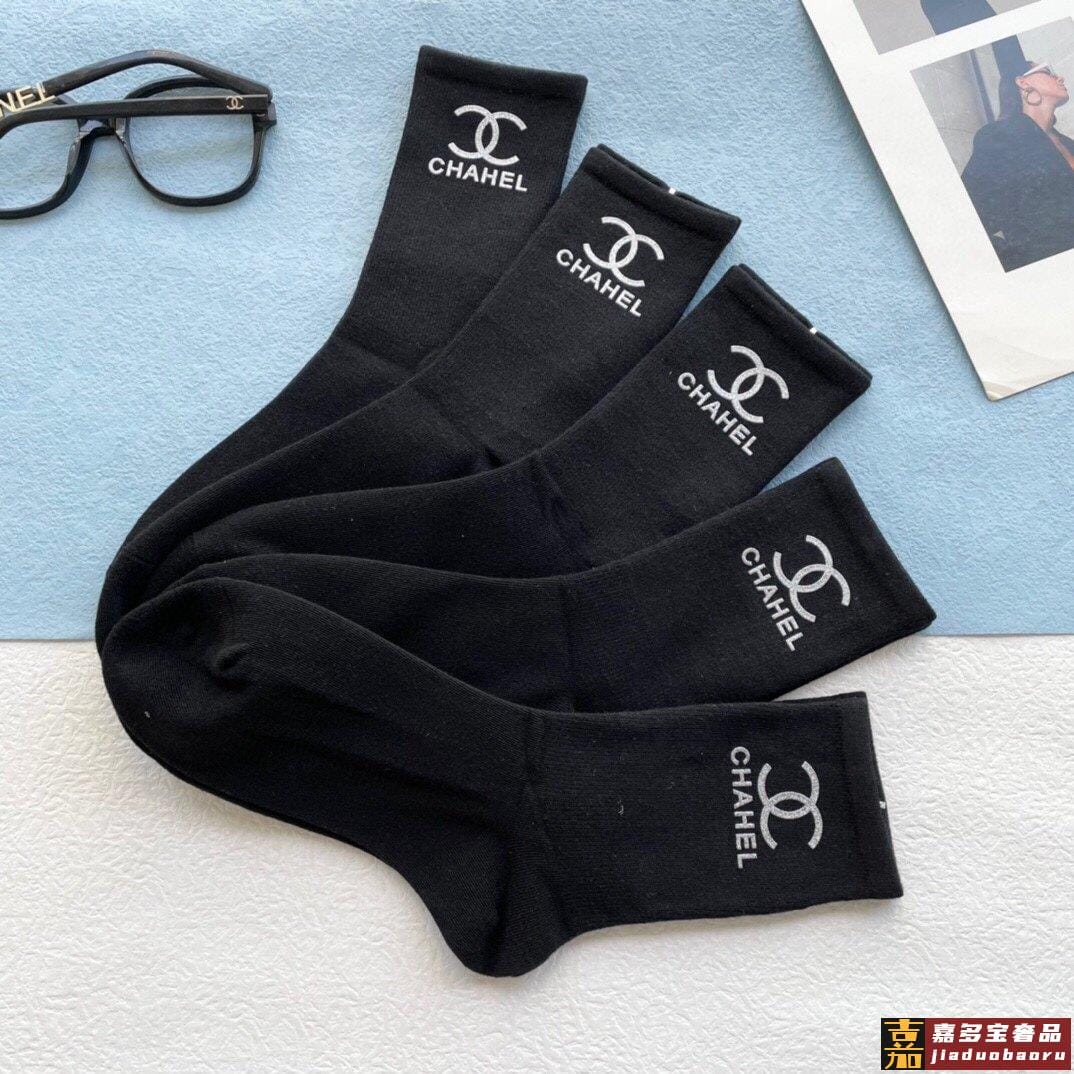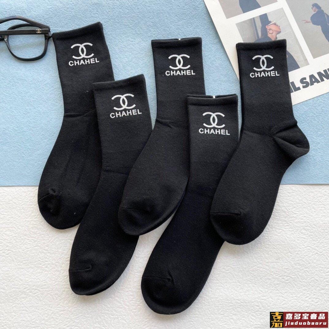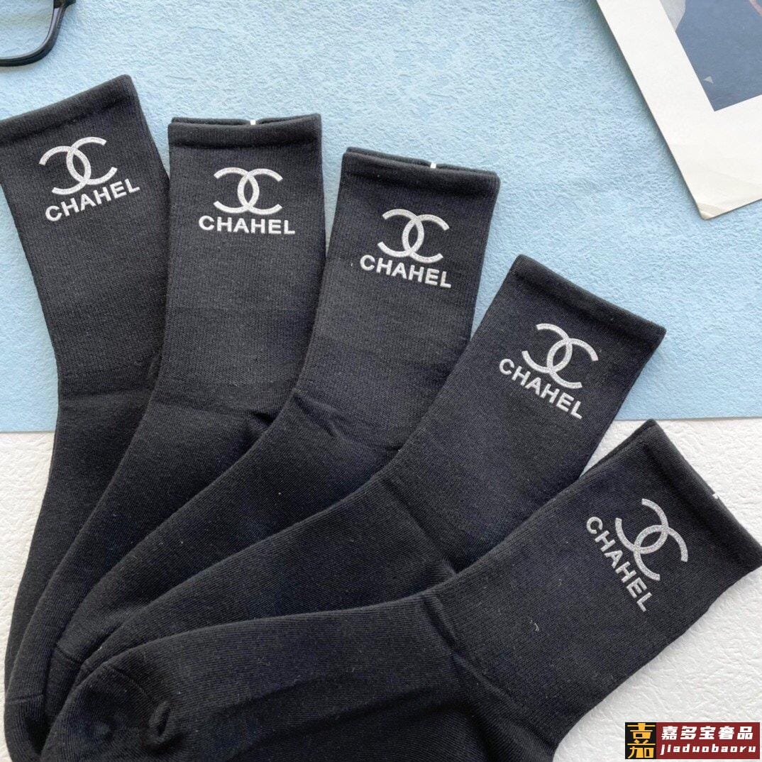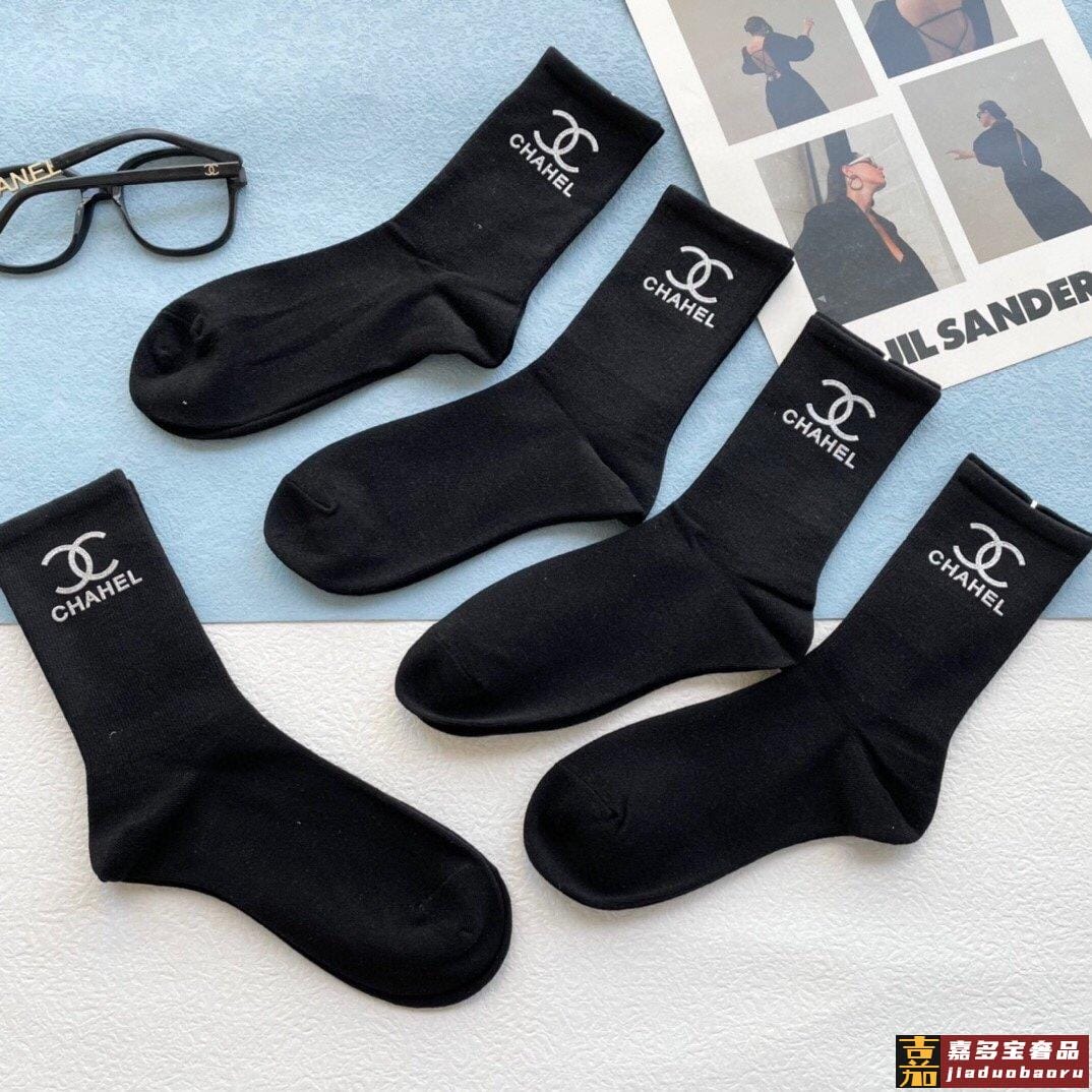 配包装一盒五双爆款香奈儿欧美大牌新品烫印纯黑中筒男女款袜子专
