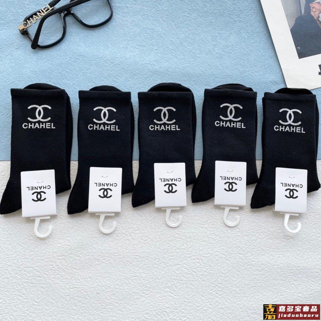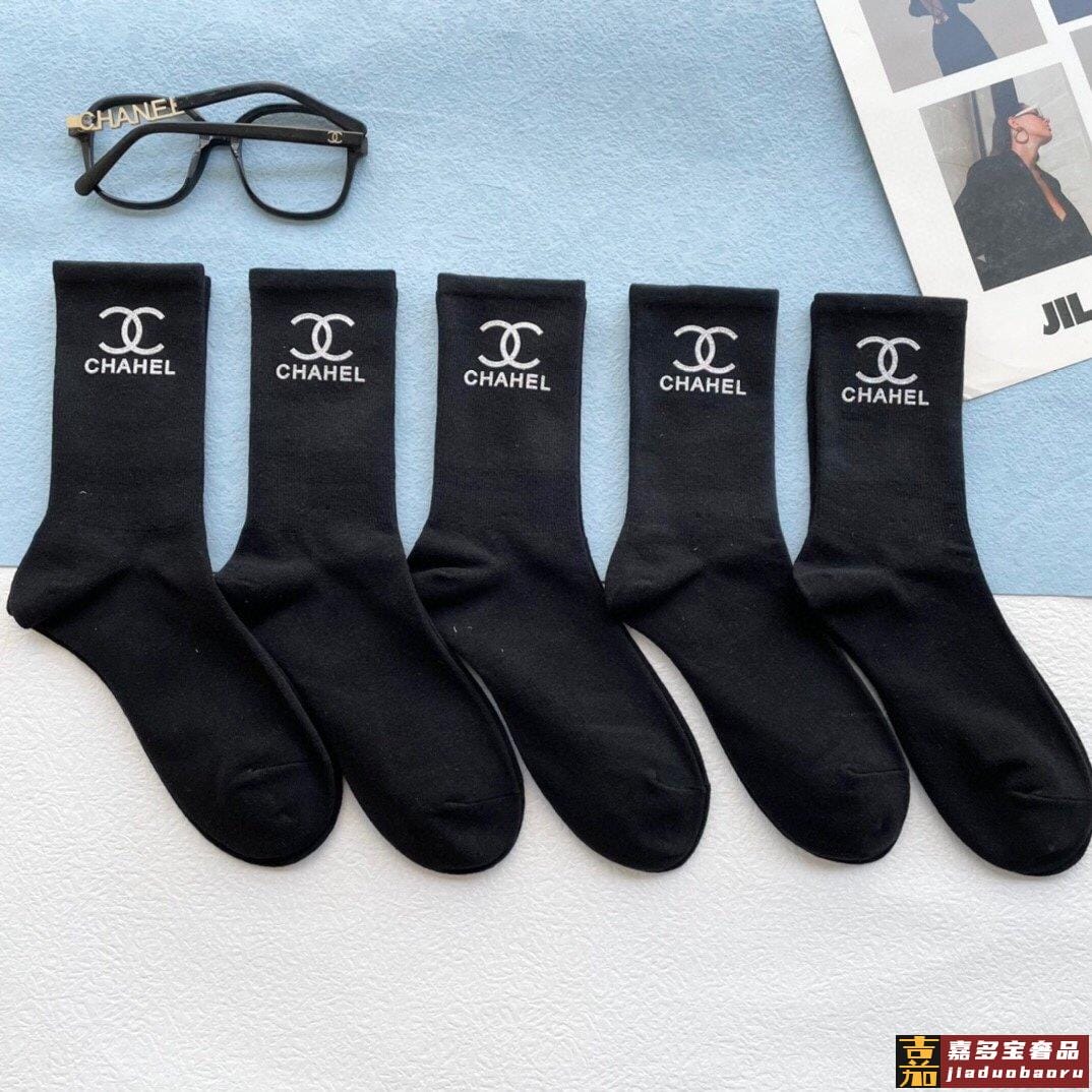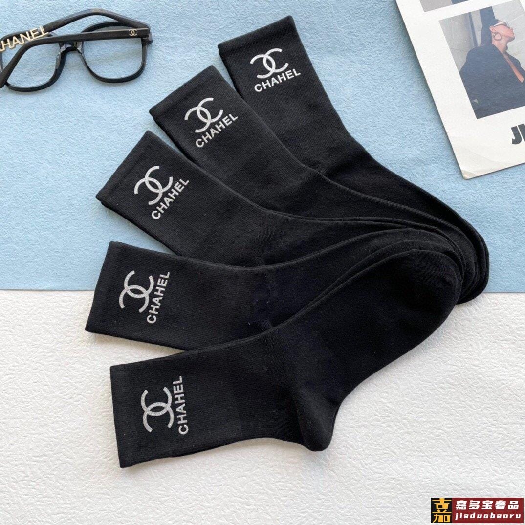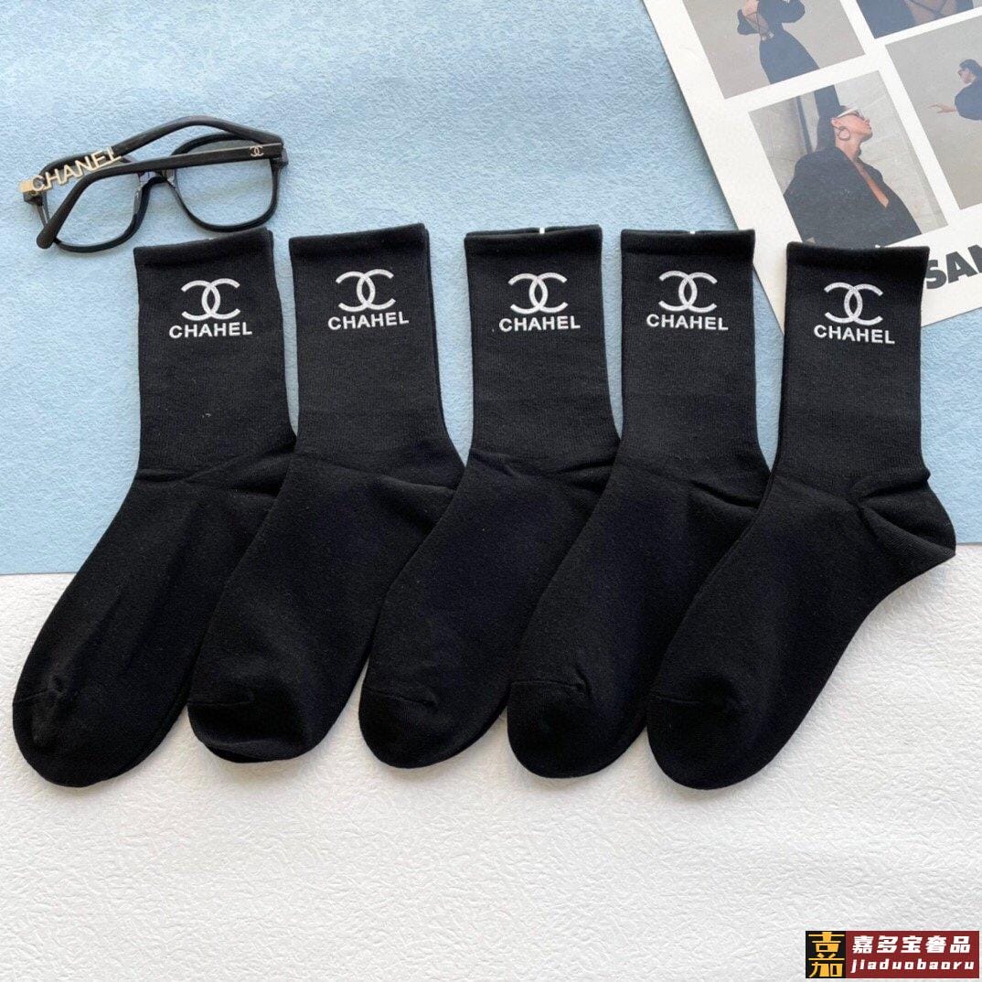 配包装一盒五双爆款香奈儿欧美大牌新品烫印纯黑中筒男女款袜子专