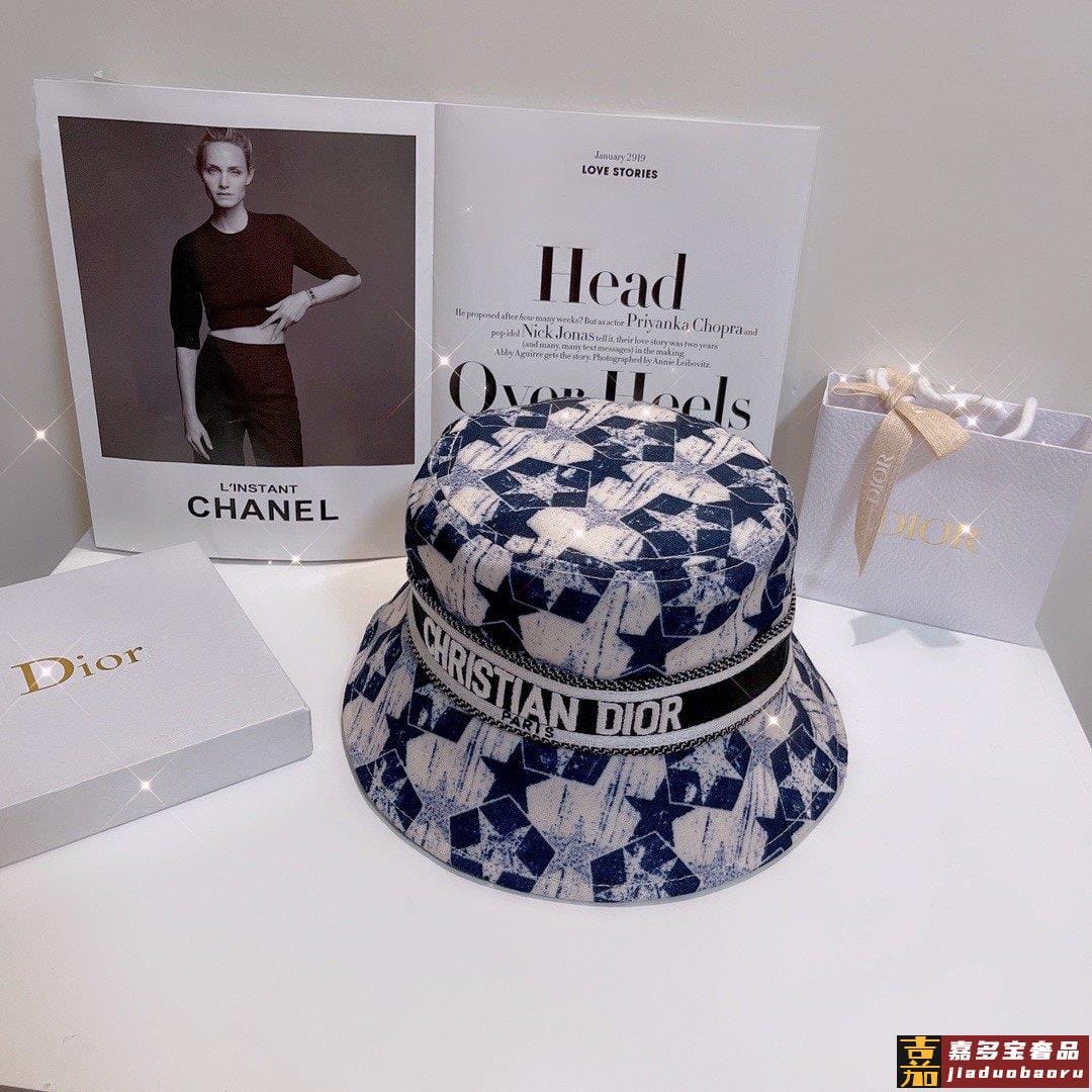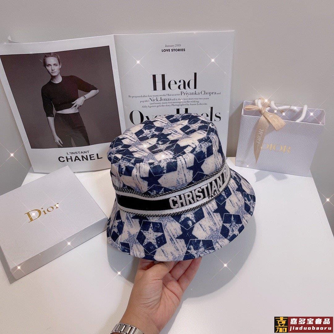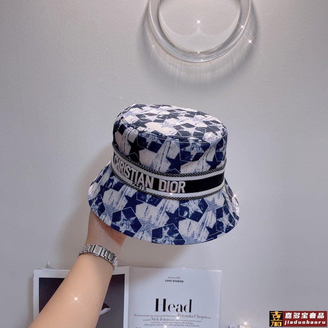迪奥新款五角星印花字母织带帆布渔夫帽这款海军蓝色茹伊印花桶帽