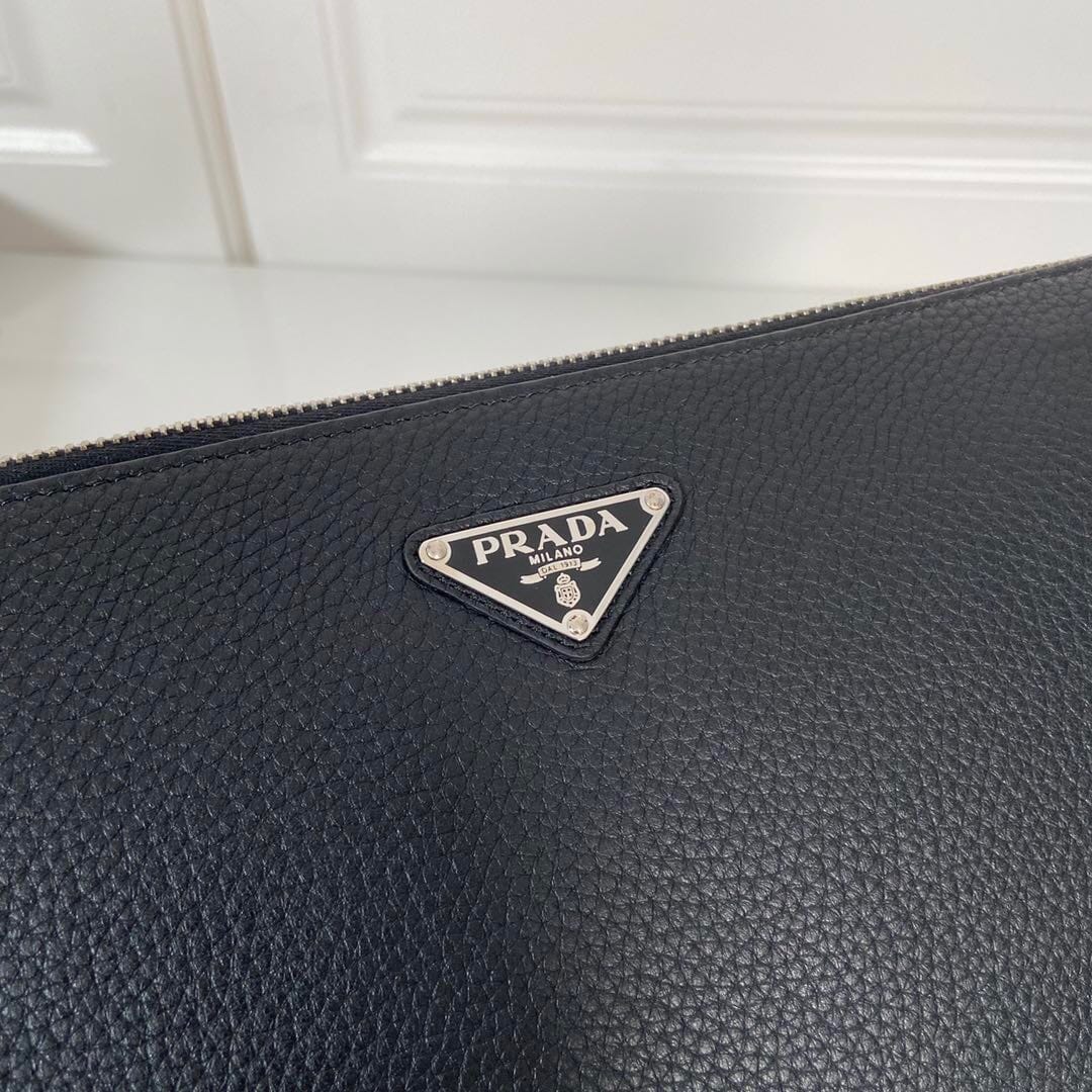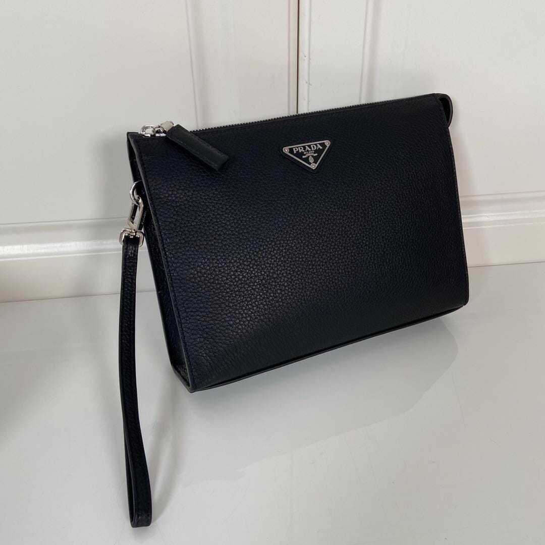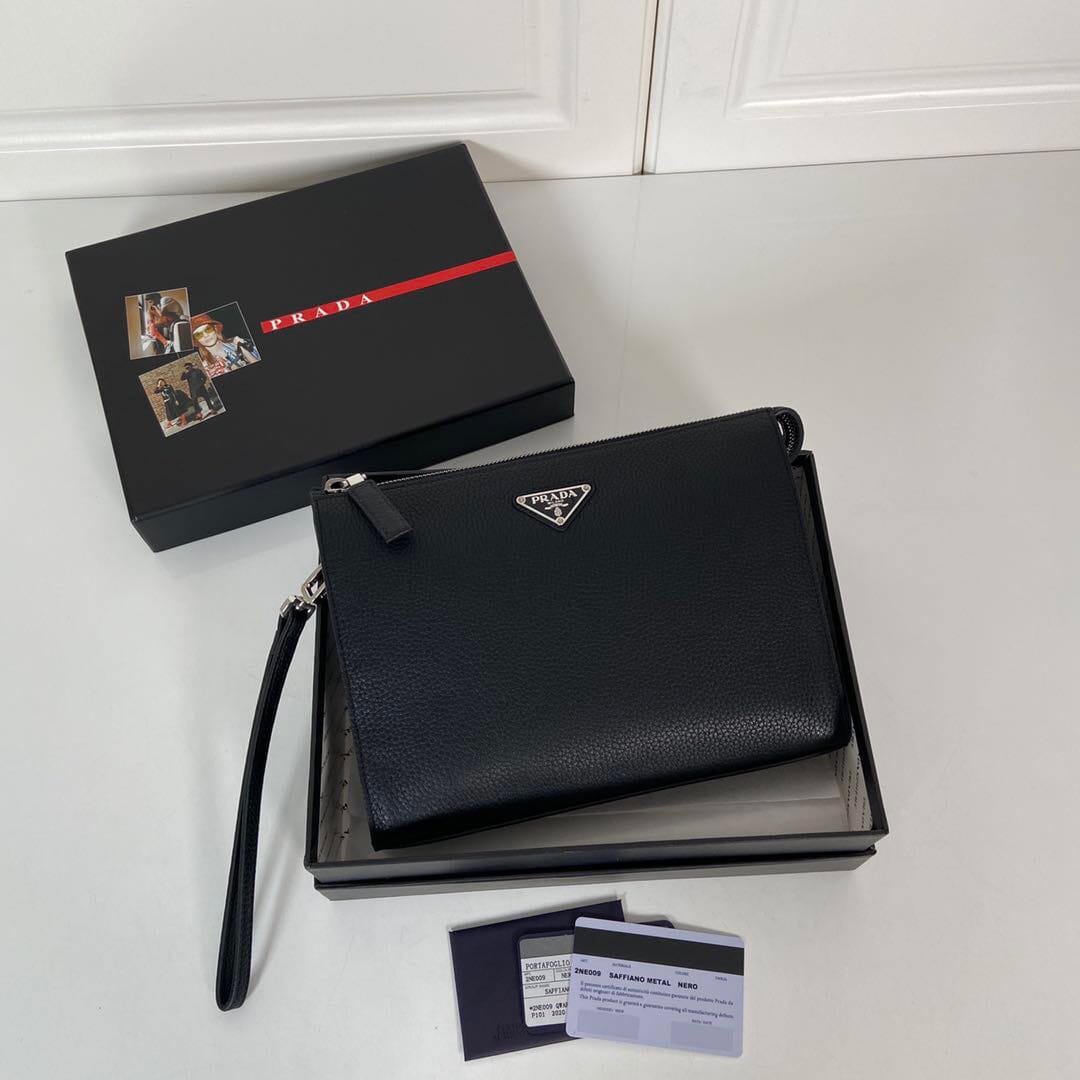 P家??男士手包,黑色,型号2NE009,银色三角麦,顶级鹿皮+白钢五金,顶级元单品质,尺寸:长24×高18×宽6.5cm
