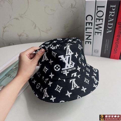 专柜新款路易威登家刺绣渔夫帽简单大方男女通用遮阳帽酷酷黑白风
