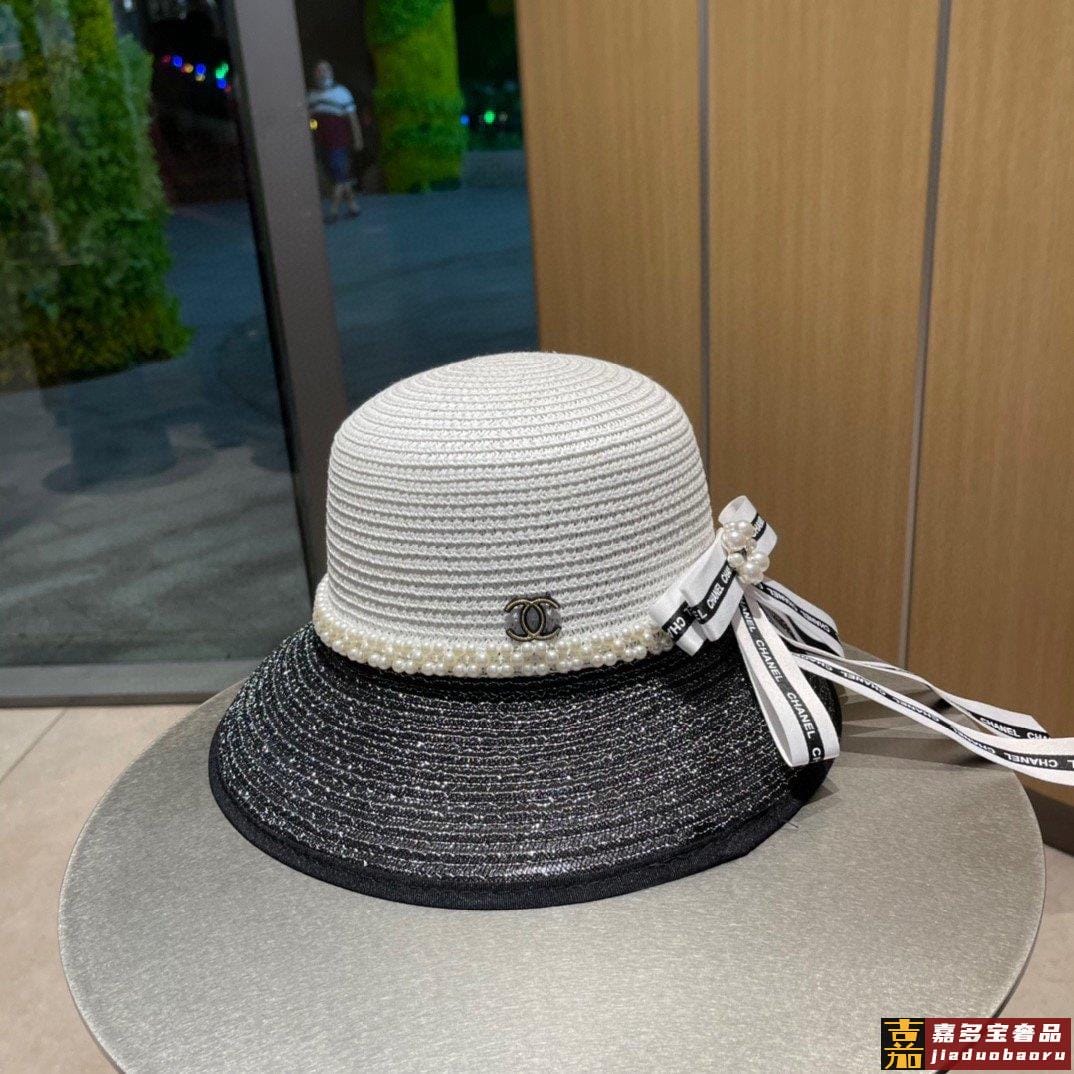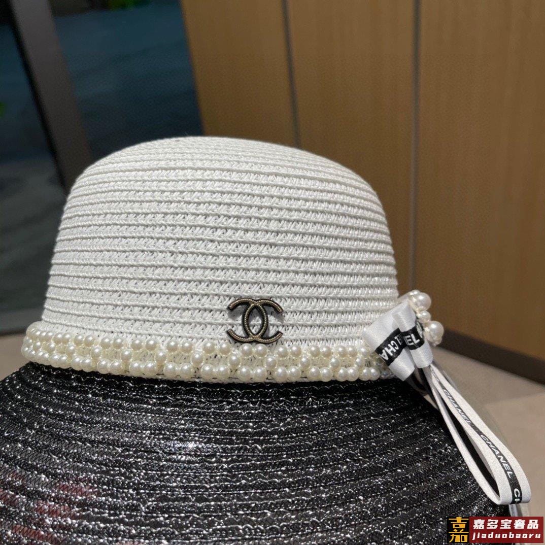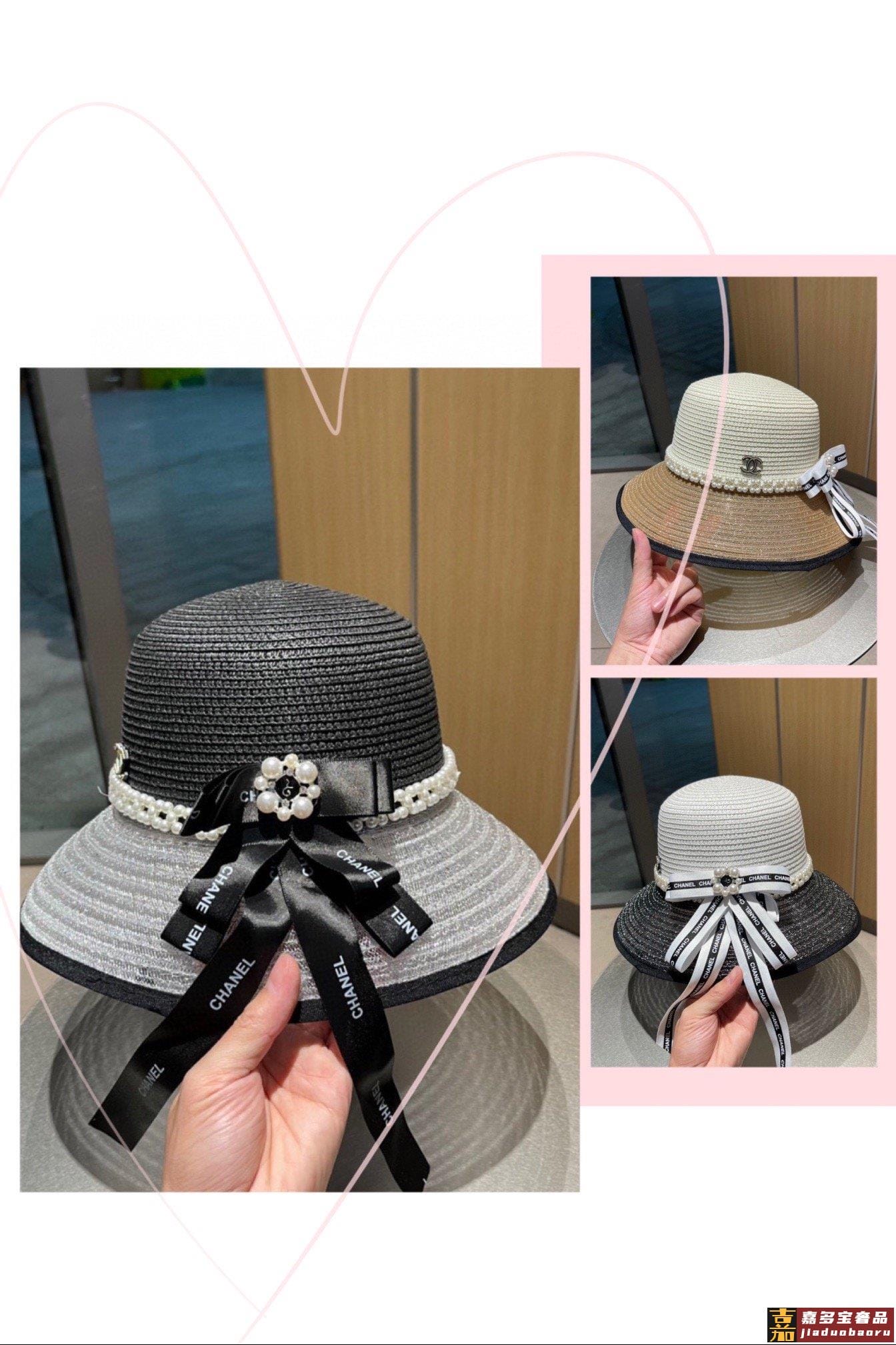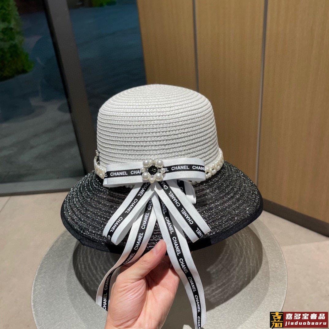 香奈儿新品蝴蝶结气质休闲草编草帽配珍珠夏日遮阳独家百搭风格