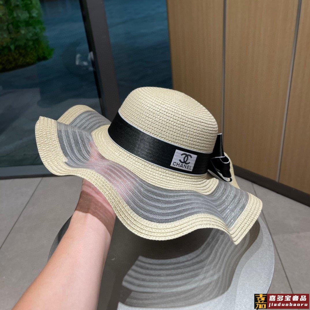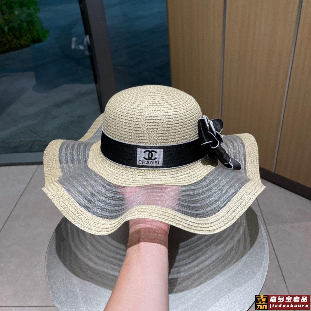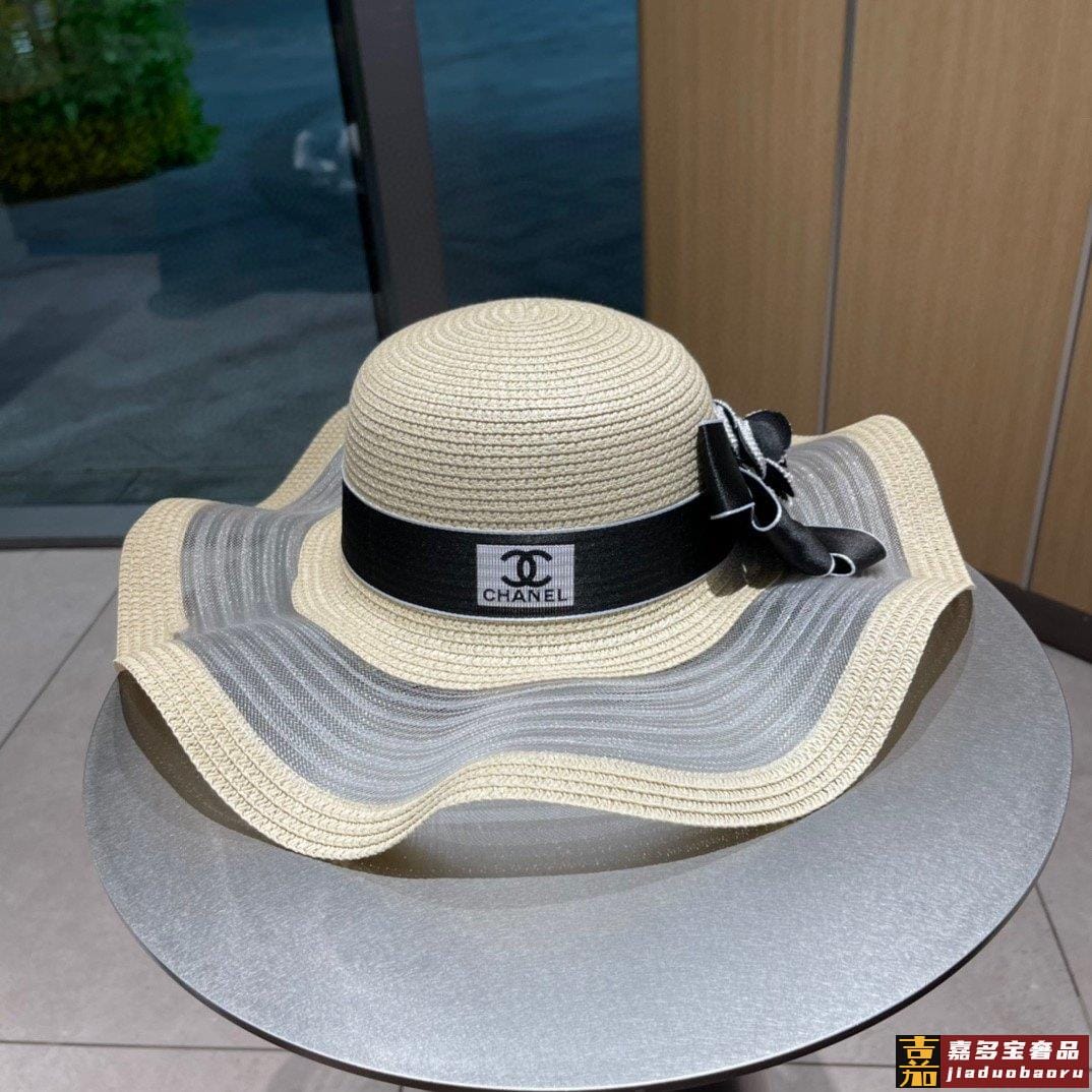 香奈儿夏季新款草帽波浪大帽边蝴蝶结草帽纸草制作精致大牌范女神