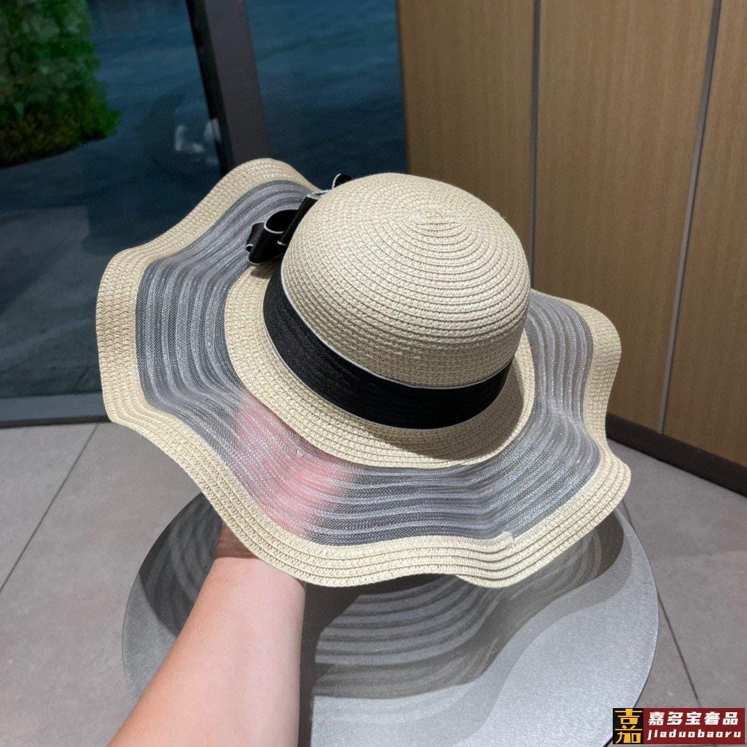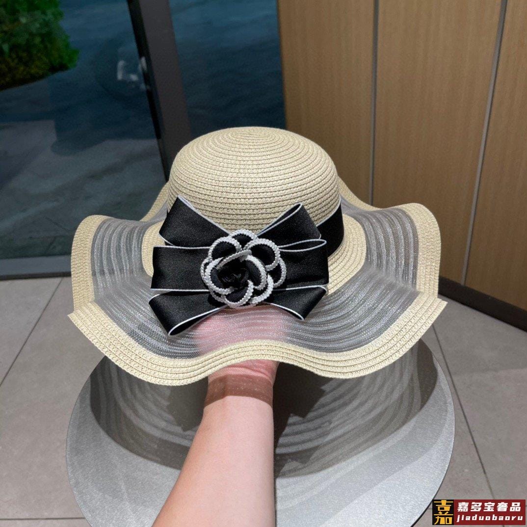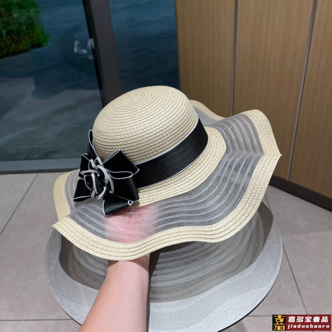 香奈儿夏季新款草帽波浪大帽边蝴蝶结草帽纸草制作精致大牌范女神