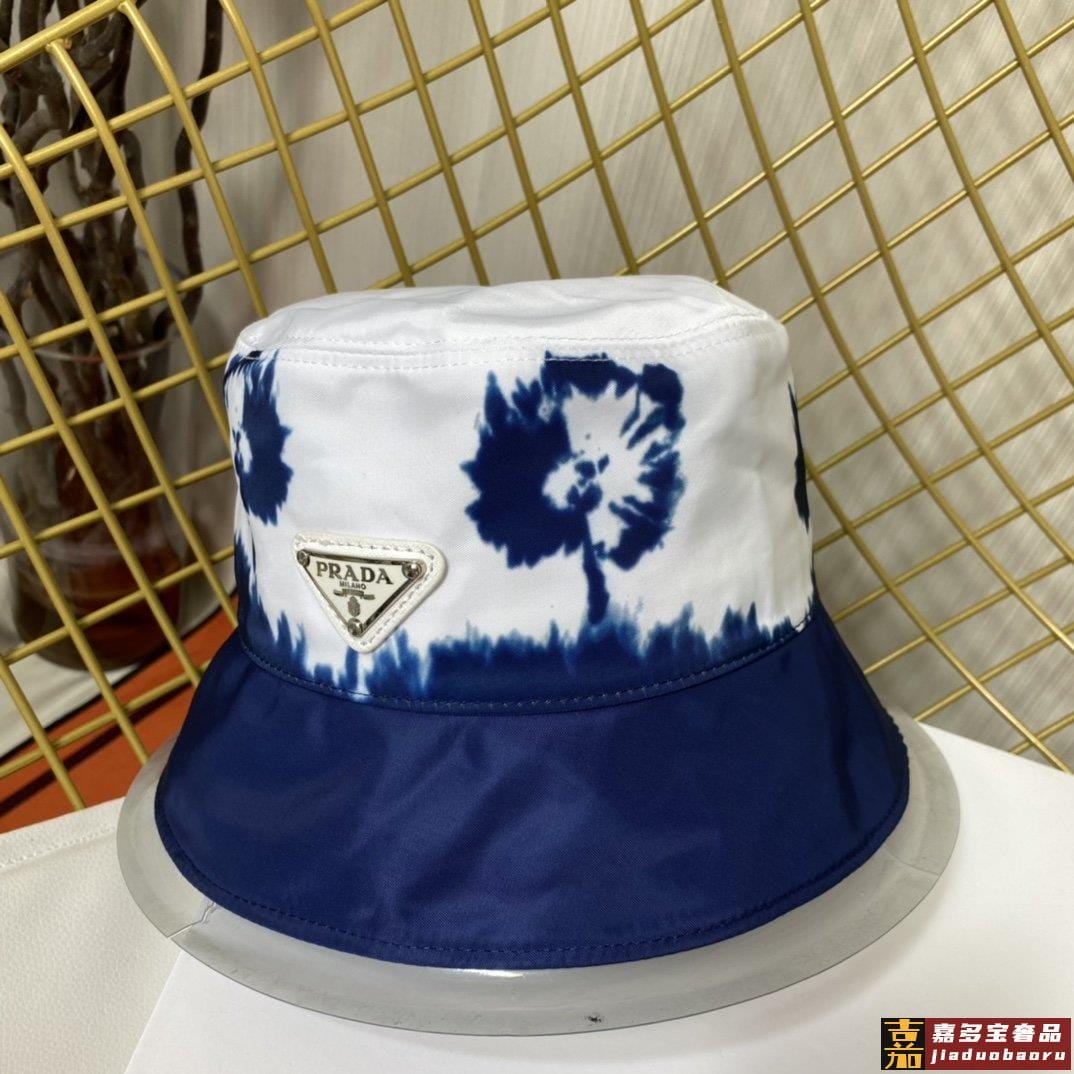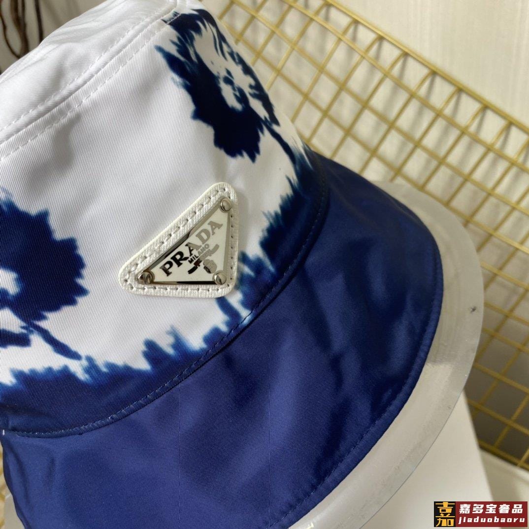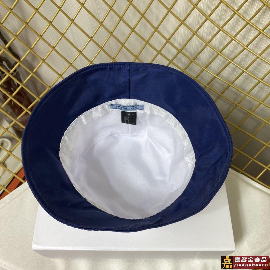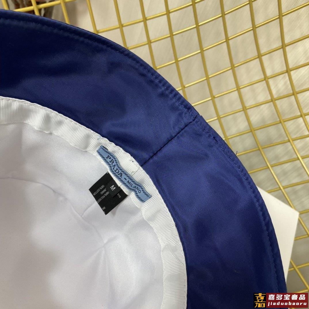 普拉达新款印花字母织带帆布渔夫帽这款海军蓝色茹伊印花桶帽突显