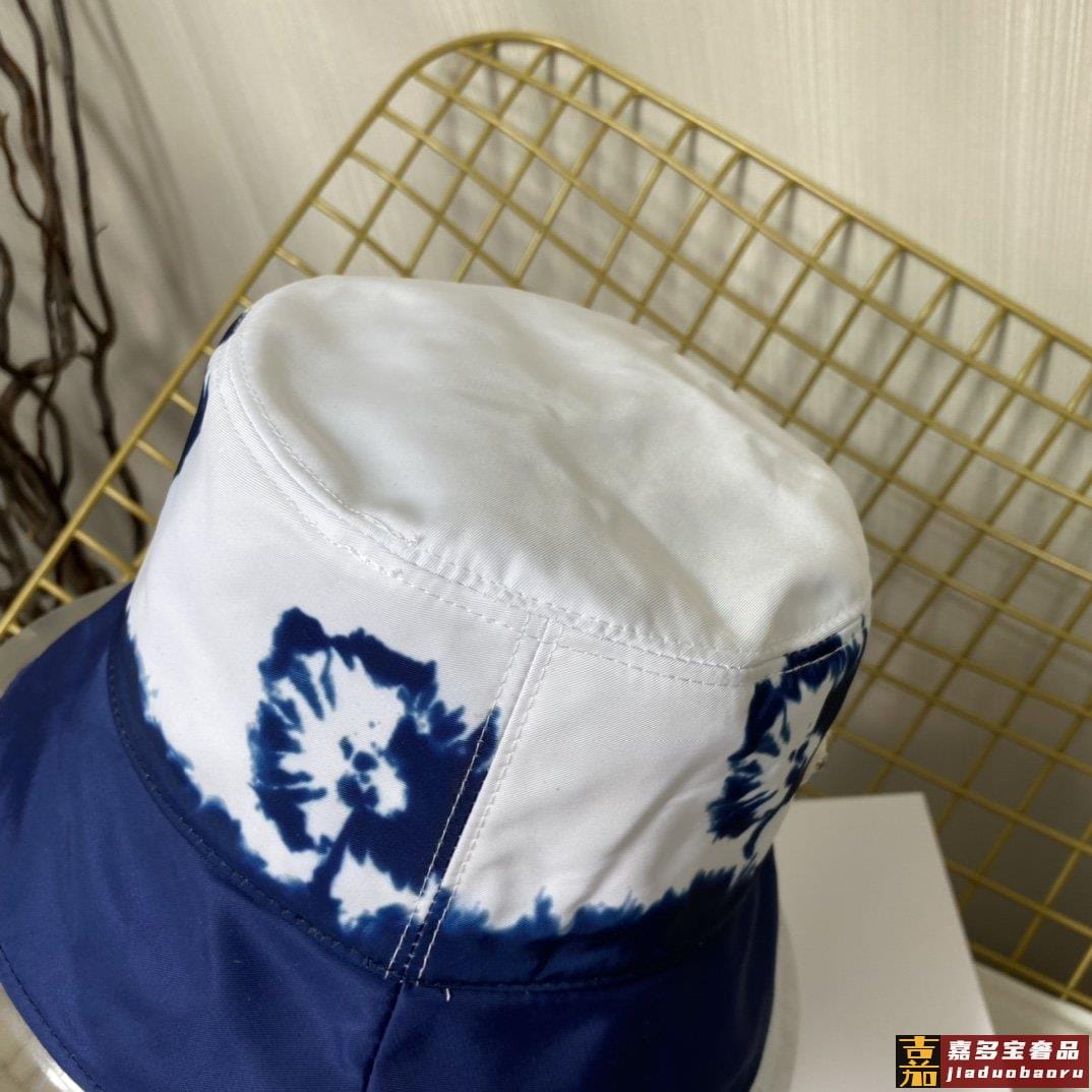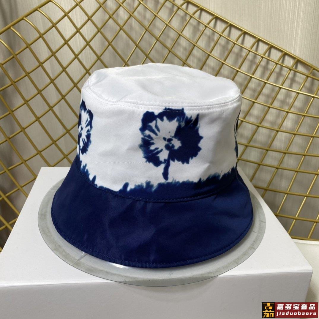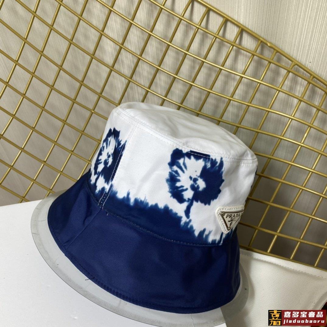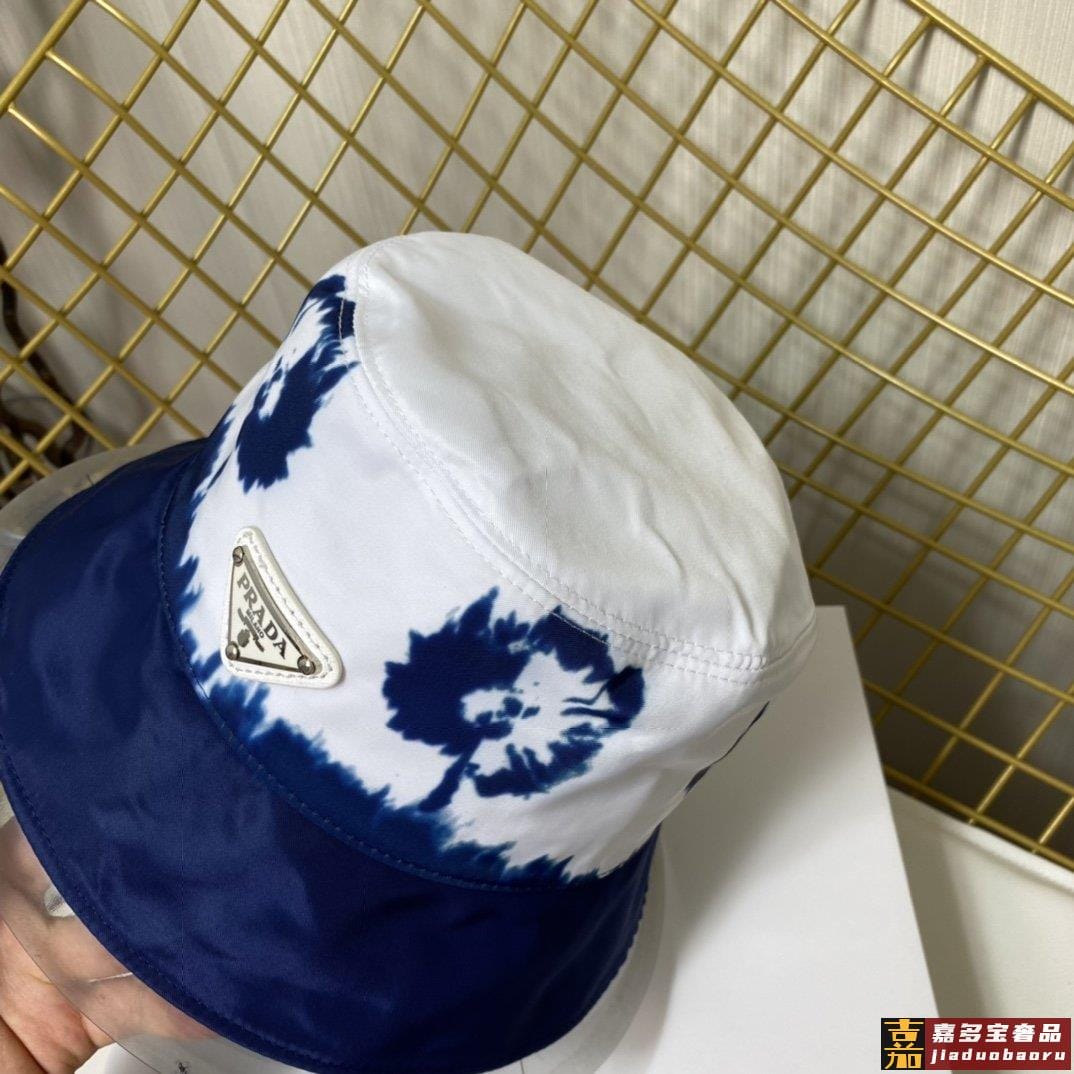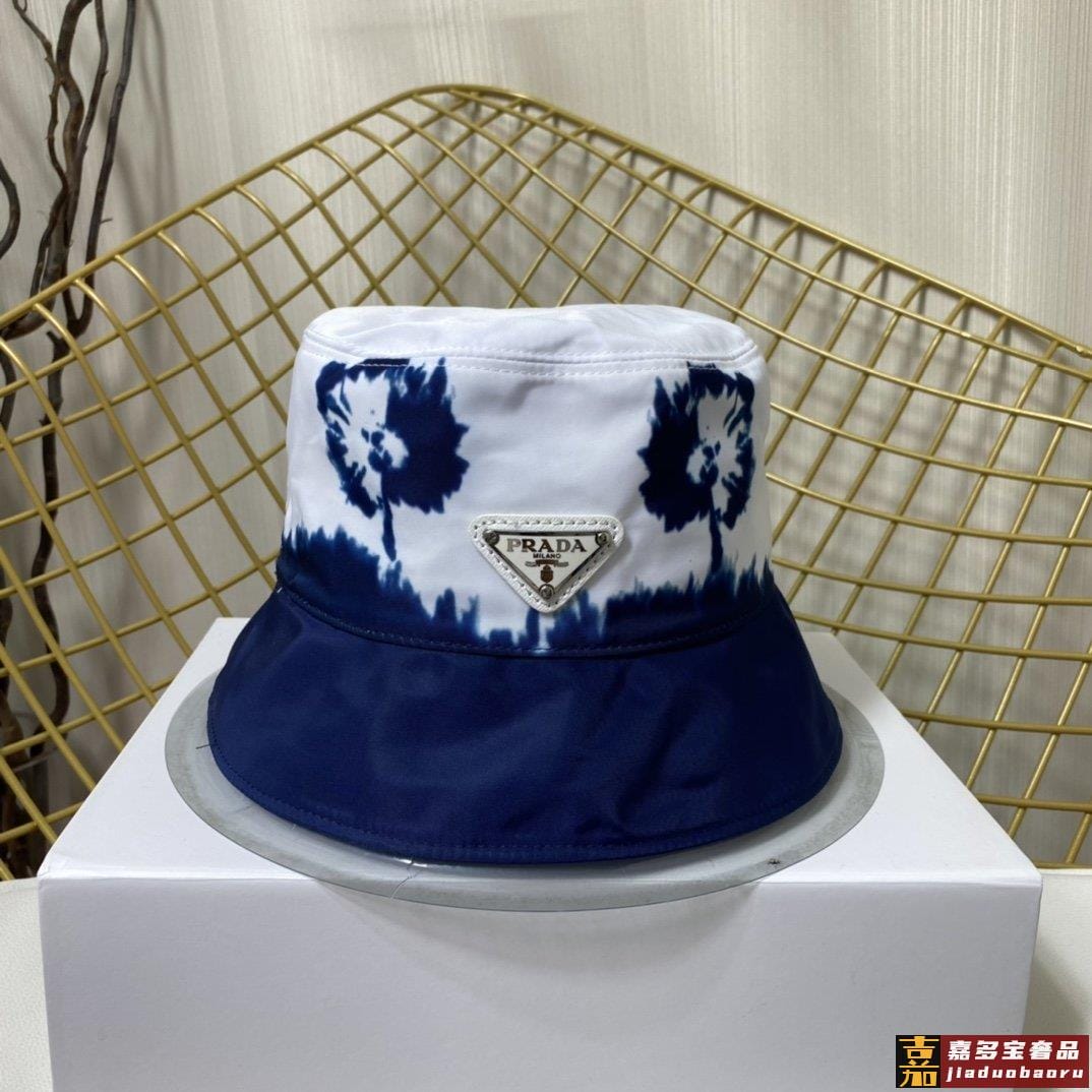 普拉达新款印花字母织带帆布渔夫帽这款海军蓝色茹伊印花桶帽突显