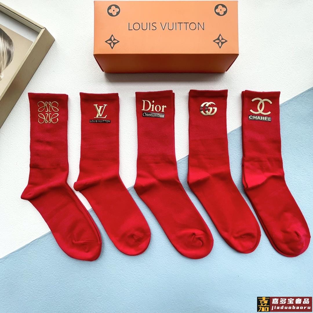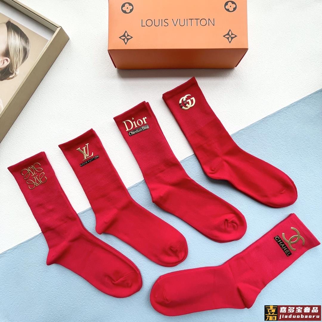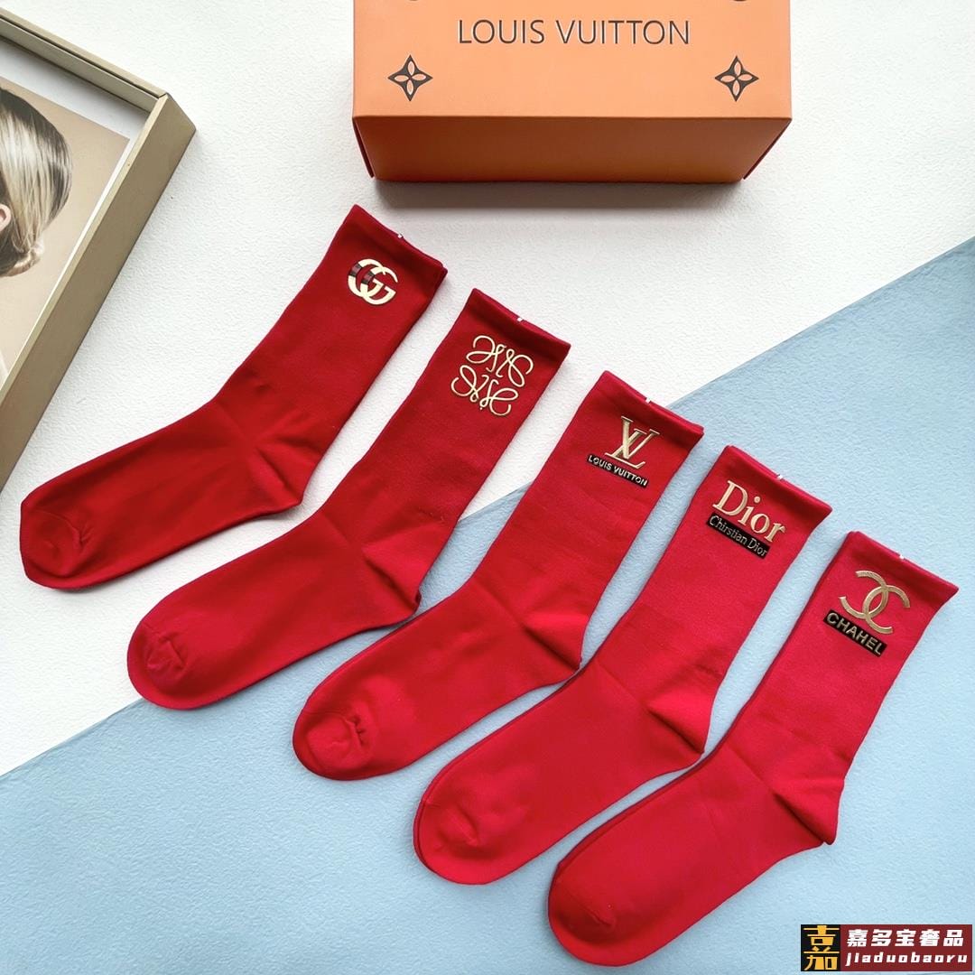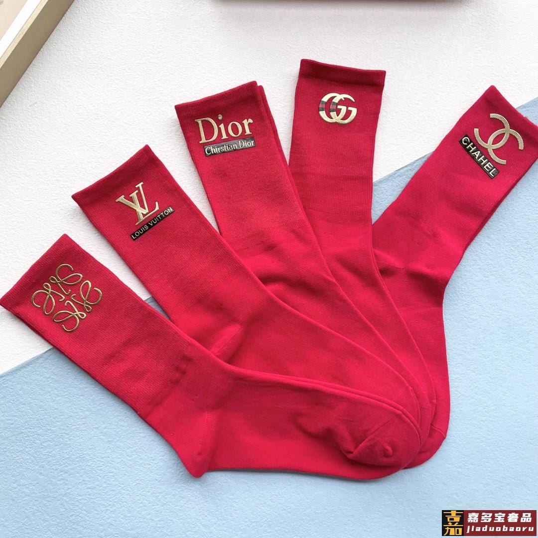 配包装一盒五双红红火火大红袜欧美大牌新款经典中长款烫金堆堆袜