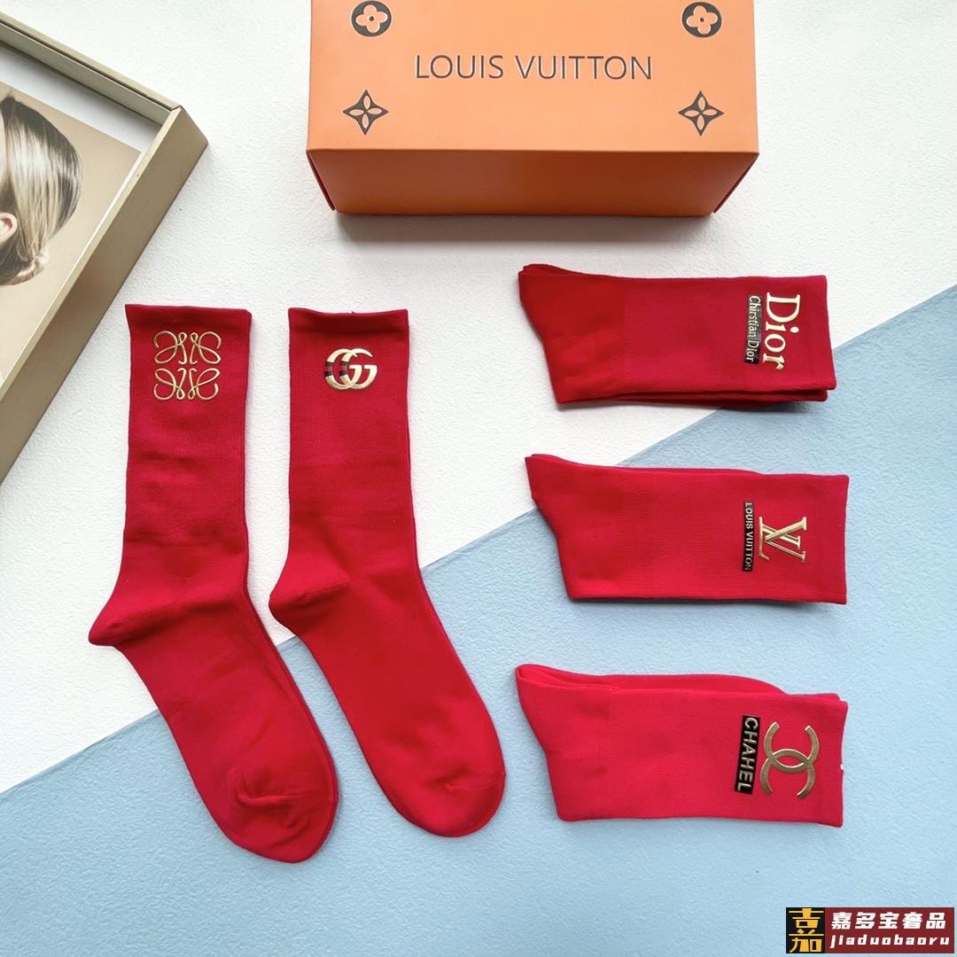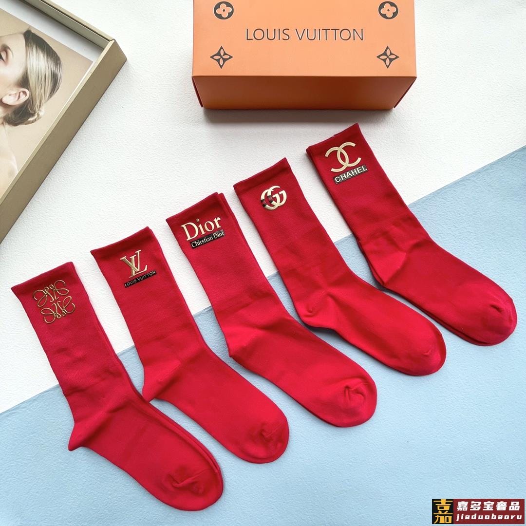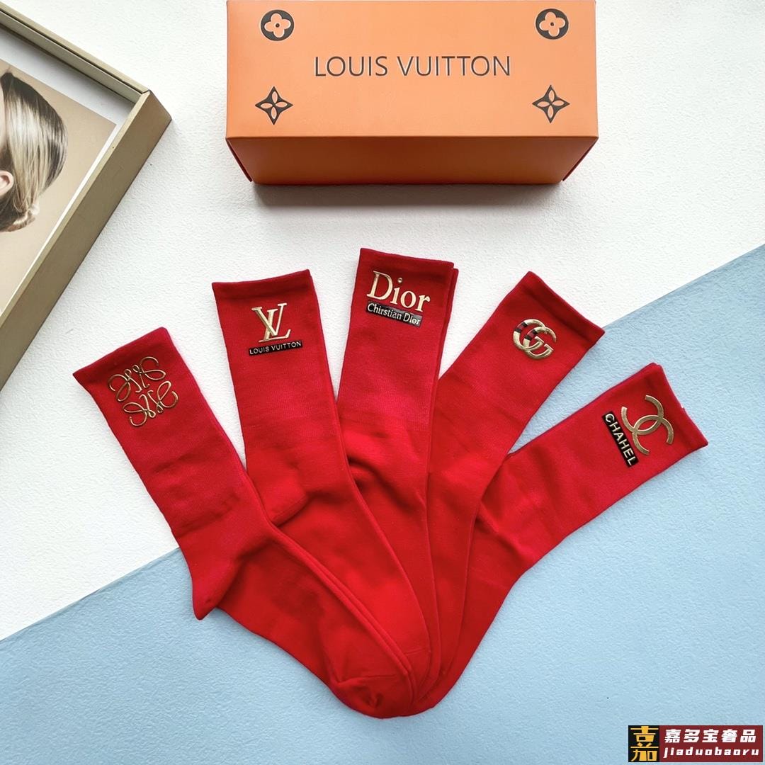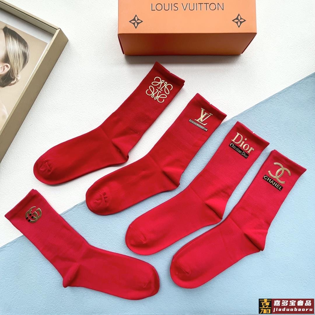 配包装一盒五双红红火火大红袜欧美大牌新款经典中长款烫金堆堆袜