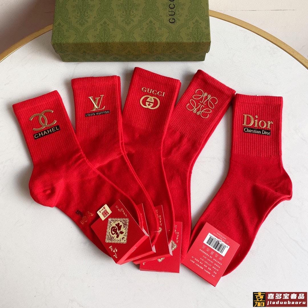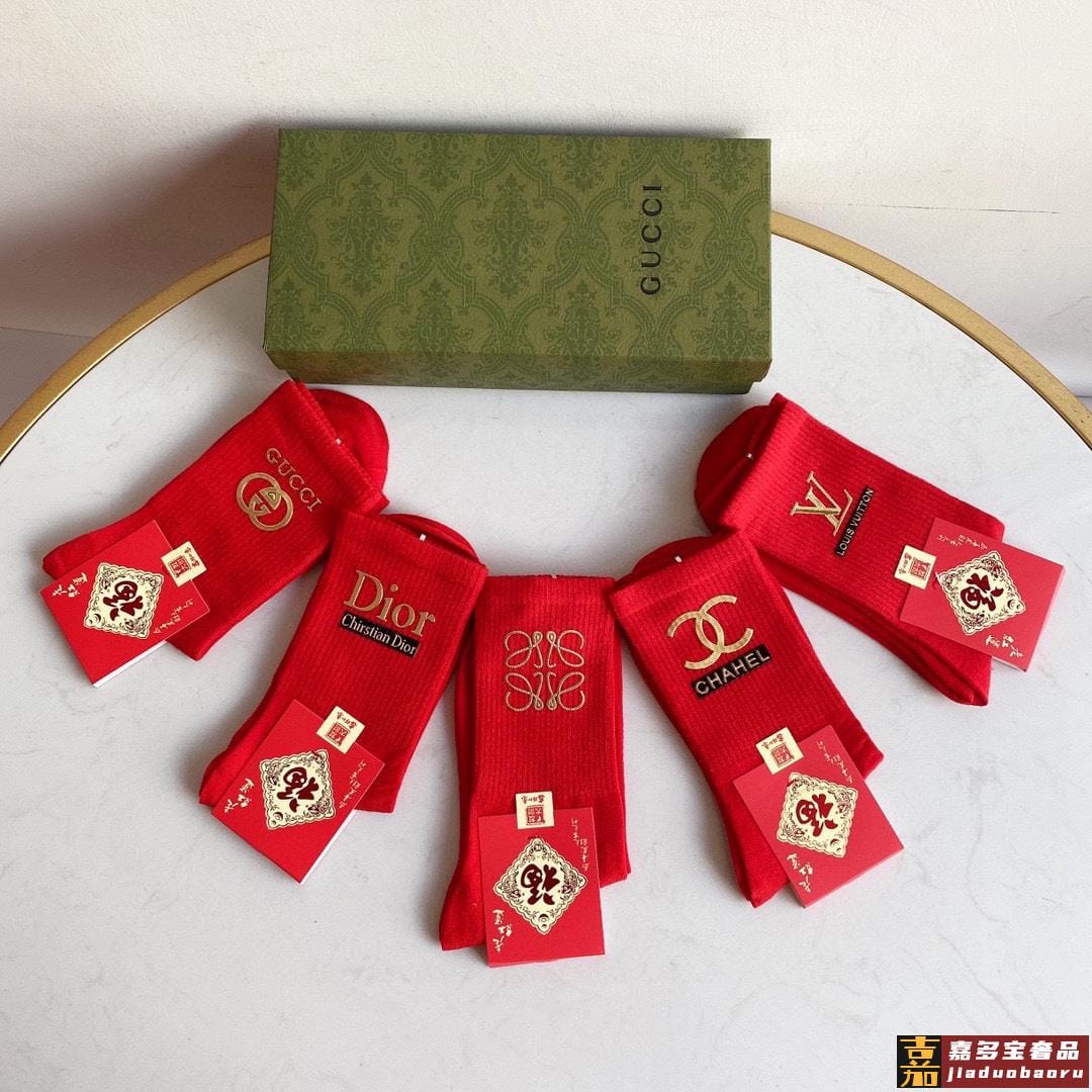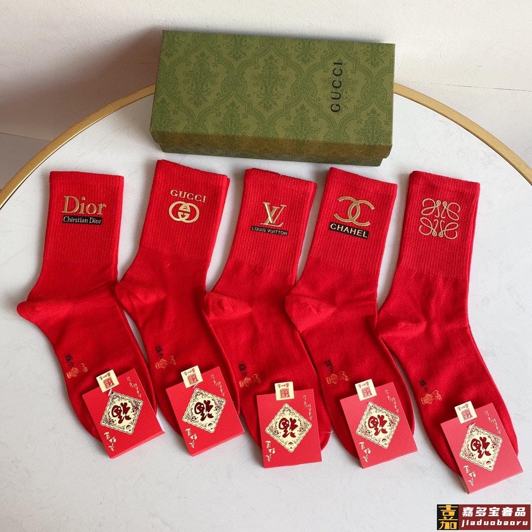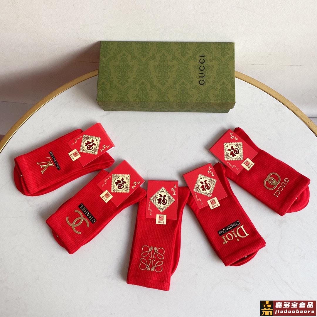 特配包装红红火火大红袜古驰新款经典中长款刺绣堆堆袜袜子一盒五