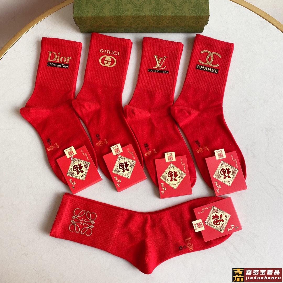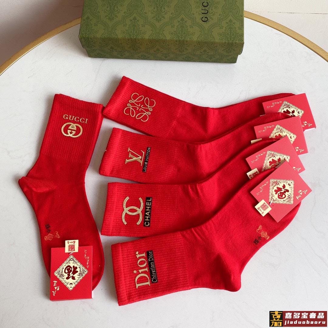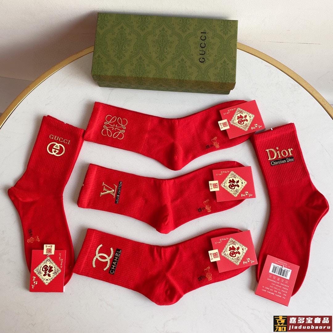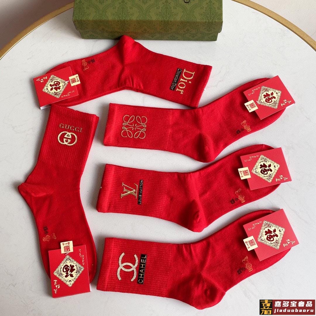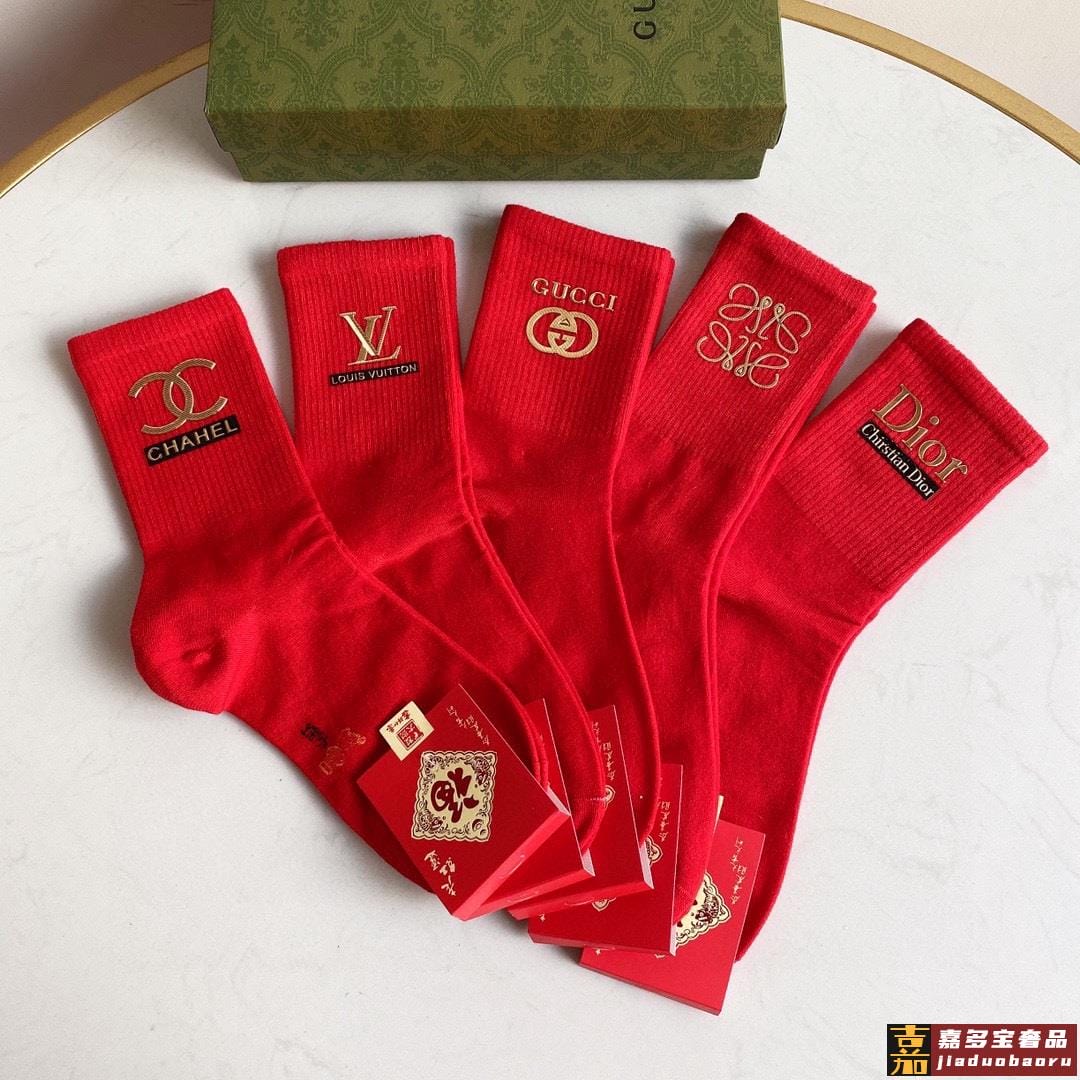 特配包装红红火火大红袜古驰新款经典中长款刺绣堆堆袜袜子一盒五