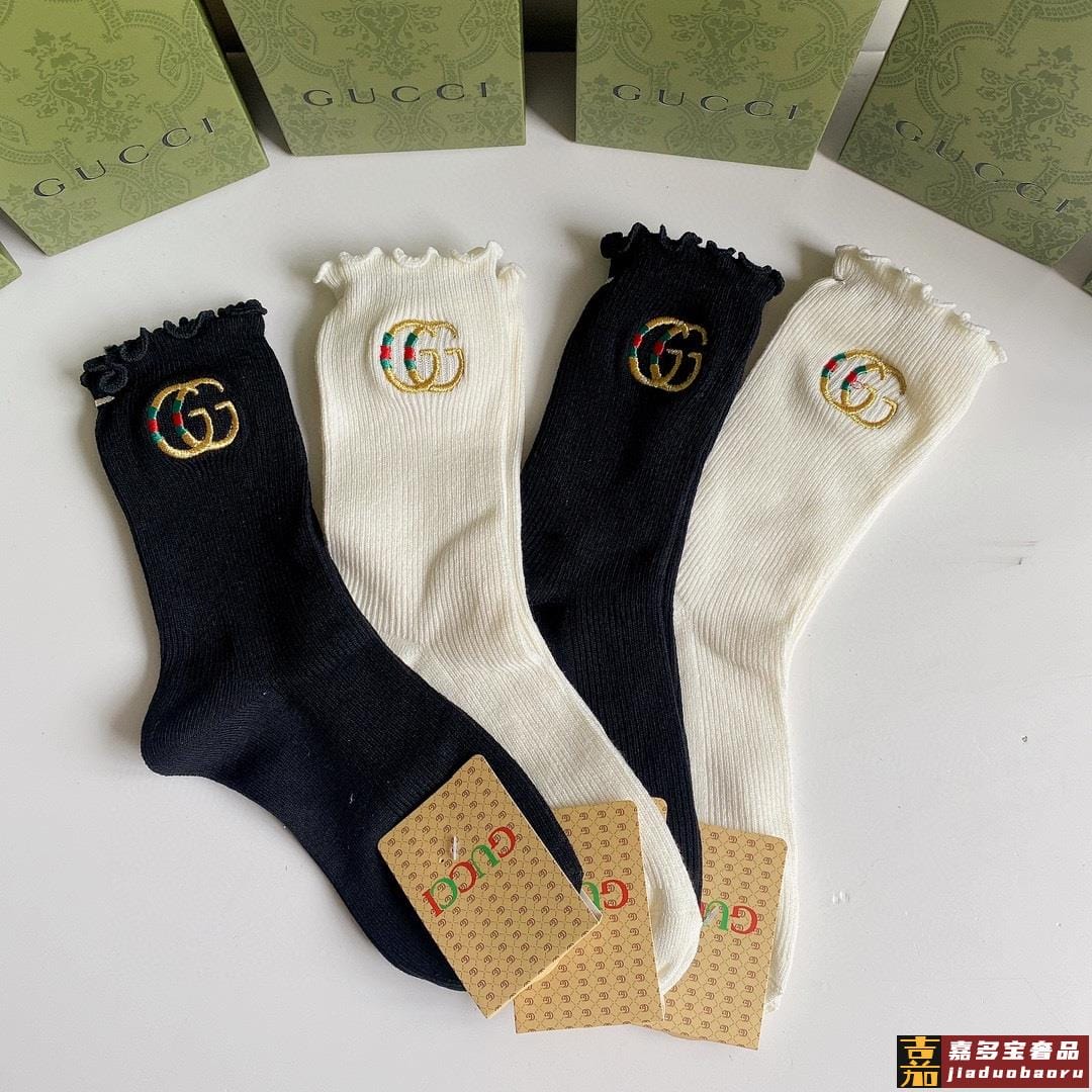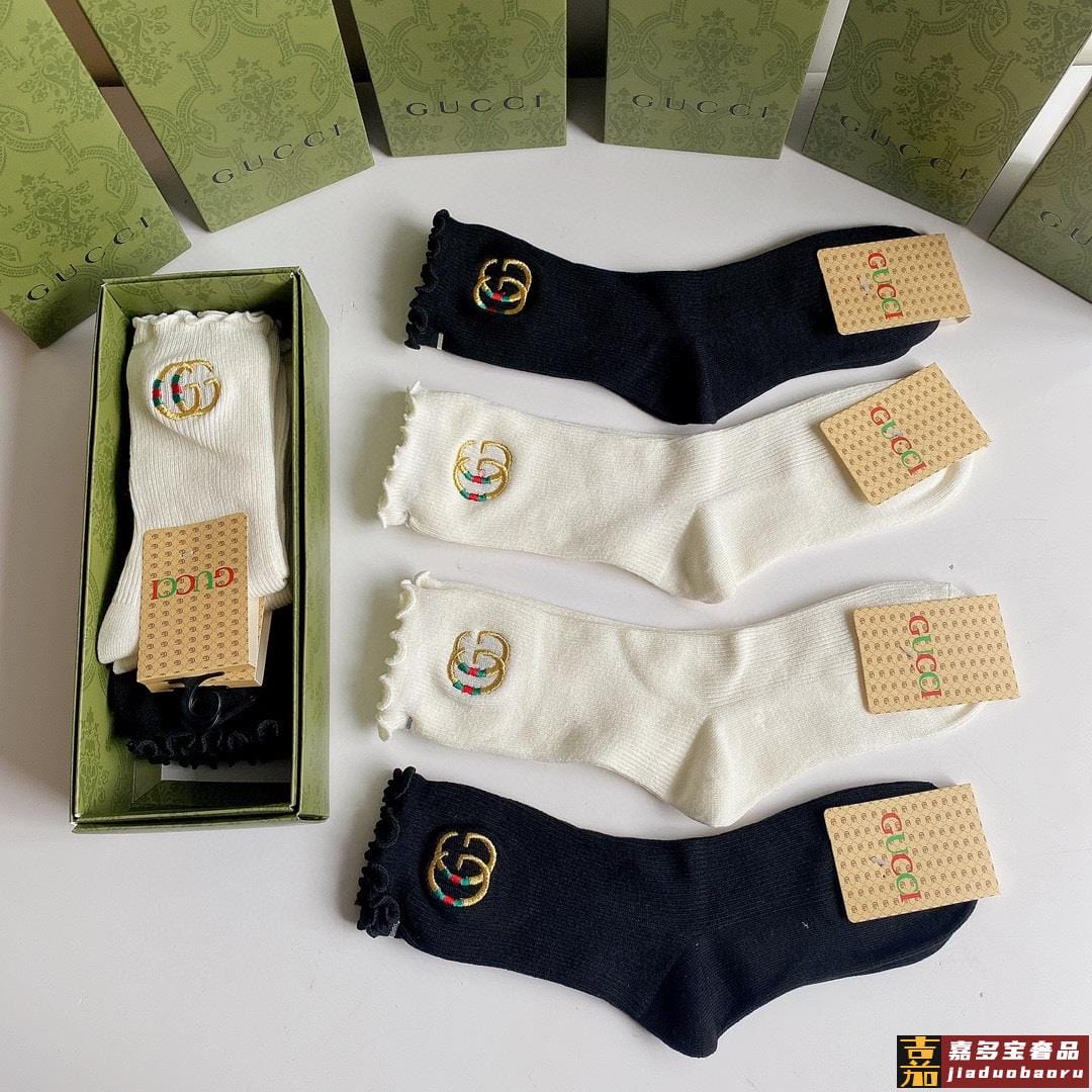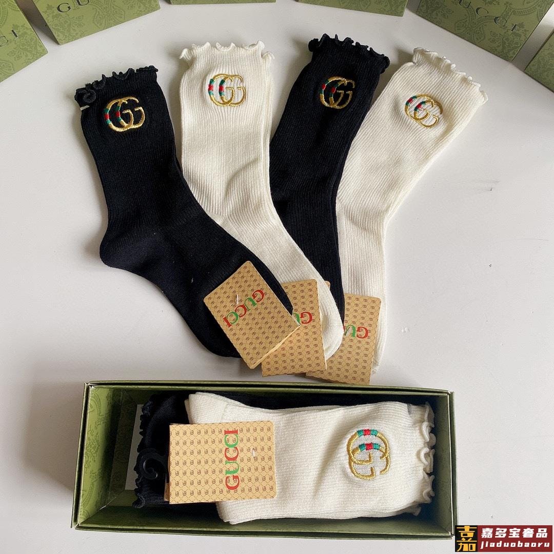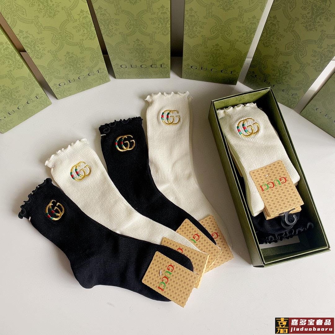 特配专柜包装古驰新款中长款刺绣毛边堆堆袜袜子一盒四双专柜同步