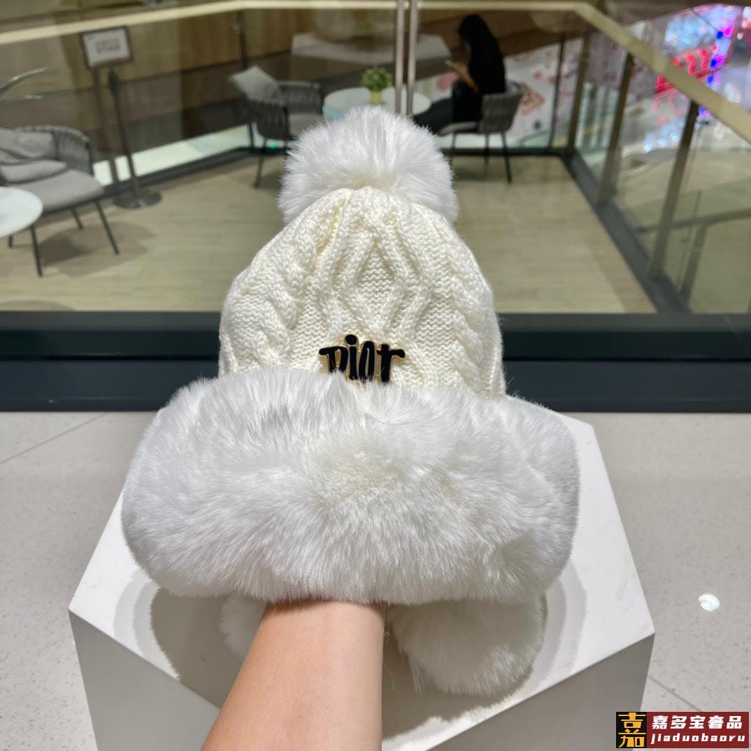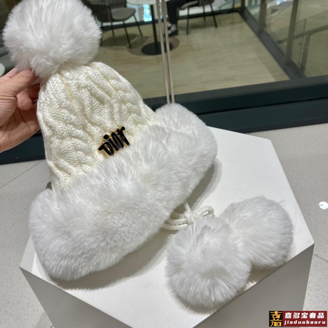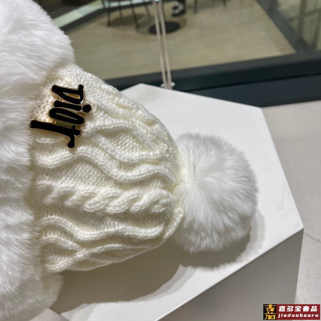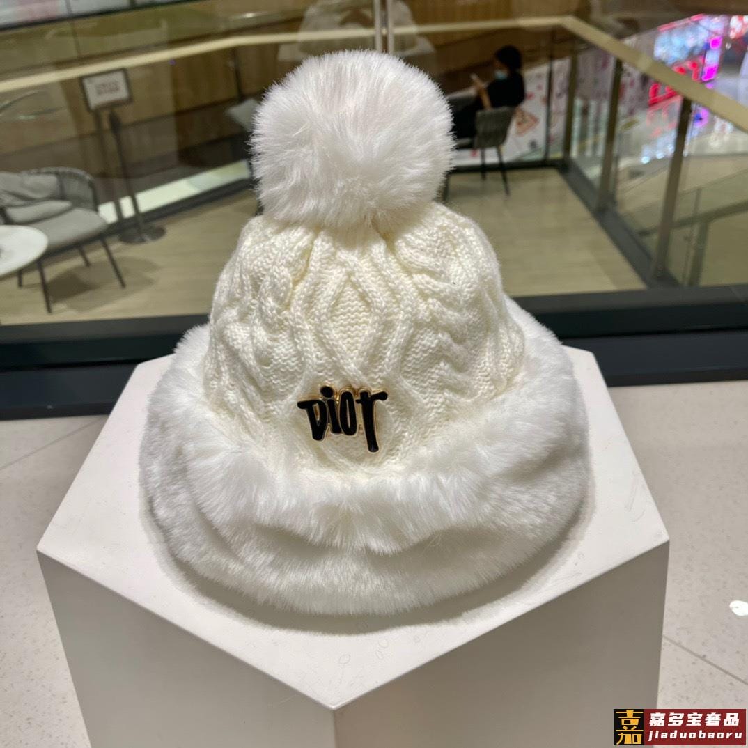 迪奥秋冬新款法国定毛毛球毛线帽秋冬保暖加绒加厚潮针织毛线帽高