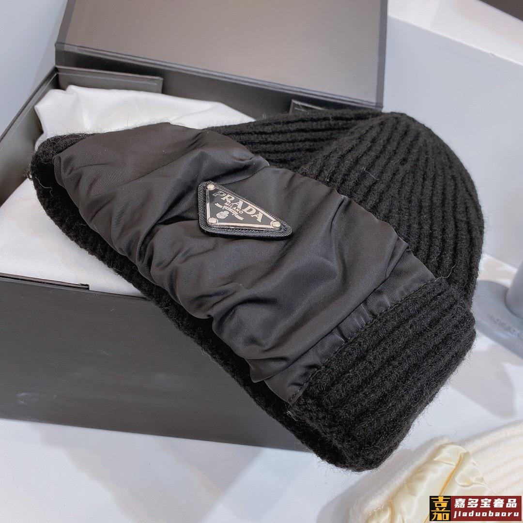 普拉达新款北极绒拼接缎面针织毛线帽专柜同步针织帽缎面拼接超显