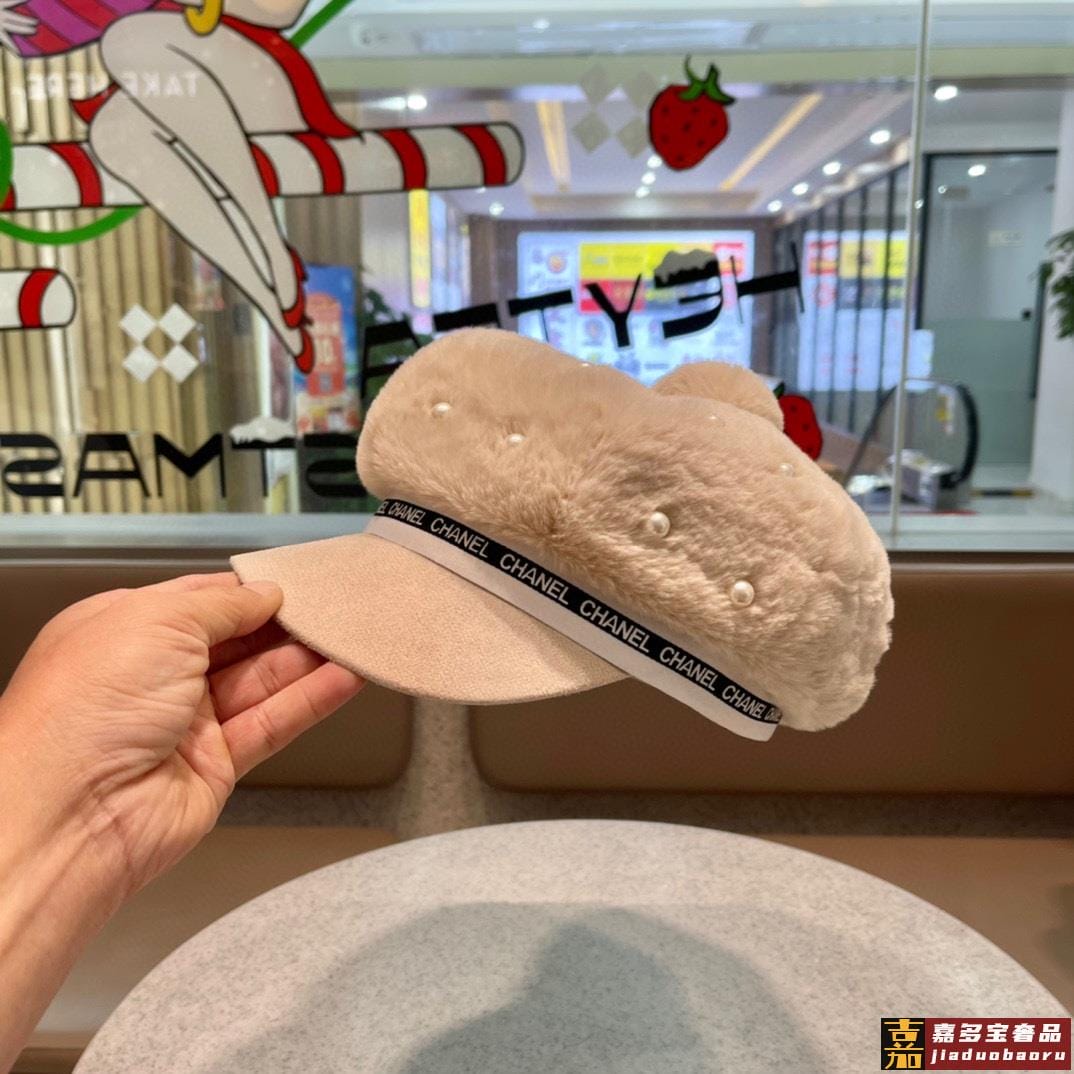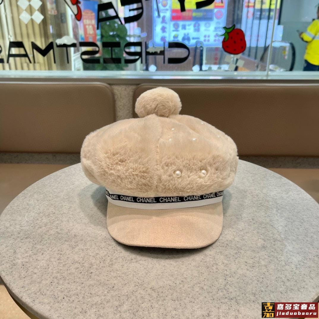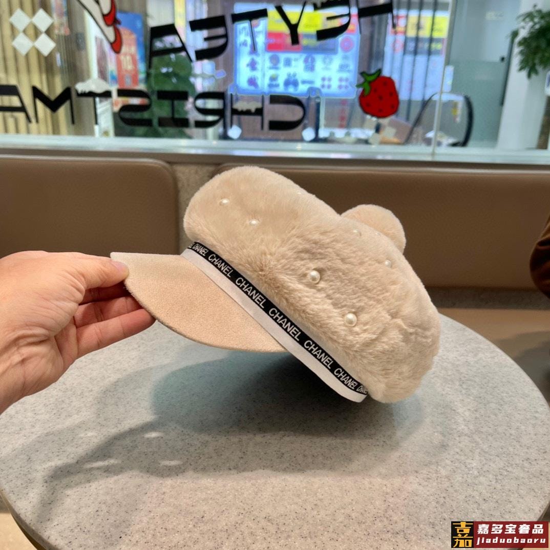 香奈儿秋冬新款羊绒毛优雅珍珠网红八角帽军帽韩版百搭毛绒保暖大