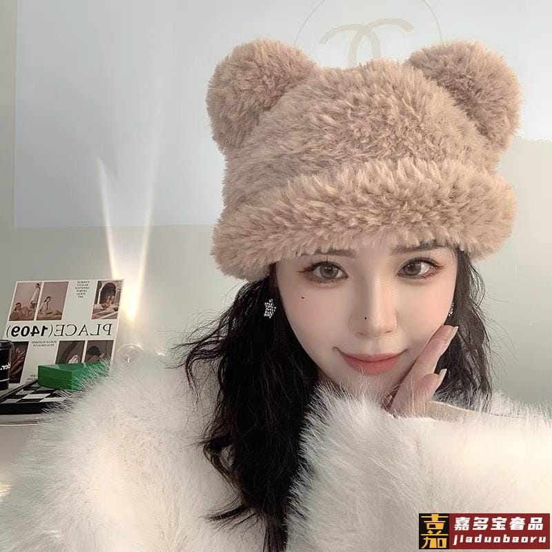 香奈儿年秋冬潮可爱毛毛小熊保暖套头帽子女网红护耳防寒针织毛线