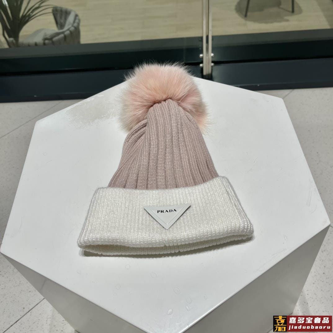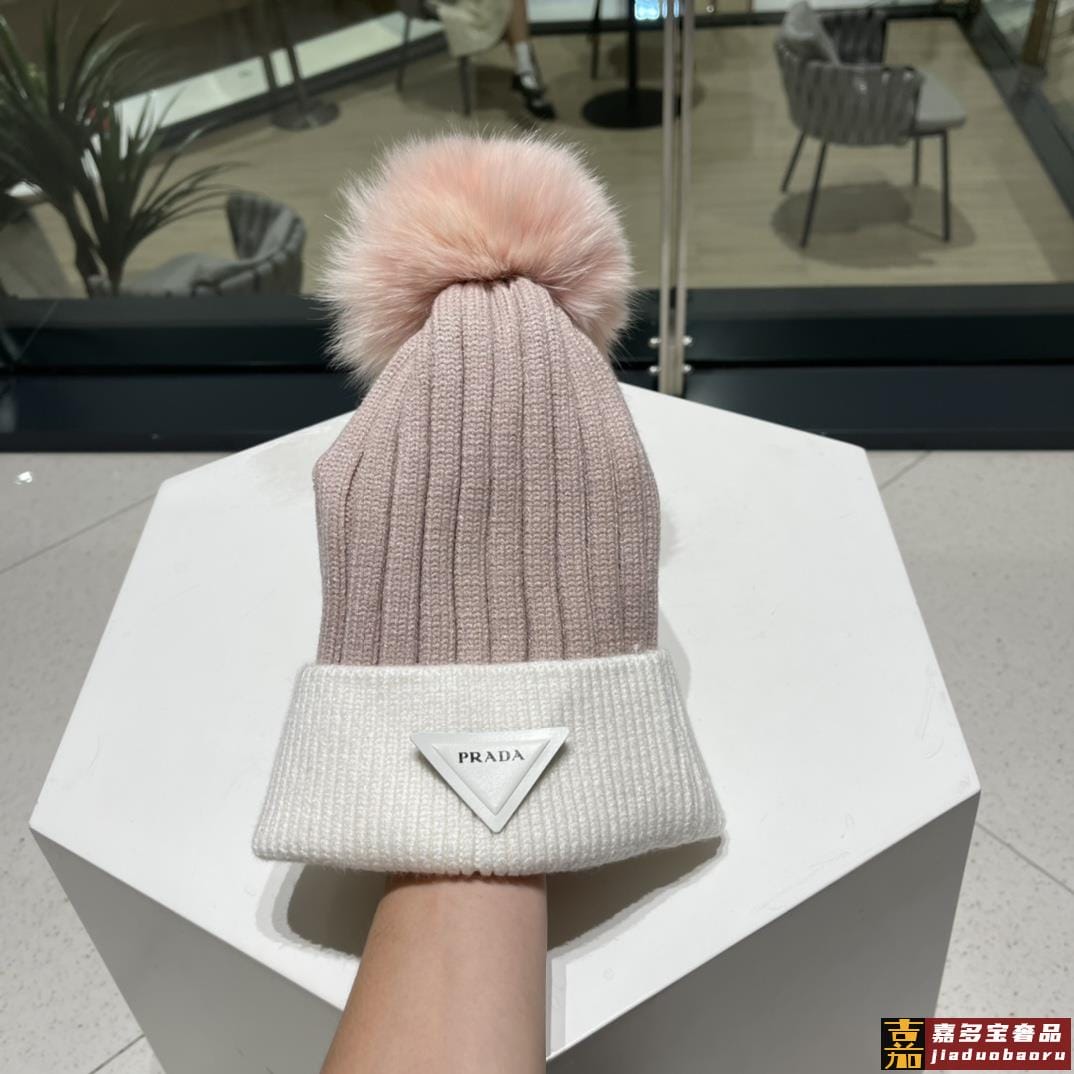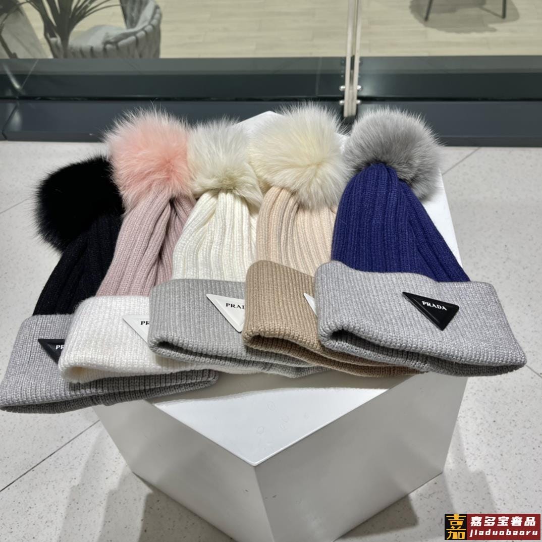 普拉达秋冬配狐狸毛球专柜针织毛线帽超火爆质感一流出街超好搭配