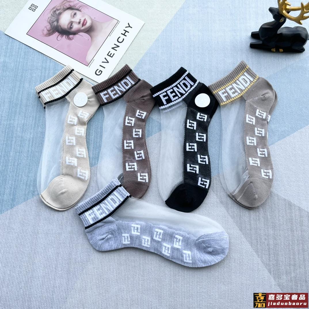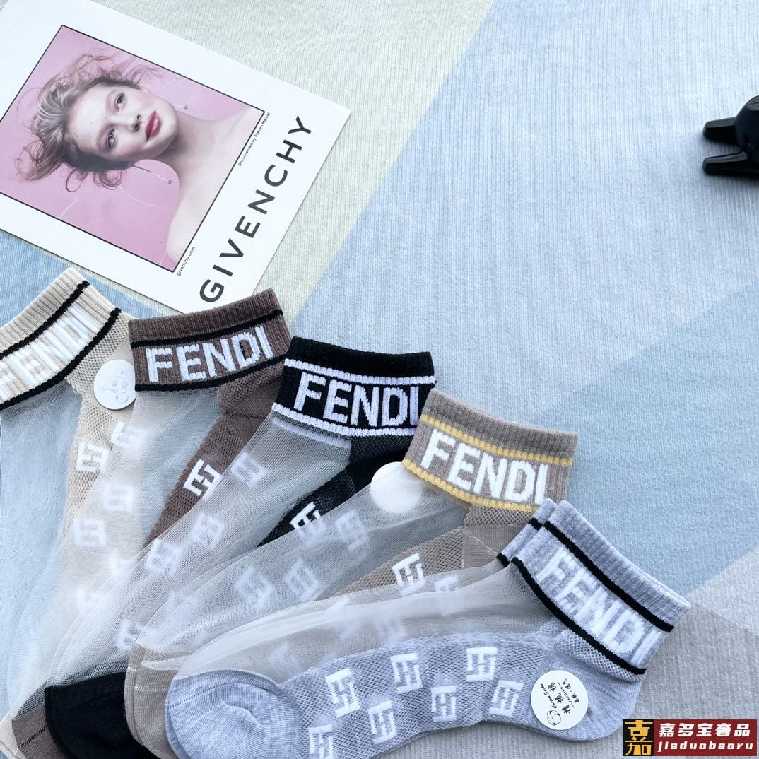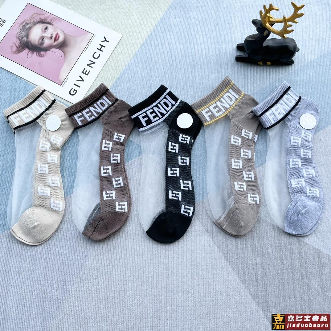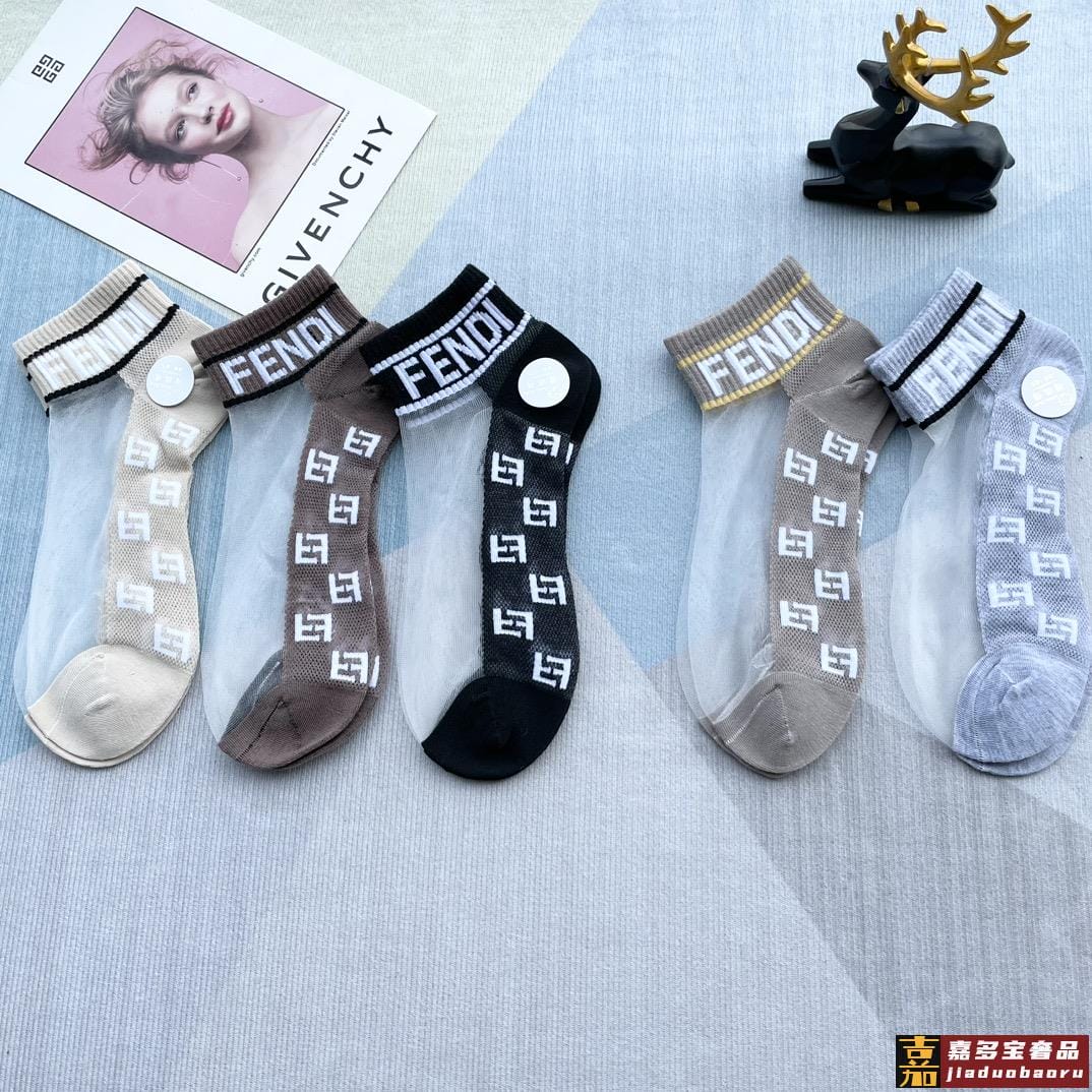 配包装一盒五双欧美大牌芬迪新款短款冰丝袜子冰丝加棉镂空经典标