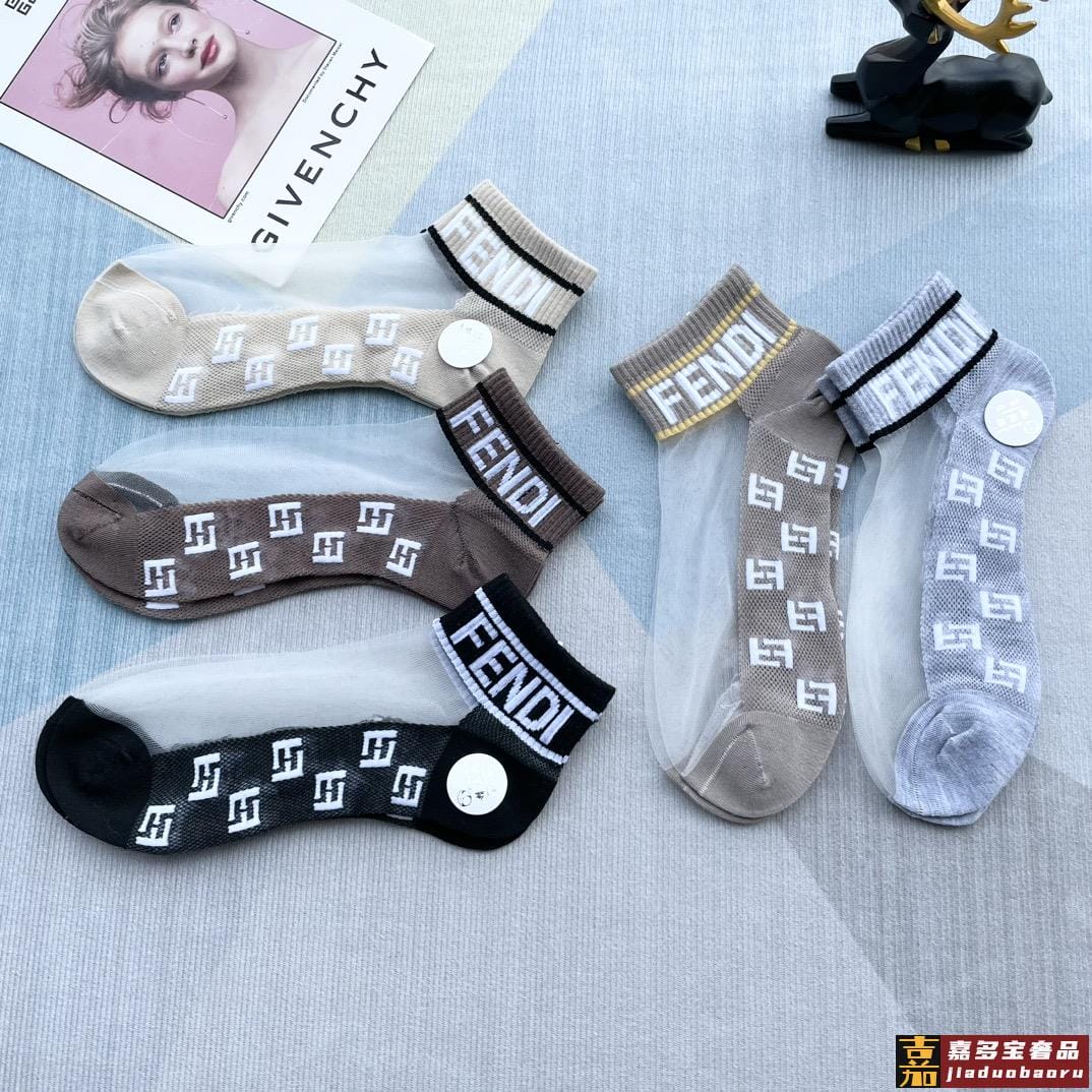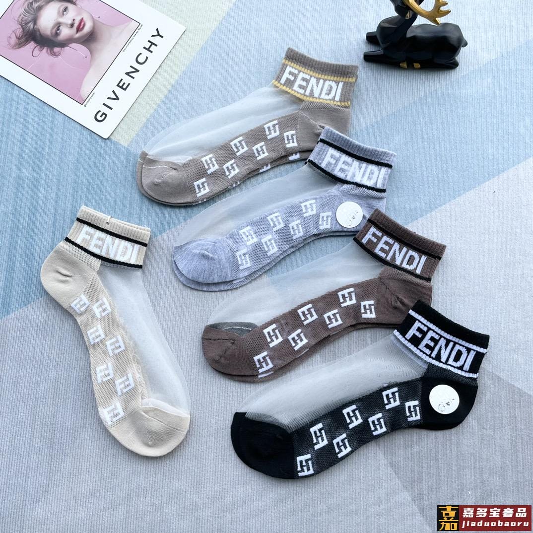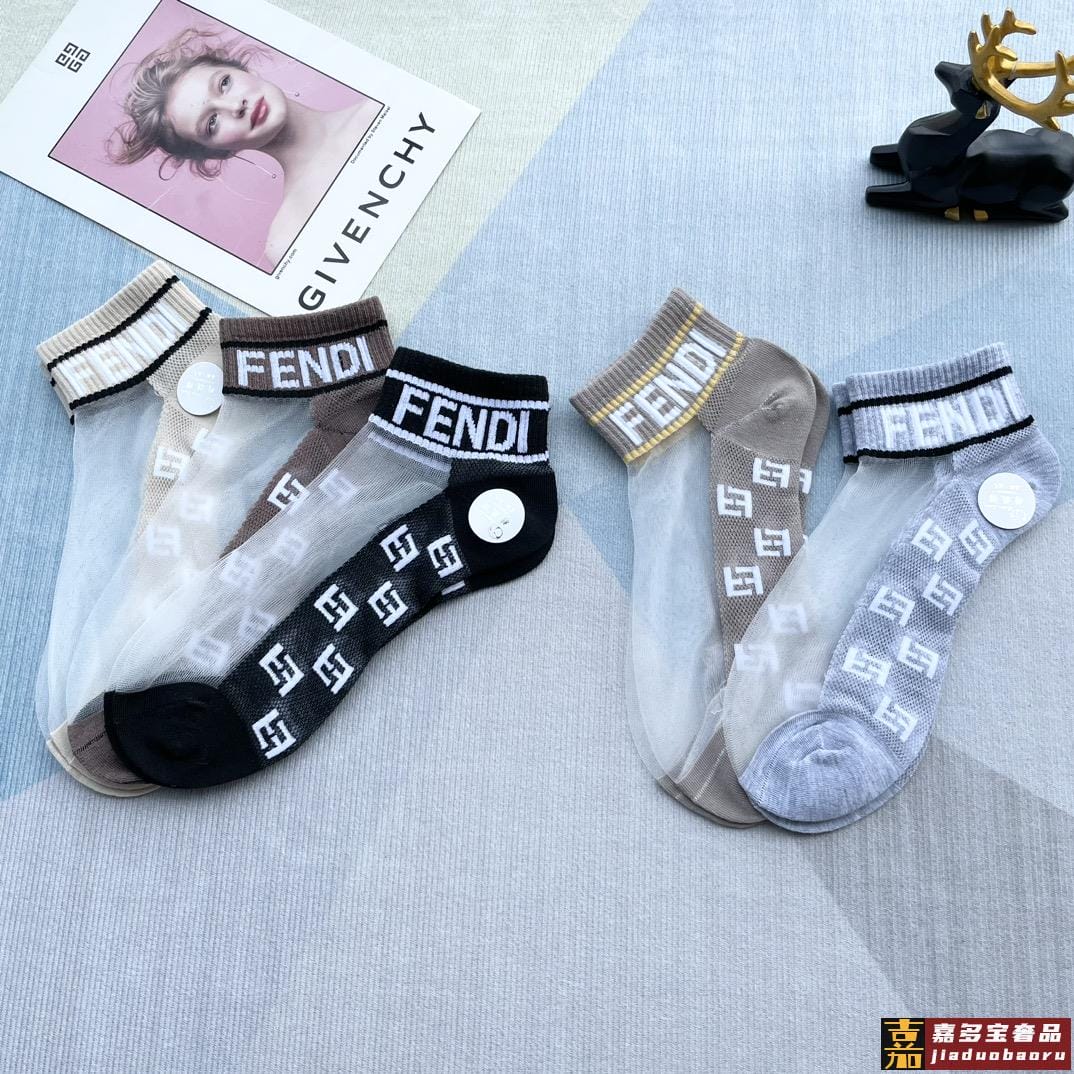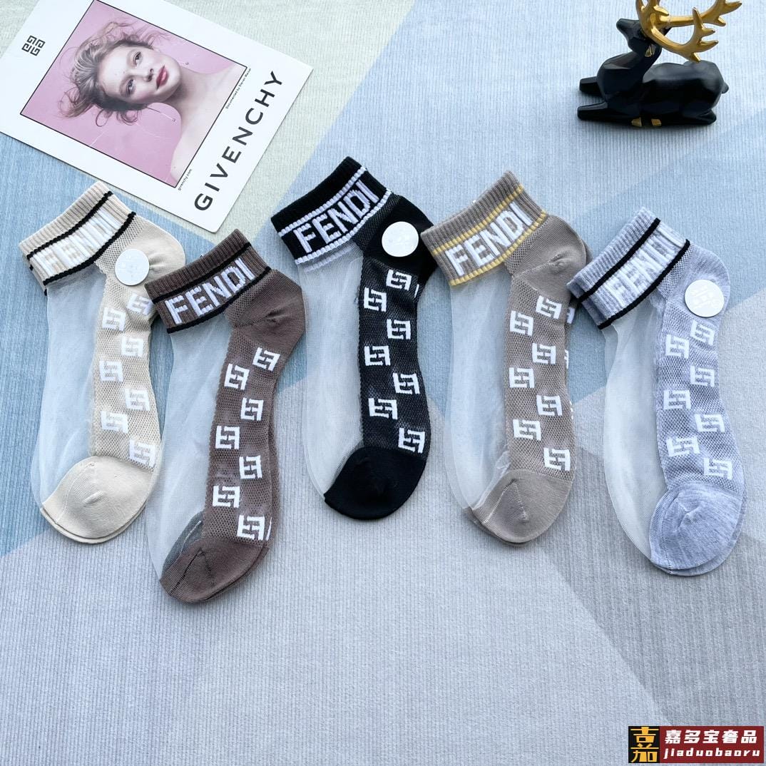 配包装一盒五双欧美大牌芬迪新款短款冰丝袜子冰丝加棉镂空经典标