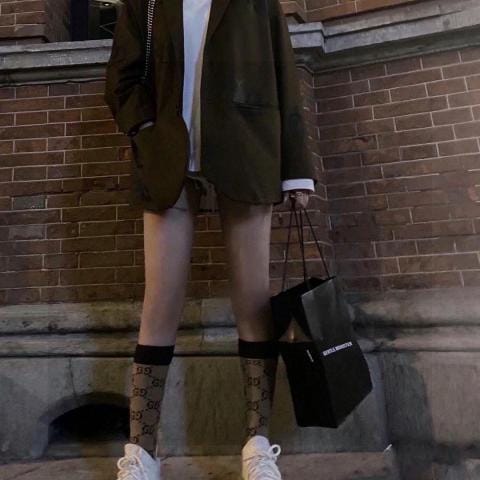古奇网眼镂空字母菱形格欧美走秀小腿袜复古网红潮牌女