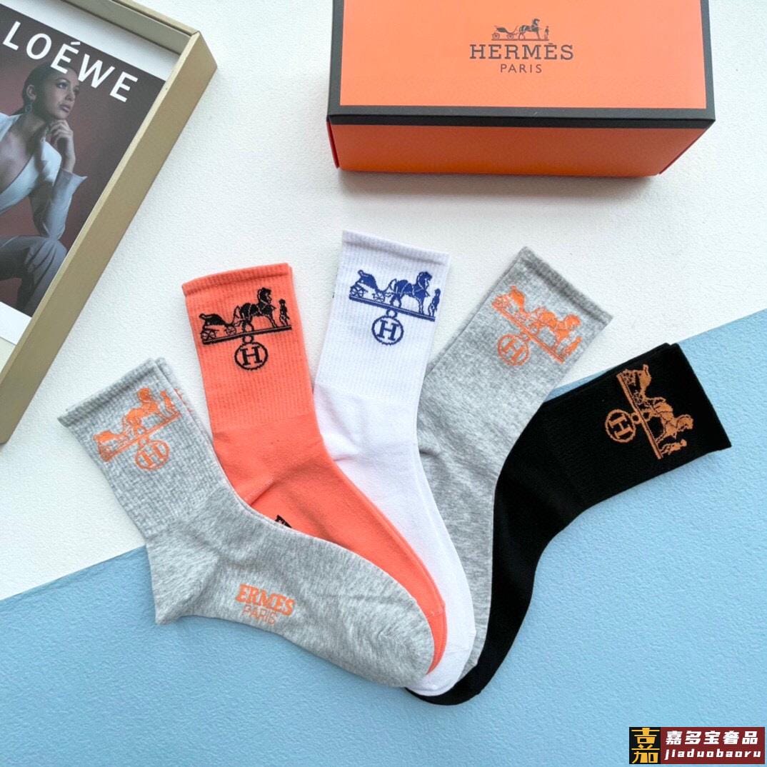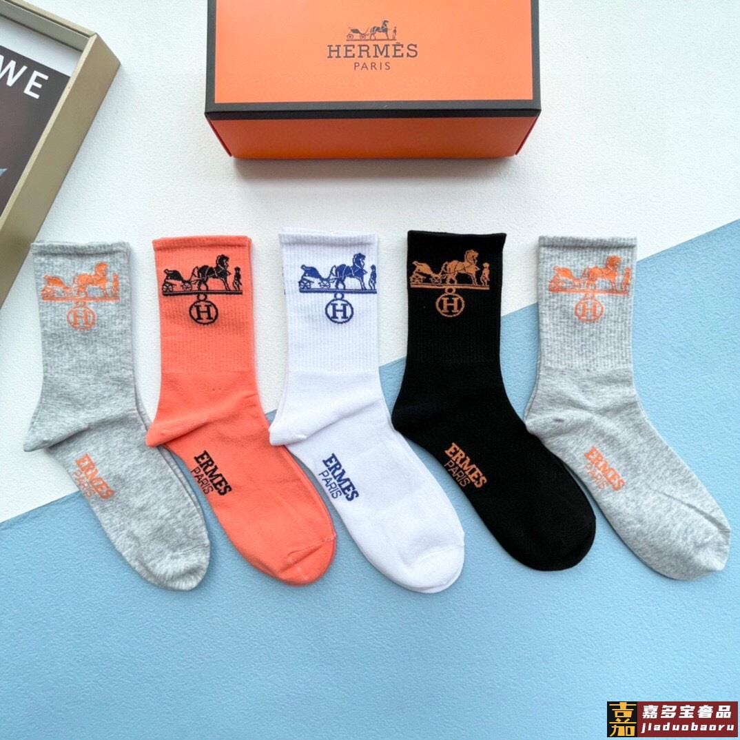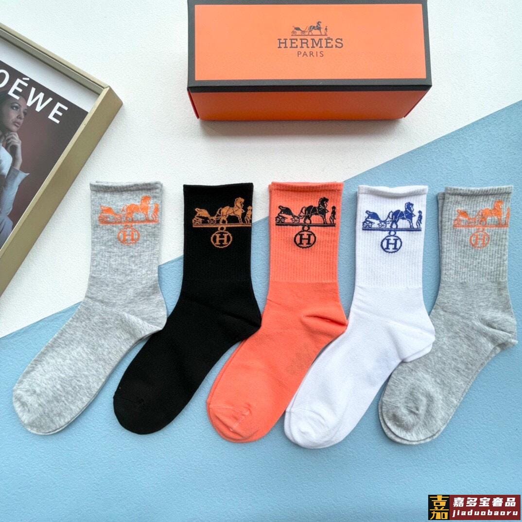 配包装一盒五双爱马仕经典中筒袜子纯棉面料专柜同步上新袜身提花