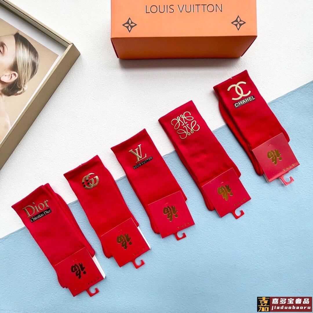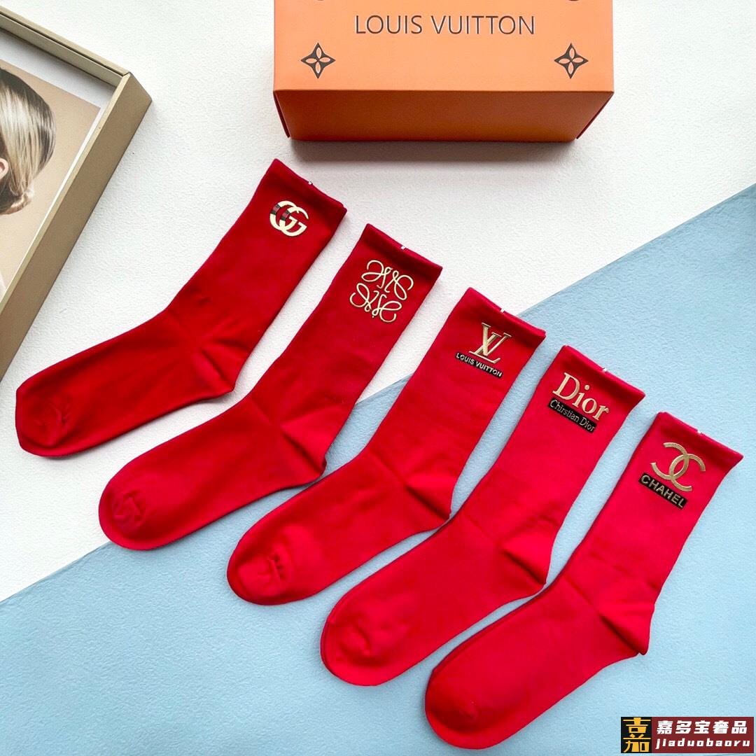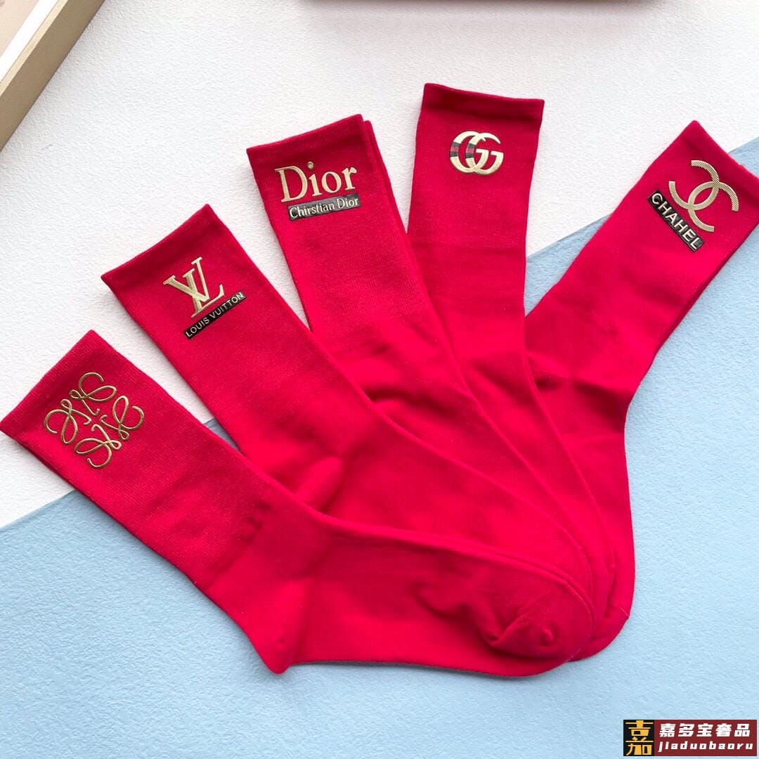 配包装一盒五双香奈儿红红火火过年袜官网同款字母烫金中长款袜子