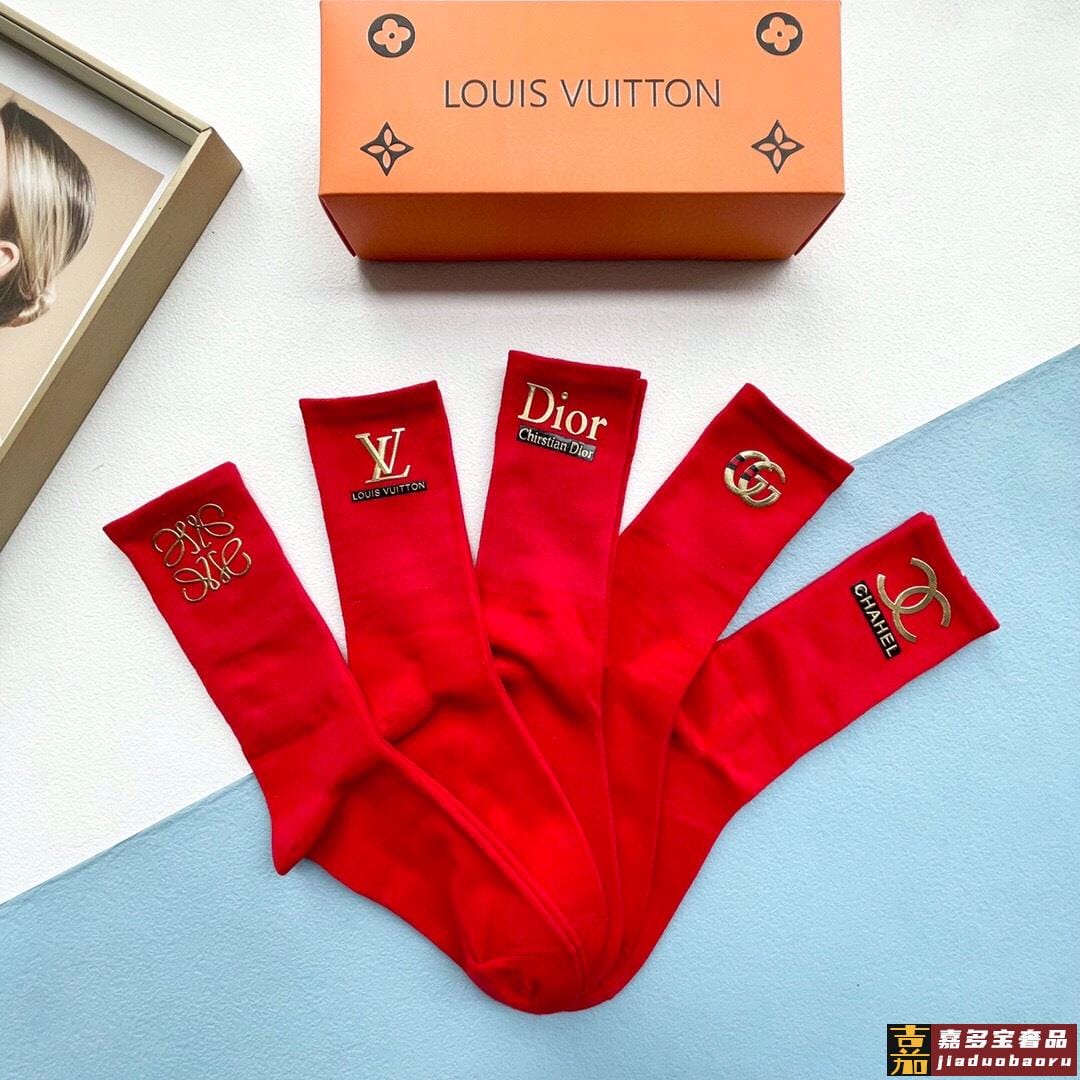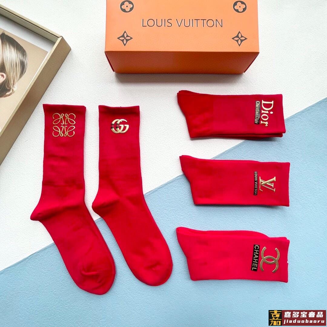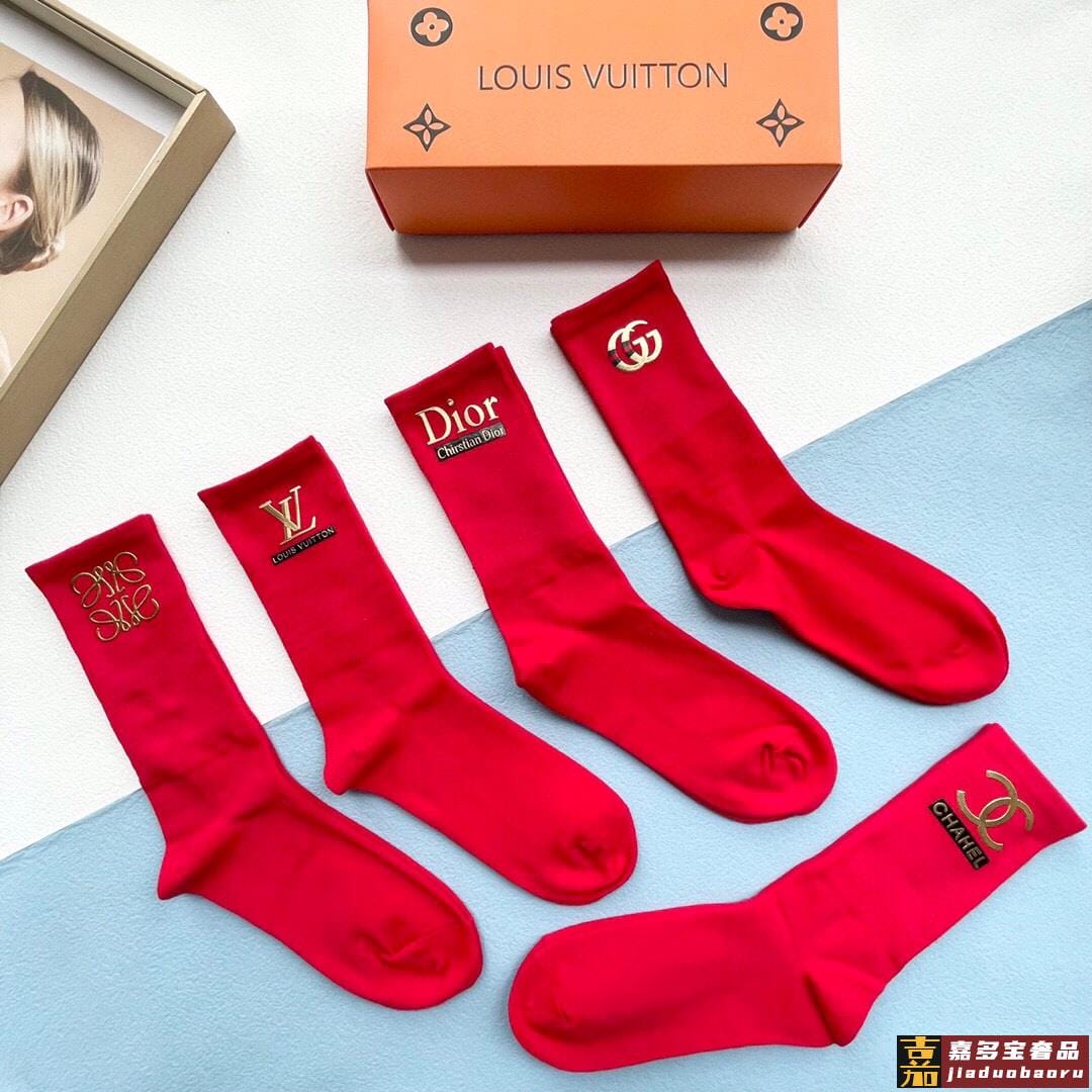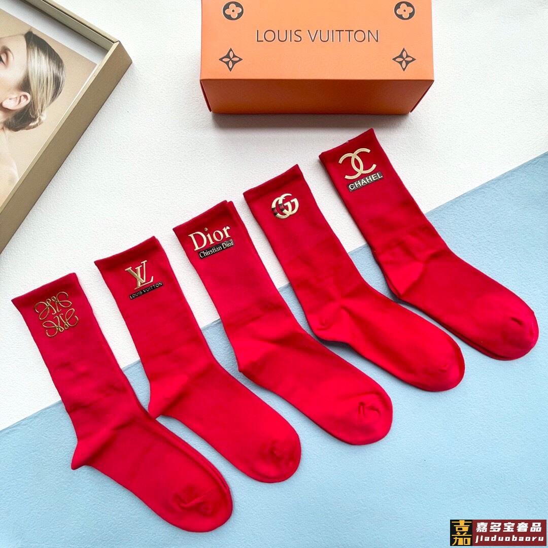 配包装一盒五双香奈儿红红火火过年袜官网同款字母烫金中长款袜子